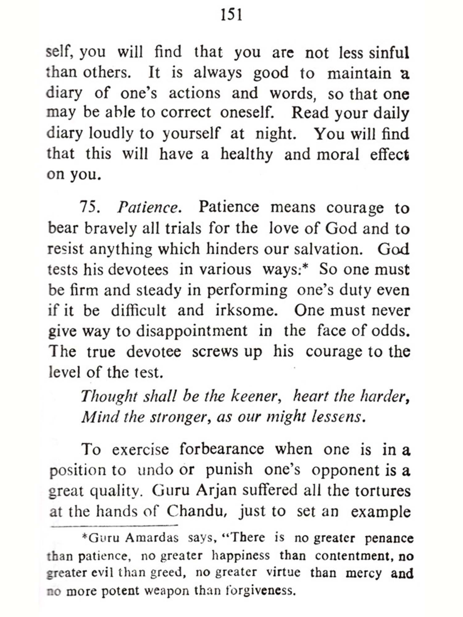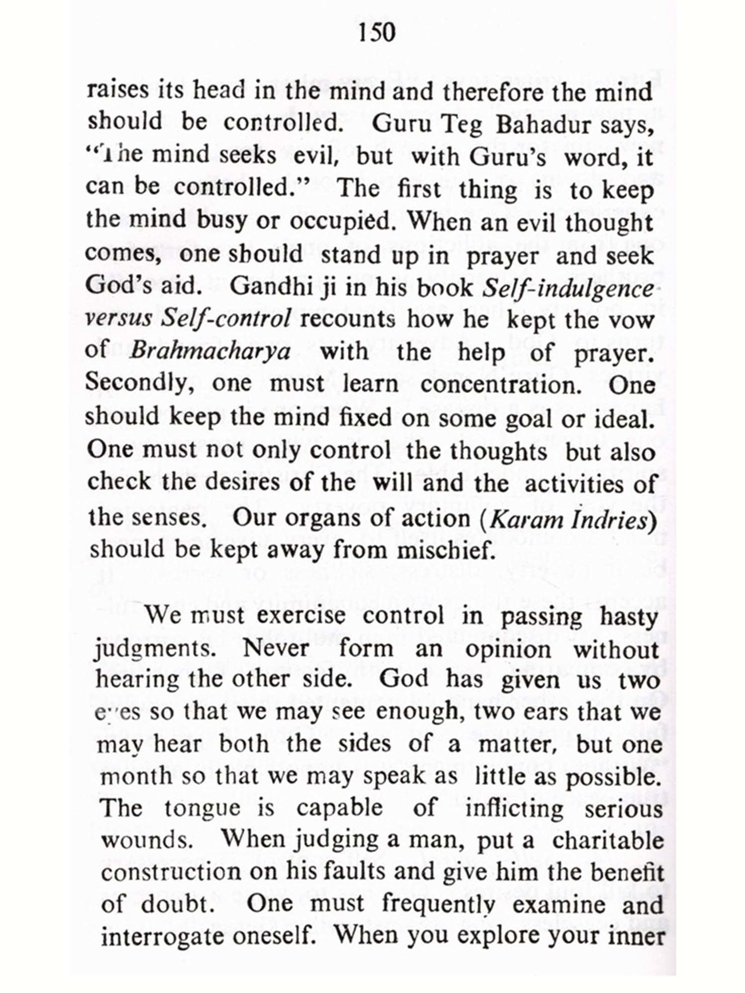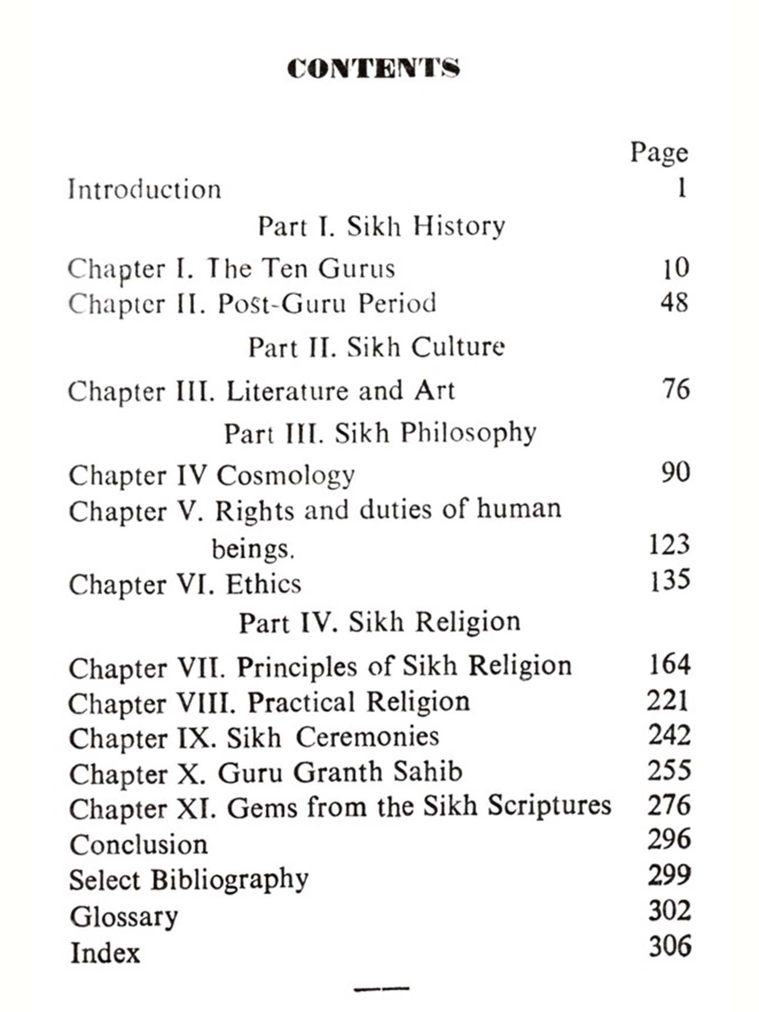 In understanding any religion, we must make a distinction between ends and means. Forms, symbols and precepts are only means and not an end in themselves. The novice or the pilgrim may be held in the beginning by these forms and precepts. But the goal is God-vision or merger in the Infinite, which is outside and beyond the rosary, Path or Pilgrimage. Moreover, religion is nothing if it does not lead to the building of character of the individual. Service of humanity through good deeds is enjoined by Sikh religion as a step towards the realisation of God. Sikhism like other great religions believes in monotheism, submission to His will, equality of man and woman. It, however, rejects the path of renunciation (Tyaga) or austerities (Yoga), the authority of the Vedas and the Hindu caste system. It emphasises the leading of a house-holder's life (Grasta), unattached to gross materialism, the doing of works of service (Sewa), and joining Kirtan and the company of the blessed-Satsang.