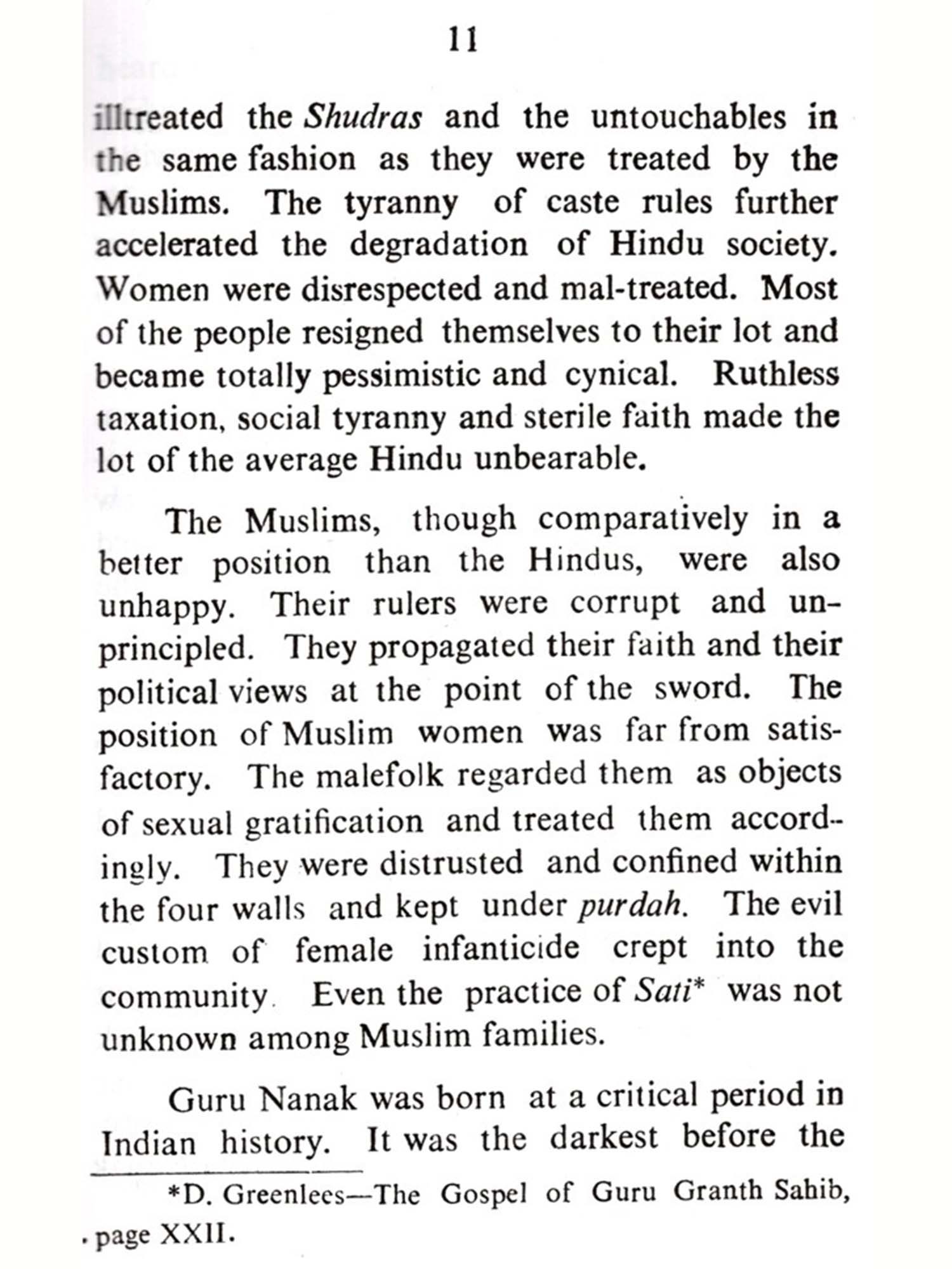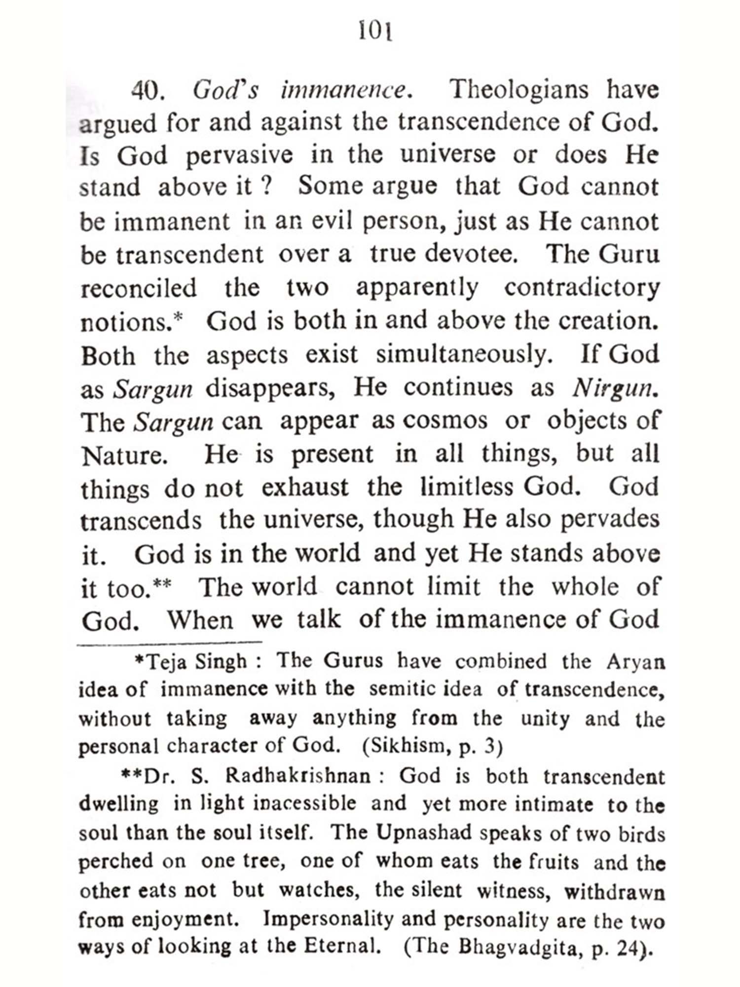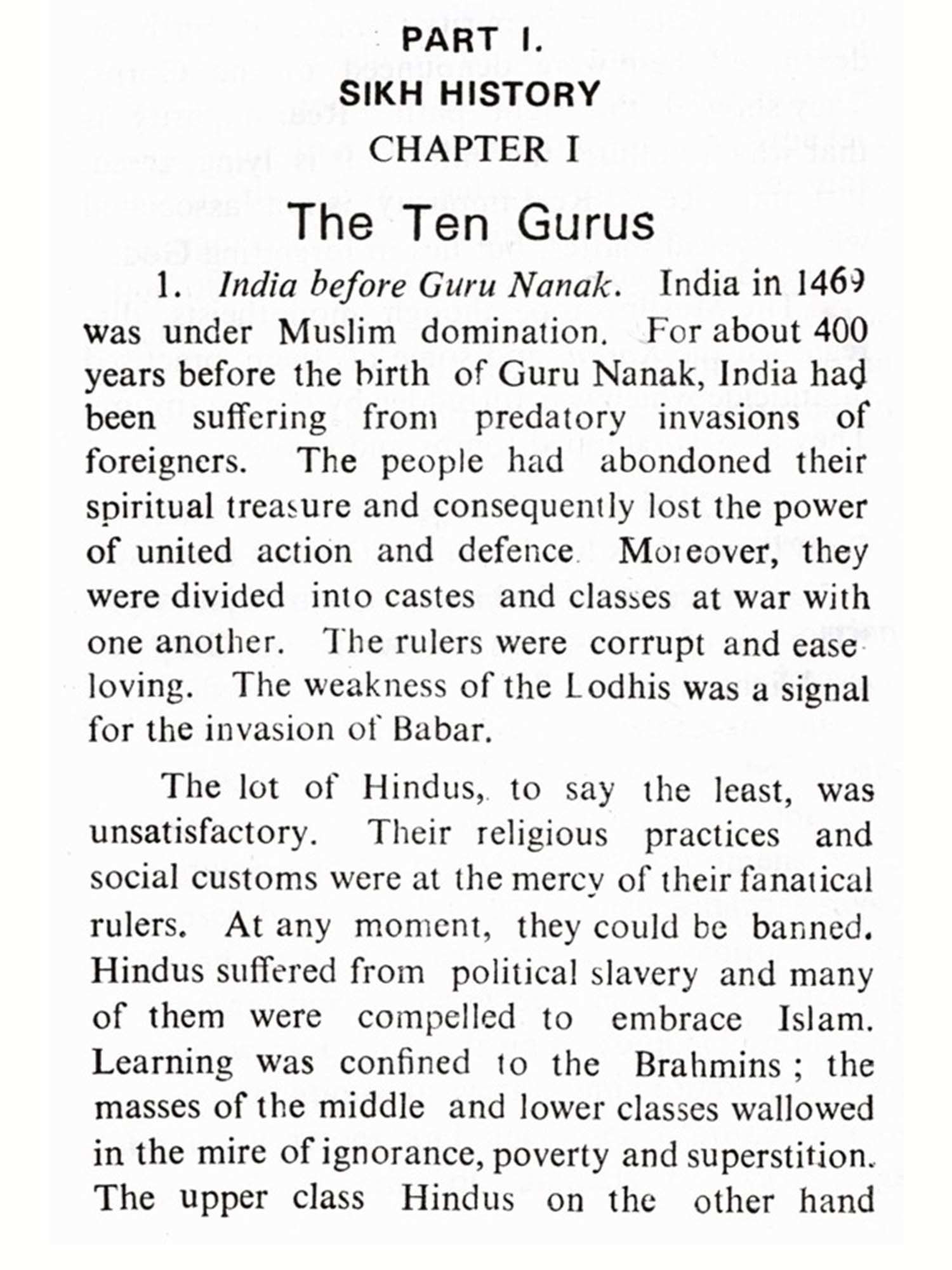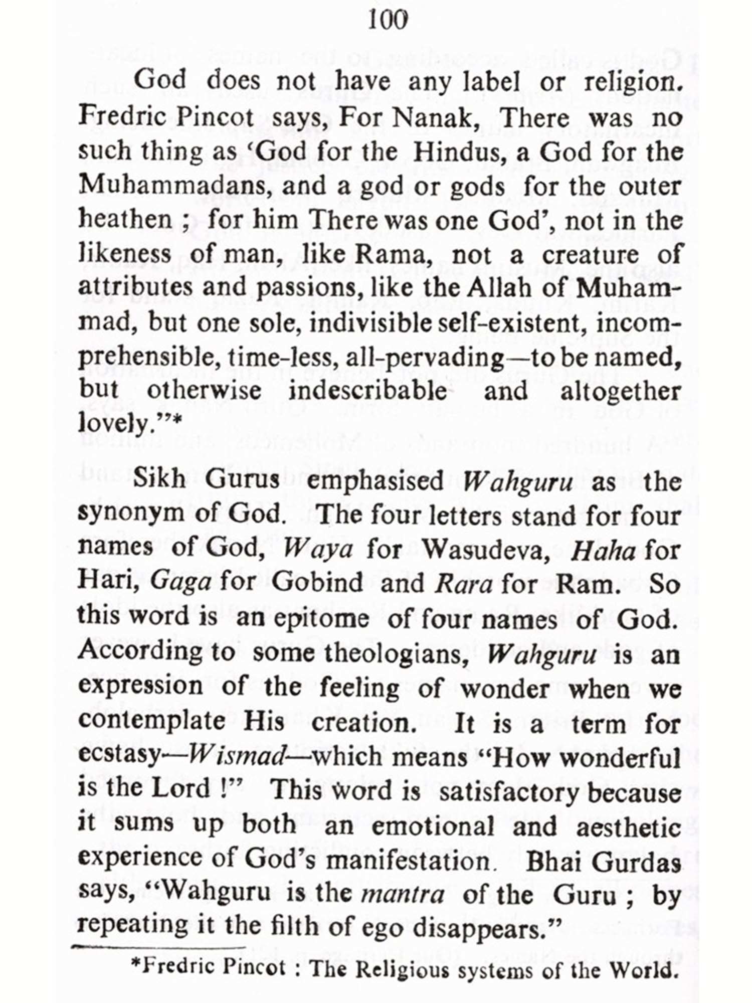 God sends His messengers into the world from time to time to guide humanity. Such a messenger was Guru Nanak. He regarded himself as a humble servant of God called upon to remove the ignorance, superstition and evil practices of his contemporaries. He went to different parts of the world to preach his message, not with a view to start a new religion, but rather to tell the people how they could be better followers of the religion they already professed. His aim was the spiritual transformation of man. His teaching contained also the best elements of Hinduism, Buddhism, Islam. Just as a bouquet is a bunch of flowers and yet has a separate entity, in the same way, Sikhism came to be regarded as a distinct faith. This view is supported by Macauliffe, Dorothy Field, Duncan Greenlees, S. G. Champion and Dorothy Short and Prof. A.E. Suthers". Guru Nanak affirmed that his revelation come directly from God. He had a direct vision of the Truth. The very first sentence that he uttered after three days' divine contemplation was: "I am neither a Hindu nor a Muslim". Undoubtedly, the Ten Gurus spoke to the people around them, including Hindus and Muslims. Naturally, they had to persuade the people to get rid of their superstitions and wrong notions in a language which they followed. That is why Sanskrit, Desi, Persian and Arabic words occur in their compositions. The fact that Hindu Bhagats and Muslim Fukirs gave express-ion to certain common concepts, as for instance, the absurdity of religious ritual, the hatred of idolatry, castelessness and the equality of man and woman, does not make the Guru's gospel any the less original. Even in the days of the Second Guru who popularised the Gurmukhi script, Sikhism came to be regarded as a distinct faith, deferring radically both from Hinduism and Islam. Undoubtedly, it is Indian in origin and yet a new revelation. The Sikhs have their own scriptures, their sacred city and their Founder and line of Gurus. Besides, the distinct ceremonies at the time of birth, baptism, marriage and death make it a distinct religion.