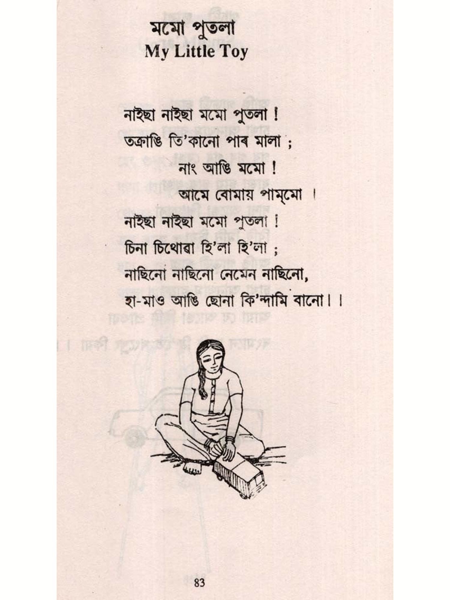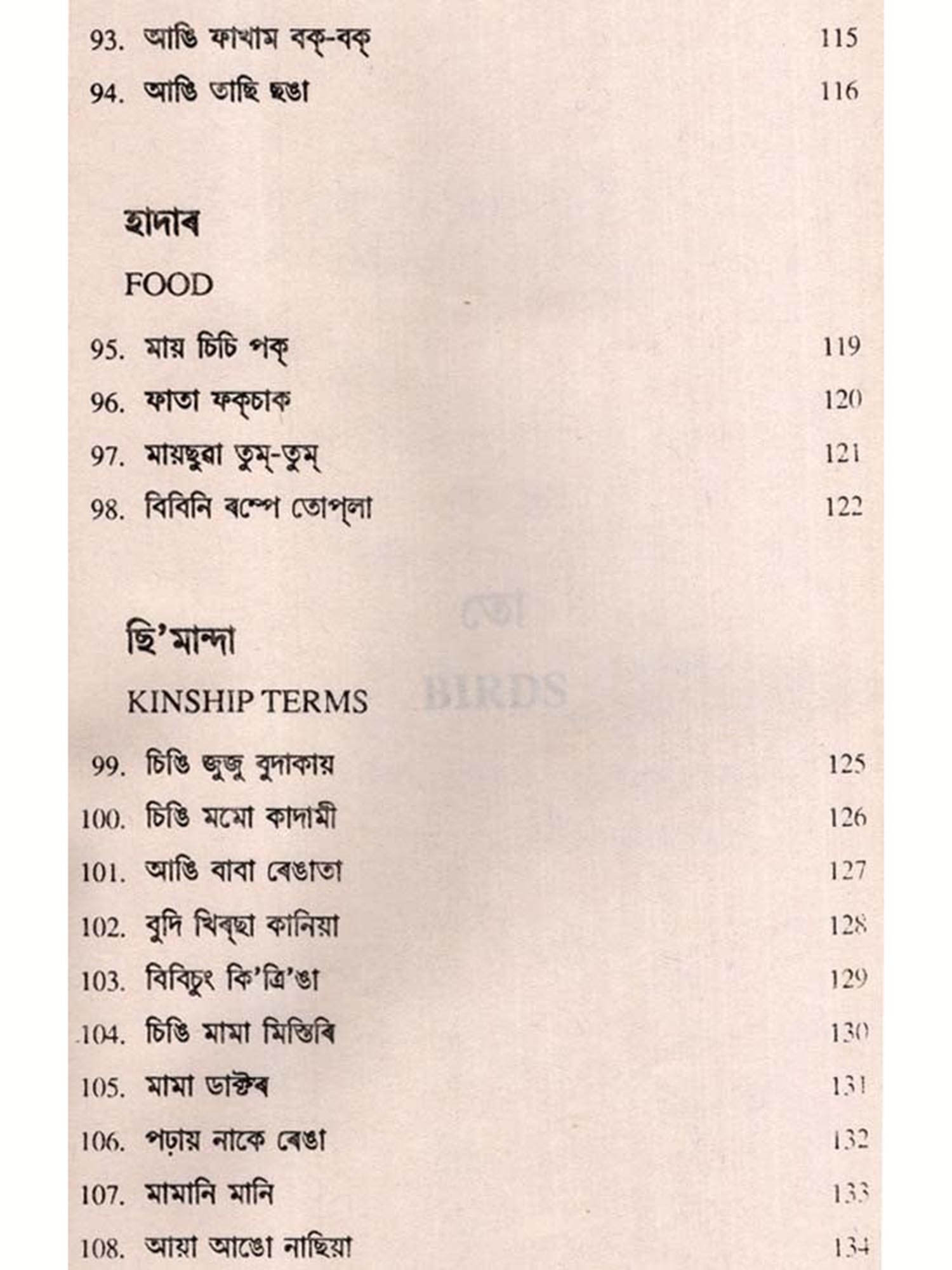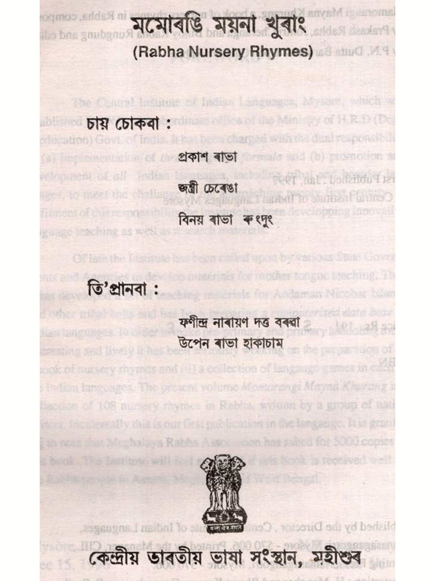 Of late the Institute has been called upon by various State Governments and Agencies to develop materials for mother tongue teaching. Thus, it has developed a set of teaching materials for Andaman Nicobar Islands and other tribal belts and has been preparing a computerised data base in Indian languages. In order to make pre-primary and primary schooling more interesting and livelier it has been seriously working on the preparation of (i) a book of nursery rhymes and (ii) a collection of language games in each of the Indian languages. The present volume Momorangi Mayna Khurang is a collection of 108 nursery rhymes in Rabha, written by a group of native writers. Incidentally this is our first publication in the language. It is gratifying to note that Meghalaya Rabha Association has asked for 5000 copies of this book. The Institute will feel rewarded if this book is received well by the Rabha people in Assam, Meghalaya and West Bengal.