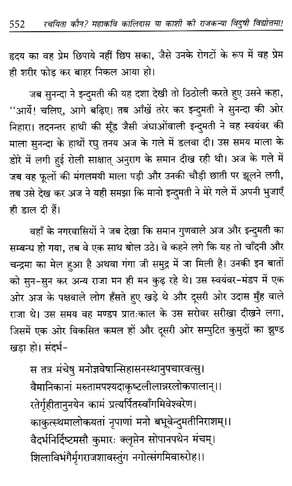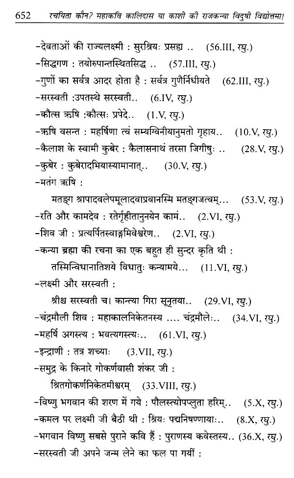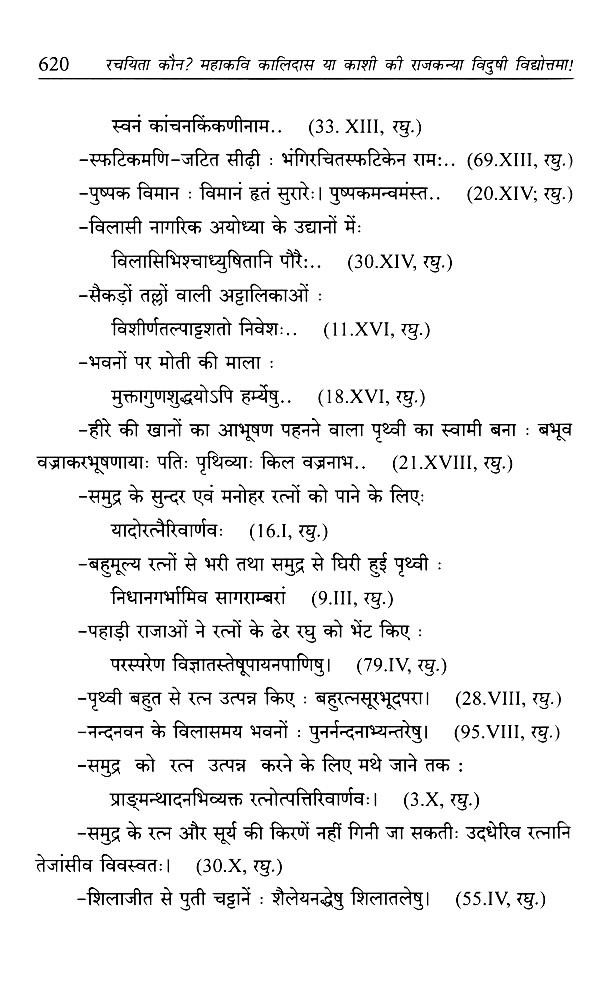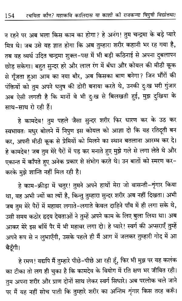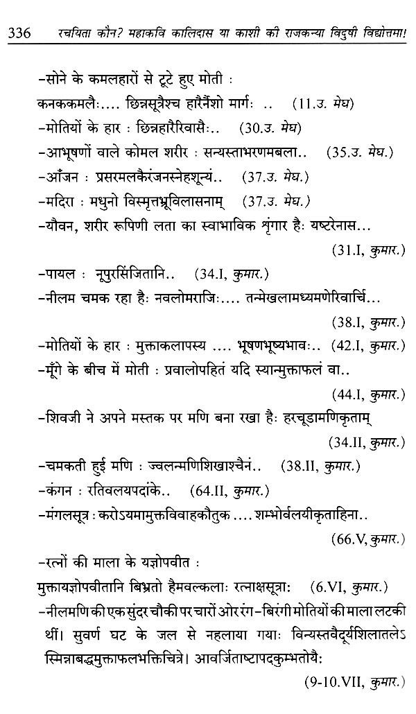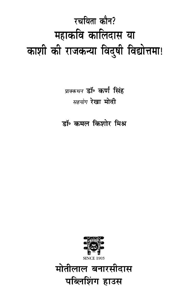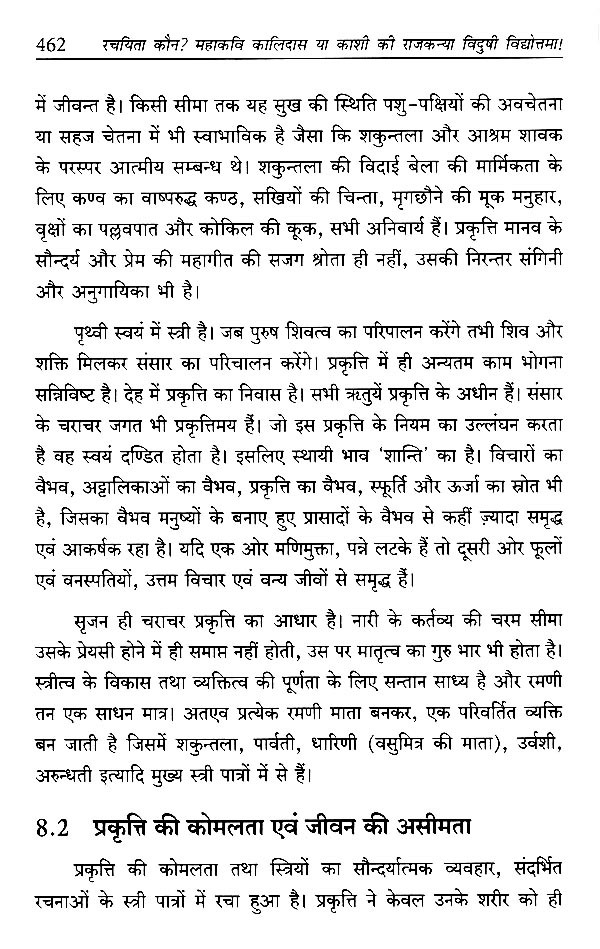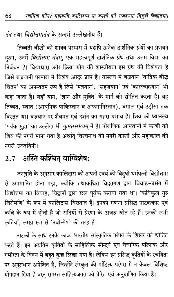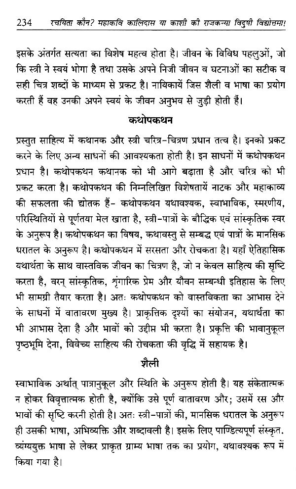 इस साहित्य का परिपाक यह स्पष्टतः संकेत करता है कि इन कालजयी ग्रंथों की रचयिता राजसी परिवेश से संवलित कोई विदुषी स्वी ही हो सकती है। यदि हम कालिदास और काशी की राजकुमारी विदुषी विद्योत्तमा के विवाह संबंधी शास्वार्थपरक लोक-कथा- किंवदंती को ध्यान में लाएँ, और वहीं दूसरी ओर इन सातों ग्रंथों के विशाल साहित्य के अंतःसाक्ष्यों का आद्योपान्त सूक्ष्म अन्वेषण विश्लेषण कर चिंतन करें, तब स्वतः इनका प्रमाण मिल जाएगा कि विदुषी विद्योत्तमा ही महाकवि कालिदास की सातों कृतियों की रचपिता रही हो। उन्होंने अपने पति के नाम पर साहित्य लेखन कर, स्वयं को विलुप्त करके भी अपनी सृजनात्मकता को निरन्तर अभिव्यक्त करती रहीं। स्वी-जीवन की साधनावस्था है जबकि उत्तरकाल इसकी विद्धावस्था।