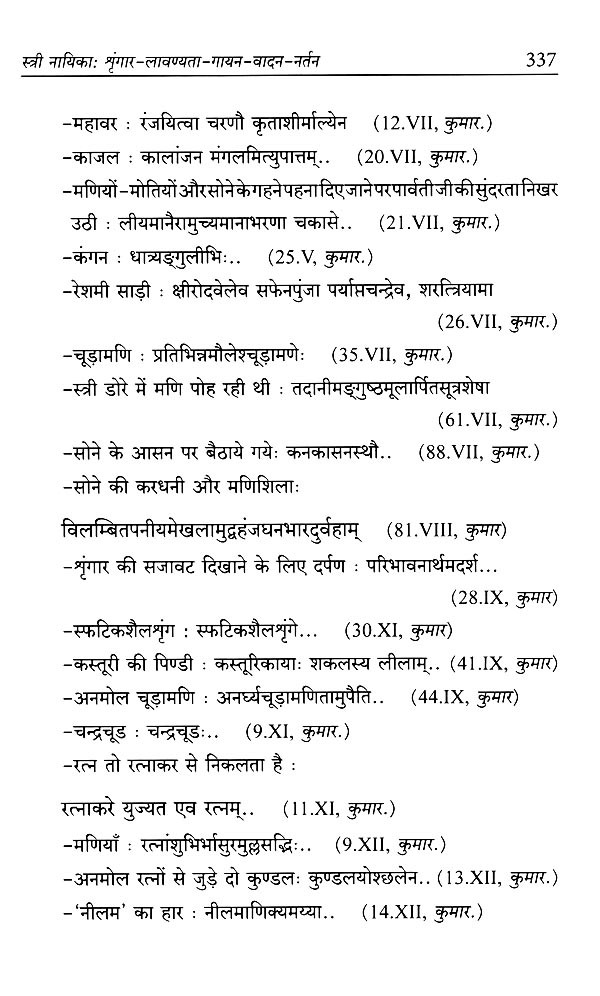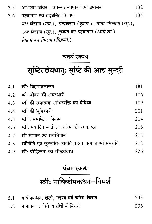 कुमारसंभवम् में विमुग्ध कर देने वाली सहजता और सौन्दर्य की प्रतिमूर्ति पार्वती की तपस्या, तथा रति का कामदेव के प्रति समर्पण, मेघदूतम् में यक्षी का आकर्षण, रघुवंशम् में कामधेनु का श्राप तथा रानी सुदक्षिणा की सहधर्मिता, स्वयंवर में रानी इंदुमति का विवेक पूर्ण अपने वर का चयन तथा परित्याग होने पर देवी सीता का आक्रोश, अभिज्ञान शाकुन्तलम् में आश्रम कन्या शकुन्तला का गंधर्व विवाह, पति दुष्यंत के द्वारा भरे राजदरबार में श्रापवश अपनी स्त्री शकुंतला का तिरस्कार, शकुन्तला द्वारा दुष्यंत की कड़े शब्दों में भर्त्सना एवं अन्ततः सर्वदमन का लालन पालन; मालविकाग्निमित्रम् में राजकमारी मालविका का ललित कलाओं द्वारा अग्निमित्र को आकर्षित करना, रानी धारिणी की अंतः पुर की कूटनीति, पंडिता कौशिकी की मंत्रणाएं और संतानहीन बाँझ इरावती की वेदना; विक्रमोवशर्शीयम् में अप्सरा कन्या उर्वशी का सौंदर्य एवं विजय के प्रसंग में उसकी प्रेम लीला और अंततः श्रापवश उसका अप्सरा लोक को वापस लौटना महत्वपूर्ण प्रसंग हैं। इन सभी नायिकाओं के साथ दैववश श्राप और वरदान जुड़ा हुआ है। दैवीय शक्ति इन्हें सजीव एवं सशक्त करती है।