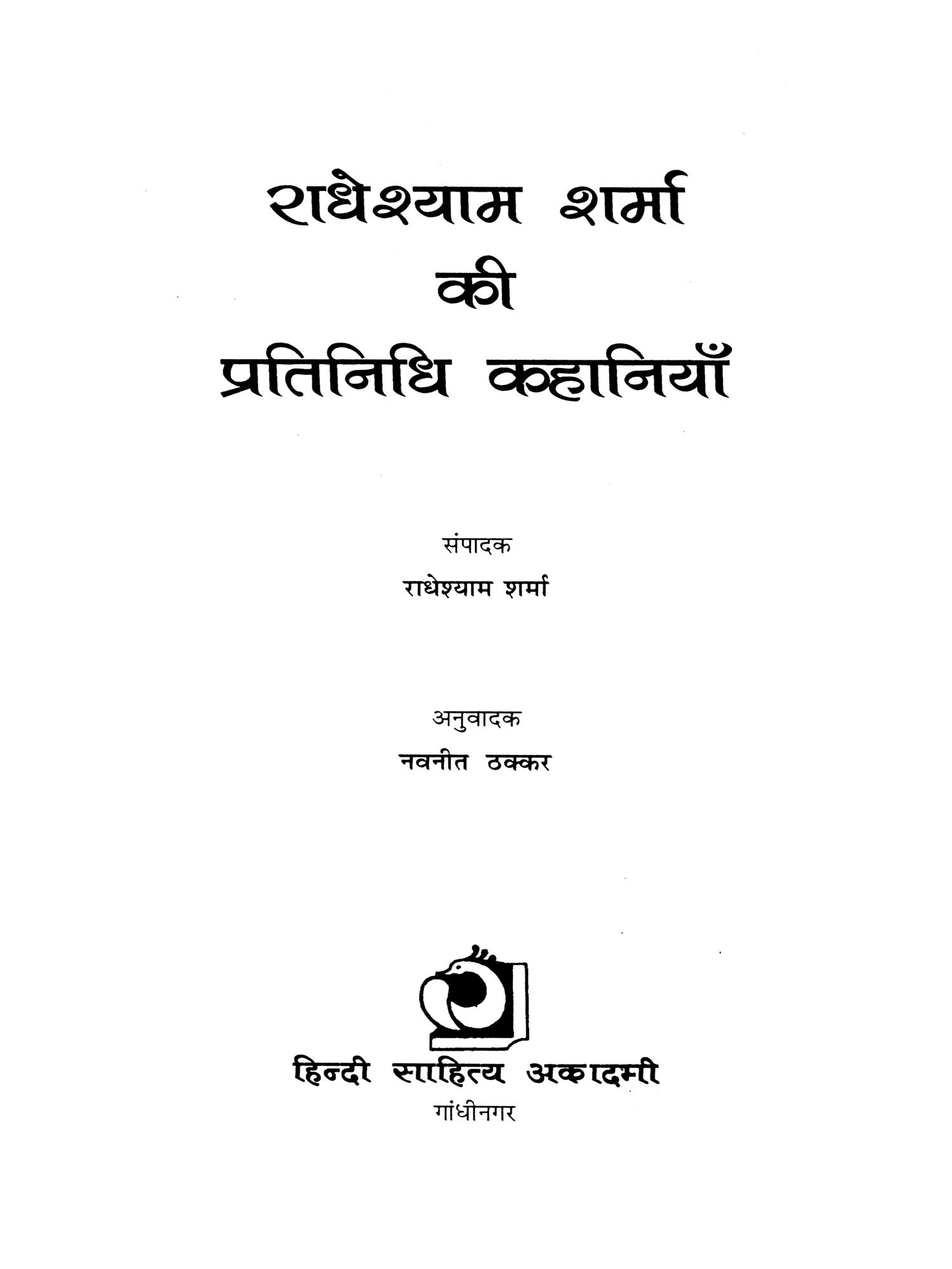 हिन्दी साहित्य अकादमी ने राष्ट्रभाषा के प्रचार-प्रसार हेतु भी उल्लेखनीय प्रवृत्तियाँ एवं प्रकाशन-कार्य किया है। शिष्ट साहित्य कृतियों का राष्ट्रभाषा में अनुवाद करवाकर उसे राष्ट्रीय स्तर पर पहुँचाने की प्रवृत्ति अपने आप में एक श्लाघनीय कार्य है, समय की माँग भी। इसे भी अकादमी ने नज़रअन्दाज़ नहीं किया। राधेश्याम शर्माजी की प्रतिनिधि कहानियों को अनूदित कर हो रहा प्रकाशन हाथ कंगन को आरसी क्या के समान है। अतः इसका भी अपेक्षित स्वागत होगा। गुजरातीभाषी होते हुए भी हिन्दी-अनुवाद की प्रवृत्ति के द्वारा गुजरातीभाषा की लगभग पचीस पुस्तकों के साथ इस पुस्तक का हिन्दी में अनुवाद करनेवाले नवनीत ठक्कर का भी अकादमी की ओर से आभार प्रदर्शित करता हूँ ।