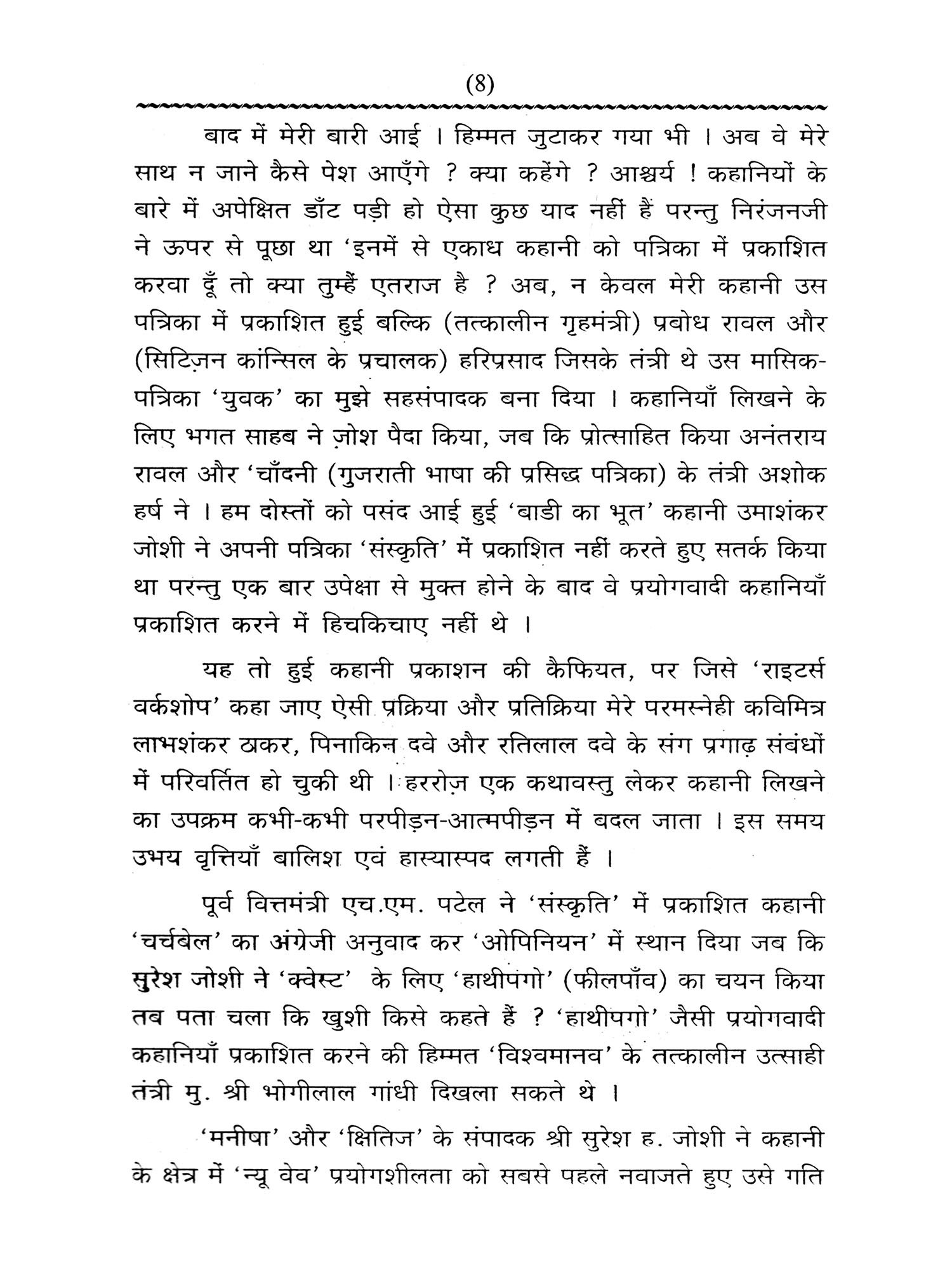 मेरा साफ मानना है कि घटना के वाका मलमली, बड़ी चौड़ाईवाले धान को समय की छोटी अंगूठी के बीच से पसार कर देने का कार्य कुशल कथाकार एवं कलाकार दोनों का है। इन शब्दों के द्वारा नये ढंग से और नई शैली में व्यंजना, पतीक, मीथ, कल्पनों का प्रयोग करते हुए भावाभिव्यक्ति का पकटीकरण करनेवाले समर्थ कहानीकार श्री राधेश्याम शर्मा की प्रतिनिधि कहानियों का गुजराती संस्करण तो प्रकाशित करते हुए खुशी प्रकट की थी। गुजराती साहित्य के सिरमौर से रणजितराम स्वर्णपदक से विभूषित इस सफल रचनाकार की प्रतिनिधि कहानियों को हिन्दी में अनूदित करवाते हुए और अधिक हर्ष हो रहा है।