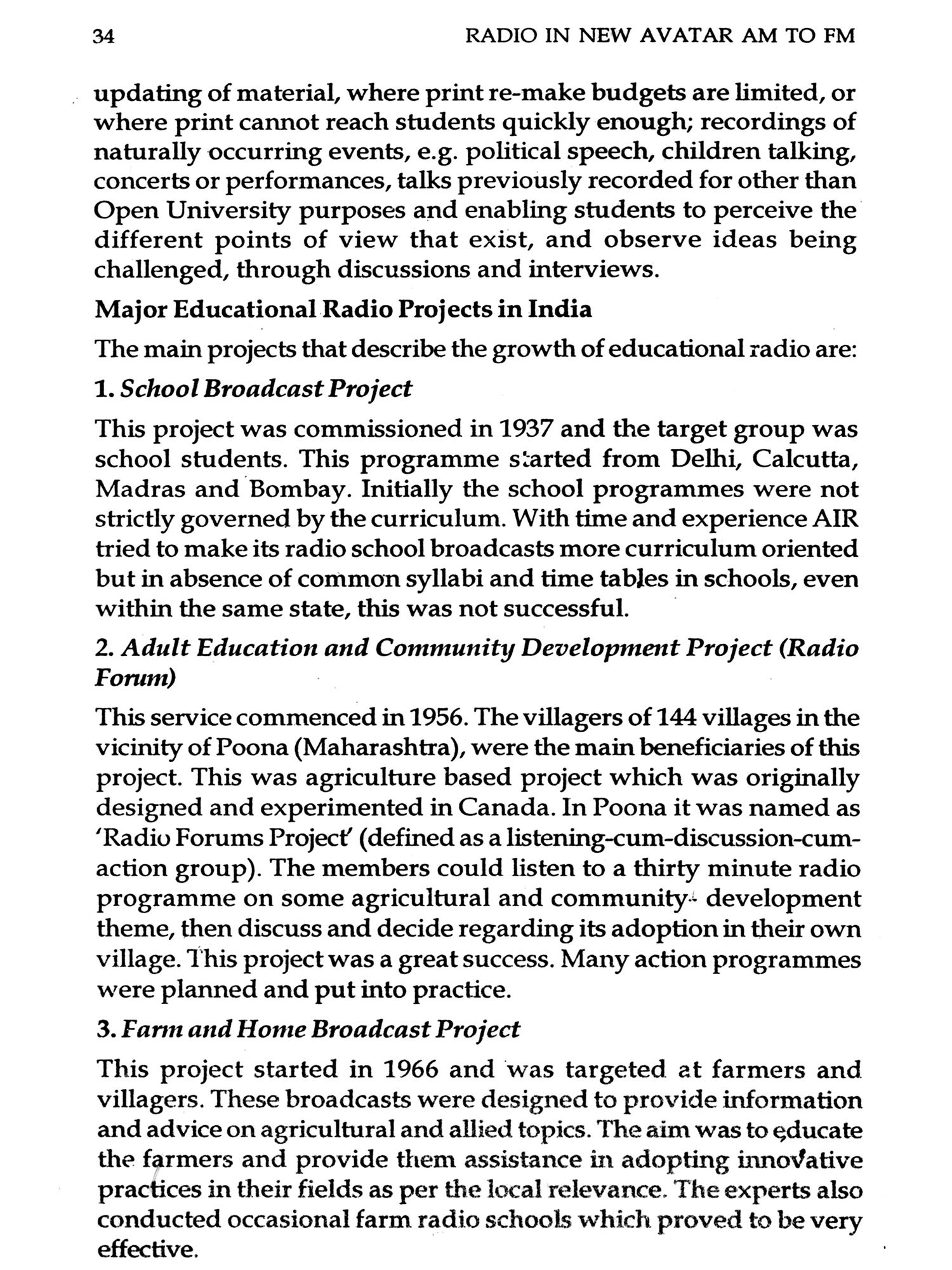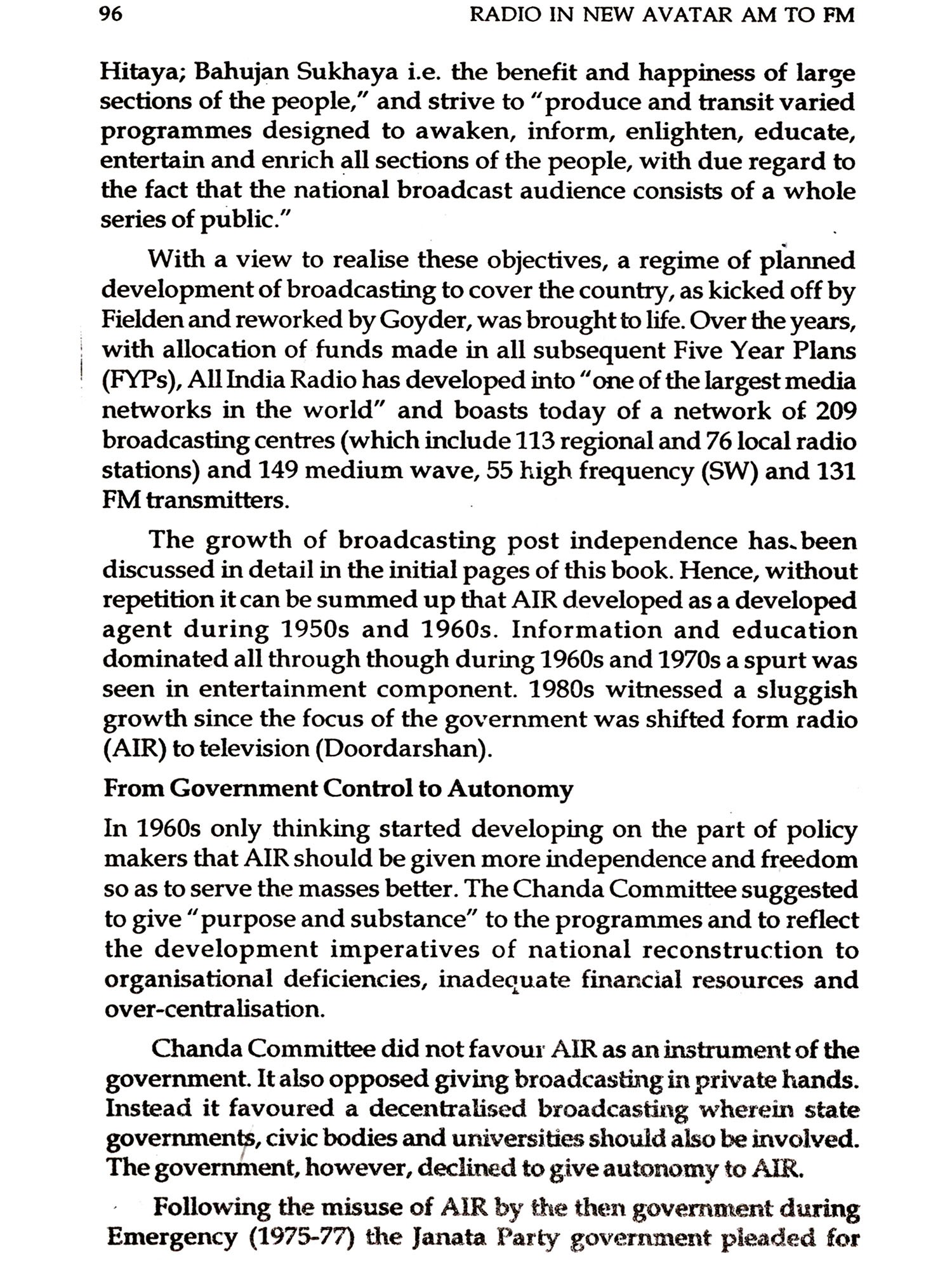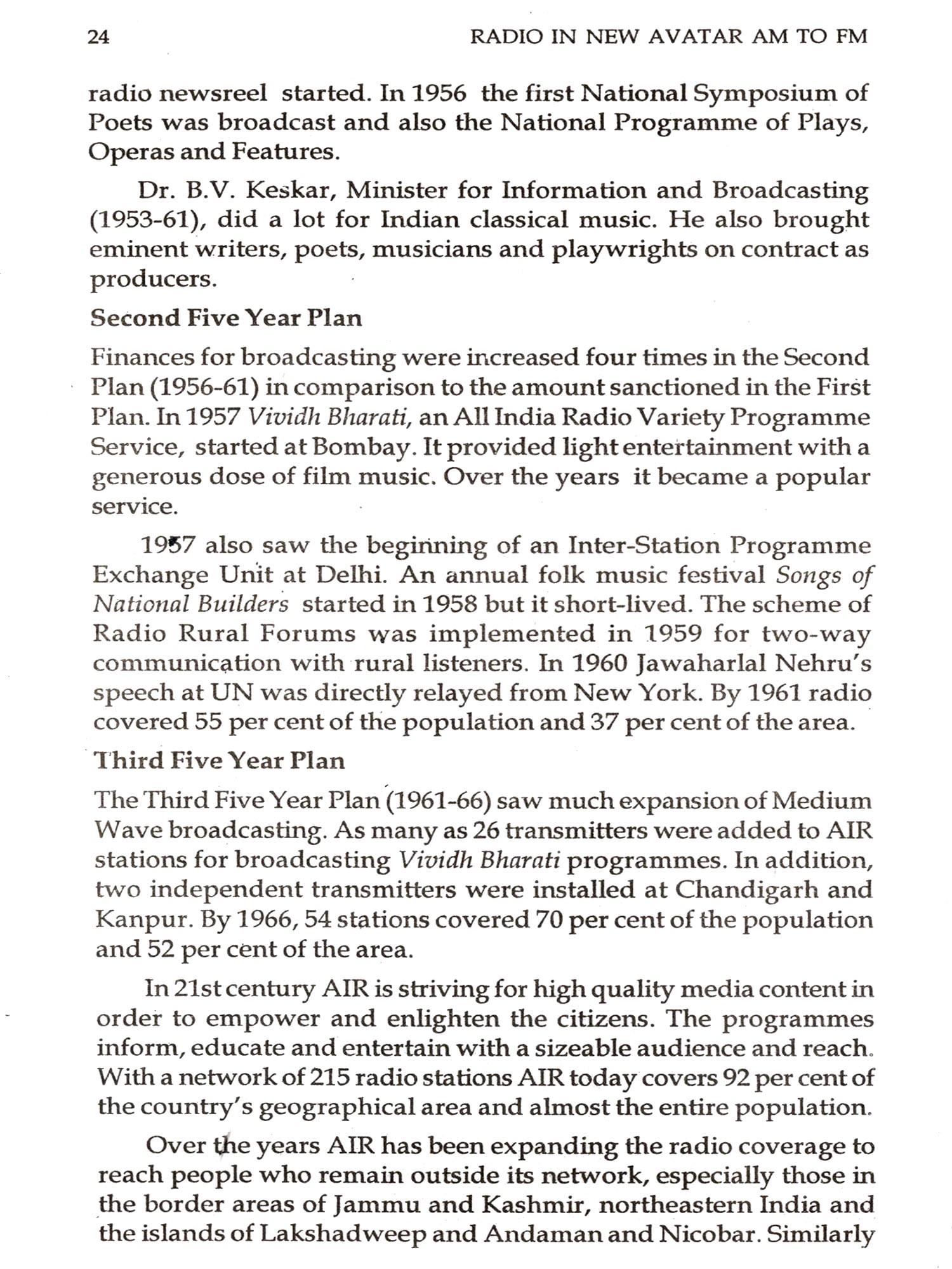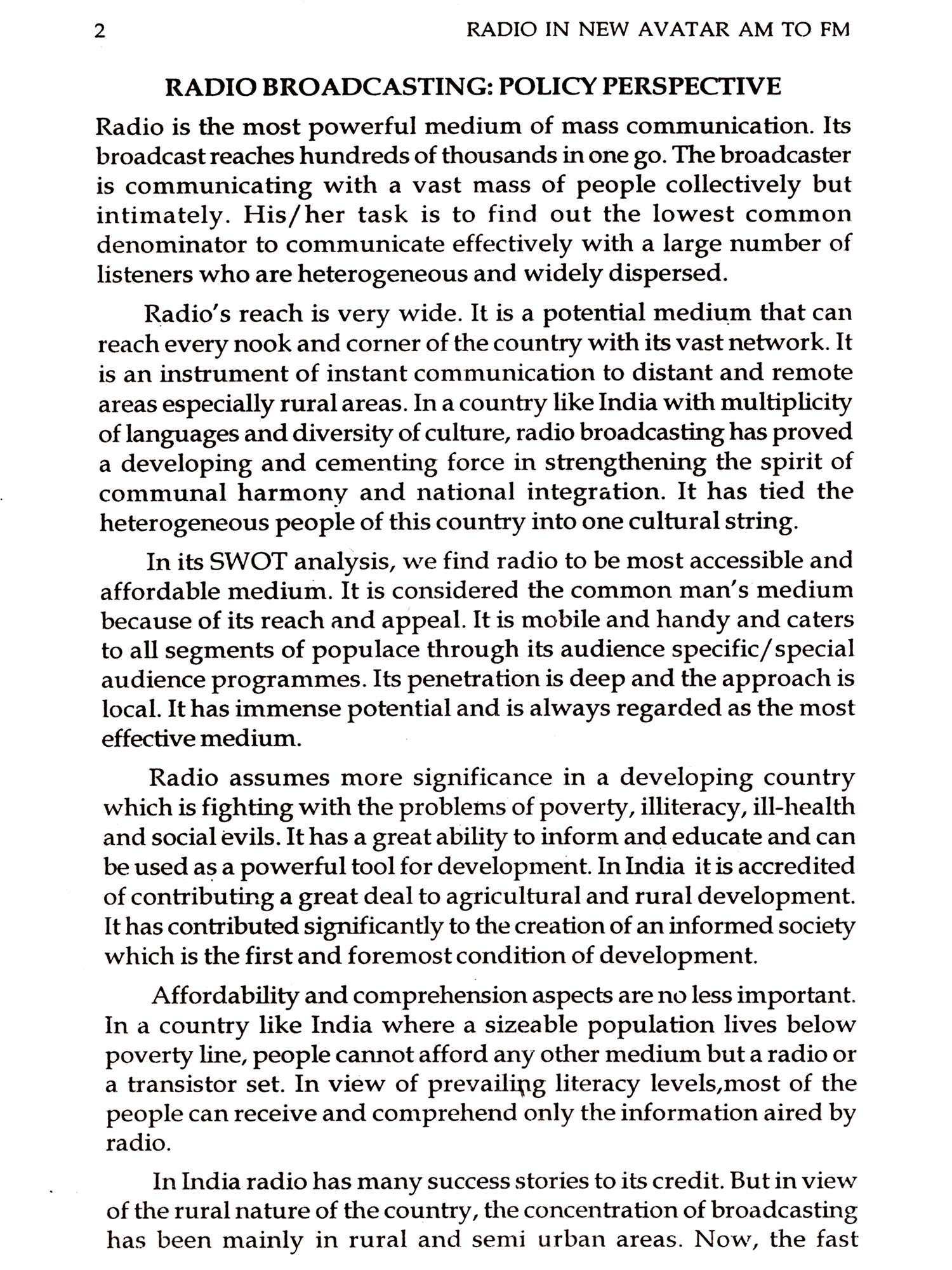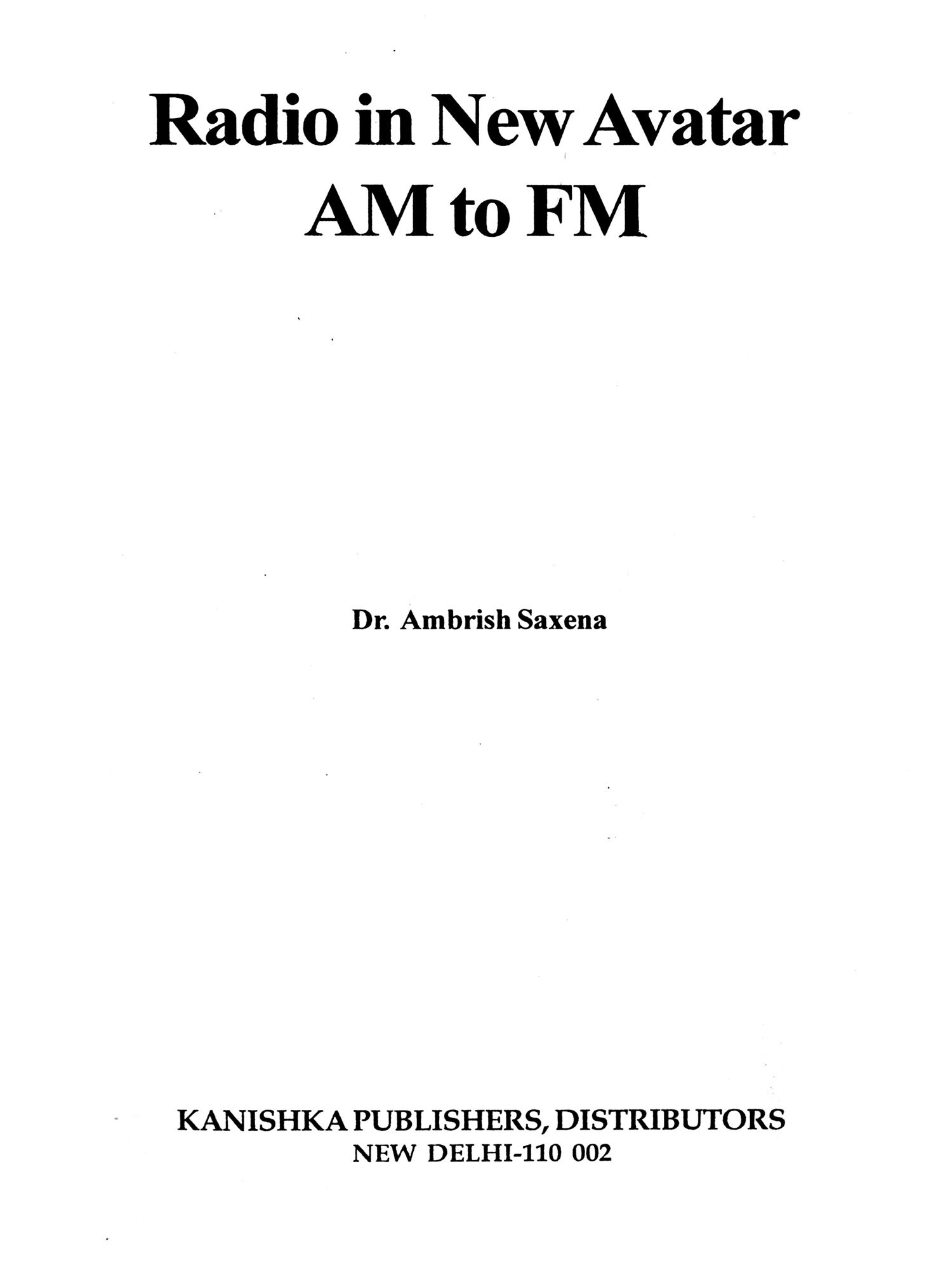 This book 'Radio in New Avatar: AM to FM', however, covers five major areas (a) plan perspectives, (b) policy paradoxes, (c) popular paradigms (e) prospects. , (d) potential and Radio broadcasting has been an important component of Five Year Planning in India. Extension of coverage, improvement in quality of programmes and achievement of development goals through radio have been the thrust areas during most of the Five Year Plans (FYPs). This book tries to help you understand the rich medium of radio in a better way by making an assessment of policy and planning.