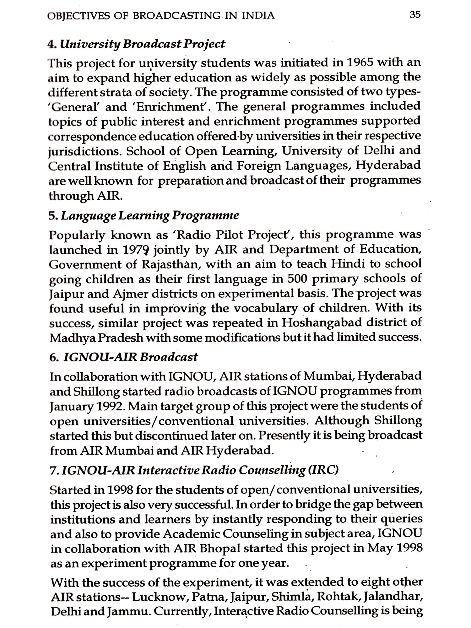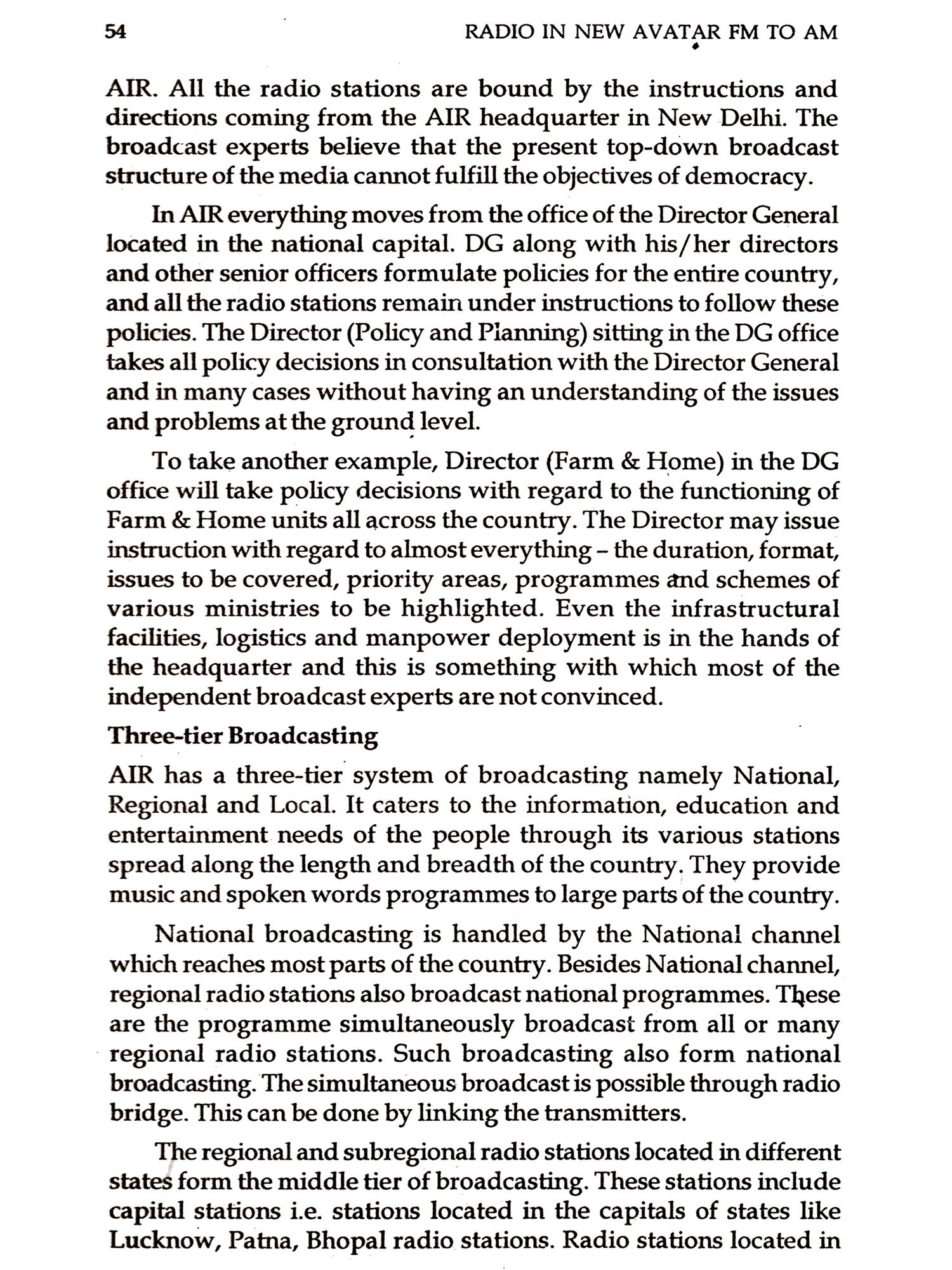 Radio broadcasting has passed through various concepts, from control oriented paradigm to commercial paradigm and community paradigm. The three-tier broadcasting has been redefined with conventional broadcasting being challenged by private FM radio and community radio. Educational broadcasting has added one more tier to the new set up of three tier.