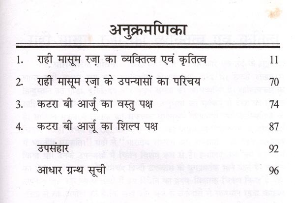 प्रथम अध्याय में राहीजी का व्यक्तित्व एवं कृतित्व प्रस्तुत किया है, जिसमें राहीजी के पारिवारिक जीवन से लेकर बहुमुखी व्यक्तित्व तथा साहित्यिक योगदान पर प्रकाश डाला है। द्वितीय अध्याय में राहीजी के सभी उपन्यासों का परिचय दिया गया है। तृतीय अध्याय में 'कटरा बी आर्जु' उपन्यास के वस्तुपक्ष का निरूपण किया गया है तथा चतुर्थ अध्याय में उपन्यास के शिल्पपक्ष का निरूपण किया गया है। पंचम अध्याय में उपसंहार है तथा साथ में परिशिष्ट के अंतर्गत संदर्भ ग्रंथ सूची तथा पत्र-पत्रिकाओं की सूची दी गई है।