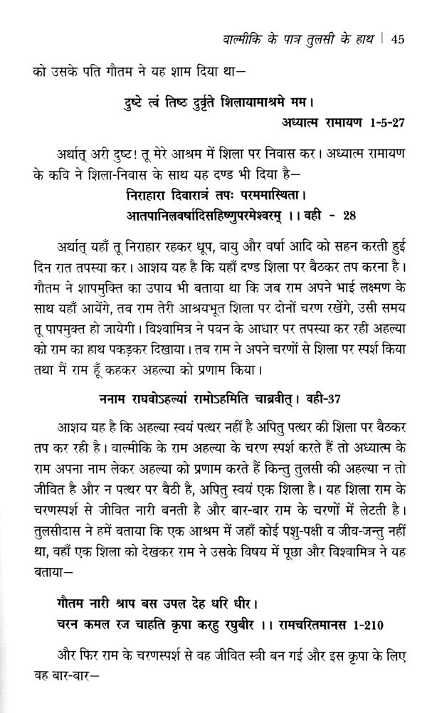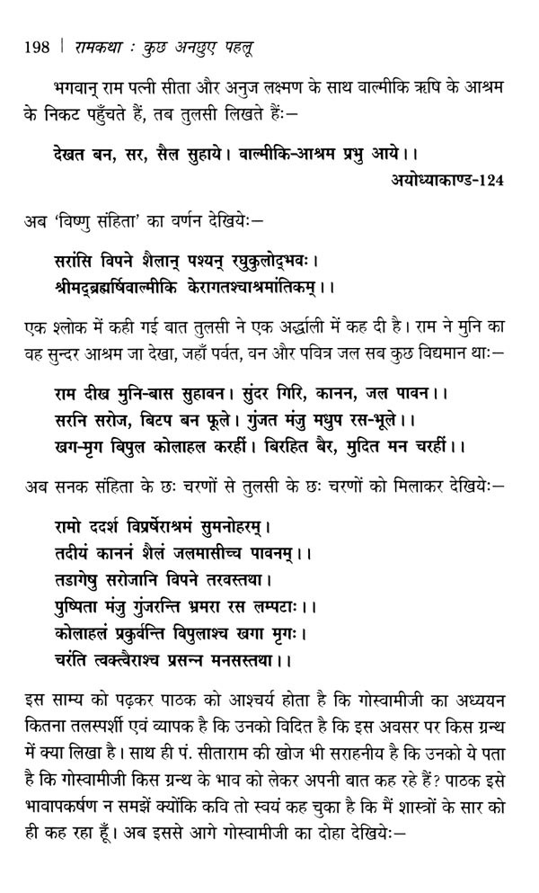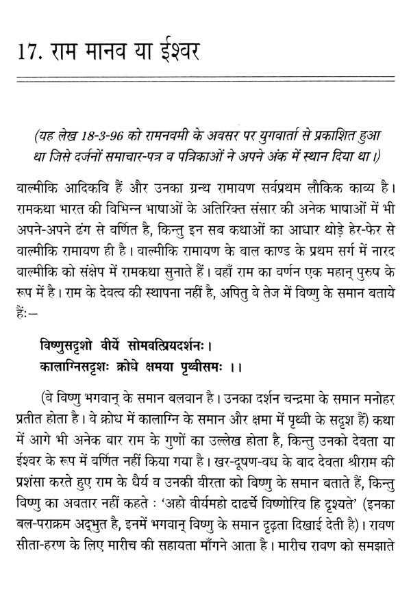रामकथा पर इन छत्तीस लेखों में मेरा अल्पज्ञान ही अभिव्ययक्त हुआ है। रामकथा एक सुन्दर सरोवर है जिसमें मैंने कुछ हिलोर उठाने का प्रयास किया है। किसी भी लेख में किसी भी रामकथा-मर्मज्ञ लेखक को उद्धृत नहीं किया है, जो कुछ अच्छा-बुरा है, स्वतः का चिन्तन है। यों तो लगभग सभी आलेख लीक से हटकर हैं किन्तु कुछ शीर्षक आपको पढ़ने के लिए बाध्य करेंगें। यथा- 'वाल्मीकि रामायण का उत्तरकाण्ड' जिसको डेढ़ दर्जन से अधिक पत्र-पत्रिकाओं में स्थान मिला है और जो अब पांच भाषाओं में पुस्तकाकार आ गया है। रामकथा के पाठक रावण को अच्छी दृष्टि से नहीं देखते किन्तु मैंने 'रावण का दृढ़ भक्तिभाव' लिखकर रावण को राम का भक्त सिद्ध किया है। दलित साहित्य के सन्दर्भ में प्रेमचंद को पहला दलित लेखक बतानेवालों को चुनौती देते हुए 'दलित साहित्य के प्रथम कवि तुलसी' लिखकर शास्त्रार्थ को निमंत्रण दिया है। सामान्य पाठक सीता-परित्याग के एक कारण से ही परिचित है, मैंने इस कल्पित घटना का मिथ्यात्व बताने के लिए 'हरि अनन्त हरि कथा अनन्ता' के द्वारा लगभग एक दर्जन कारण गिनाए हैं। अहल्या पत्थर बन गई थी, इस भ्रम को मिटाने के लिए 'गौतम तिय तरी' लिखना पड़ा। आश्विन मास में रावण दहन का त्योहार दशहरा कितना संगत-असंगत है, इसके लिए 'विजयदशमी एक प्रश्न' अवश्य पढ़ लें।