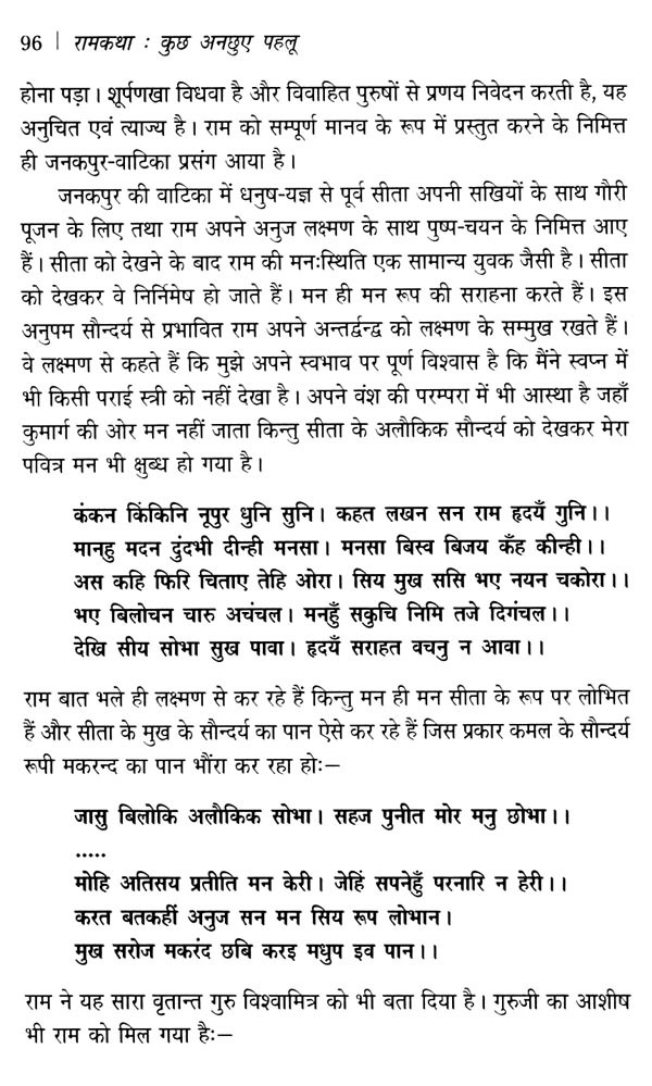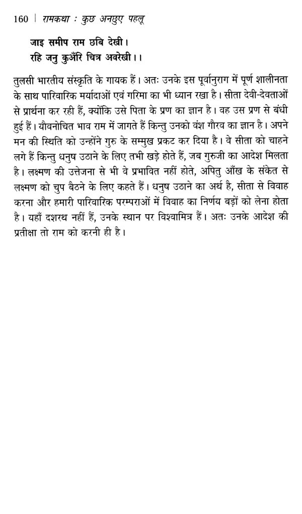 'रामकथा : कुछ अनछुए पहलू' आपको सौंपते हुए प्रसन्न होना स्वाभाविक है क्योंकि आप परीक्षक हैं, और मैं परीक्षार्थी। मुझे पूरा भरोसा है कि आपकी कसौटी पर कसने के बाद मेरा परिश्रम सफल होगा। 'आपरितोषाद् विदुषां न साधु मन्ये प्रयोग विज्ञानम्' इस सूक्ति का सहारा लेकर ही रामकथा के प्रसंगों पर लिखने का साहस किया है। परिणाम यह रहा कि मेरी पुस्तक 'मानस चिन्तन' को उत्तर प्रदेश हिन्दी संस्थान ने 'आचार्य महावीर प्रसाद द्विवेदी नामित पुरस्कार' से पुरस्कृत किया और राम पर कुछ लिखने के कारण उसी संस्थान ने मुझे ढ़ाई लाख रुपए की राशि के साथ 'साहित्य भूषण' उपाधि प्रदान की। दूसरी पुस्तक 'रामकथा का मर्म' हाथों-हाथ पाठकों तक पहुंच गई। इस कृति में कुछ और जोड़ा है जो आपको सुखद अनुभूति का अवसर देगी।