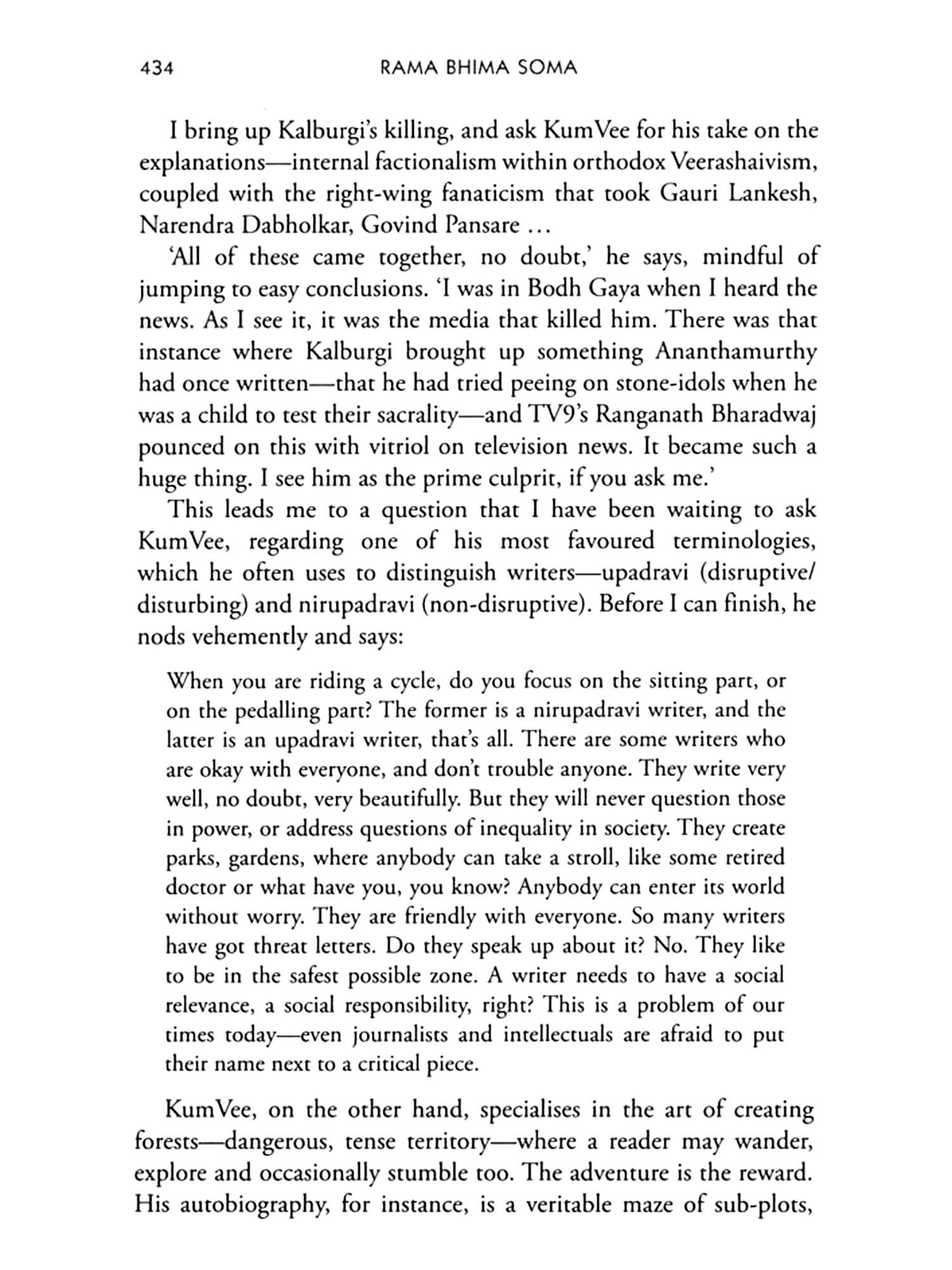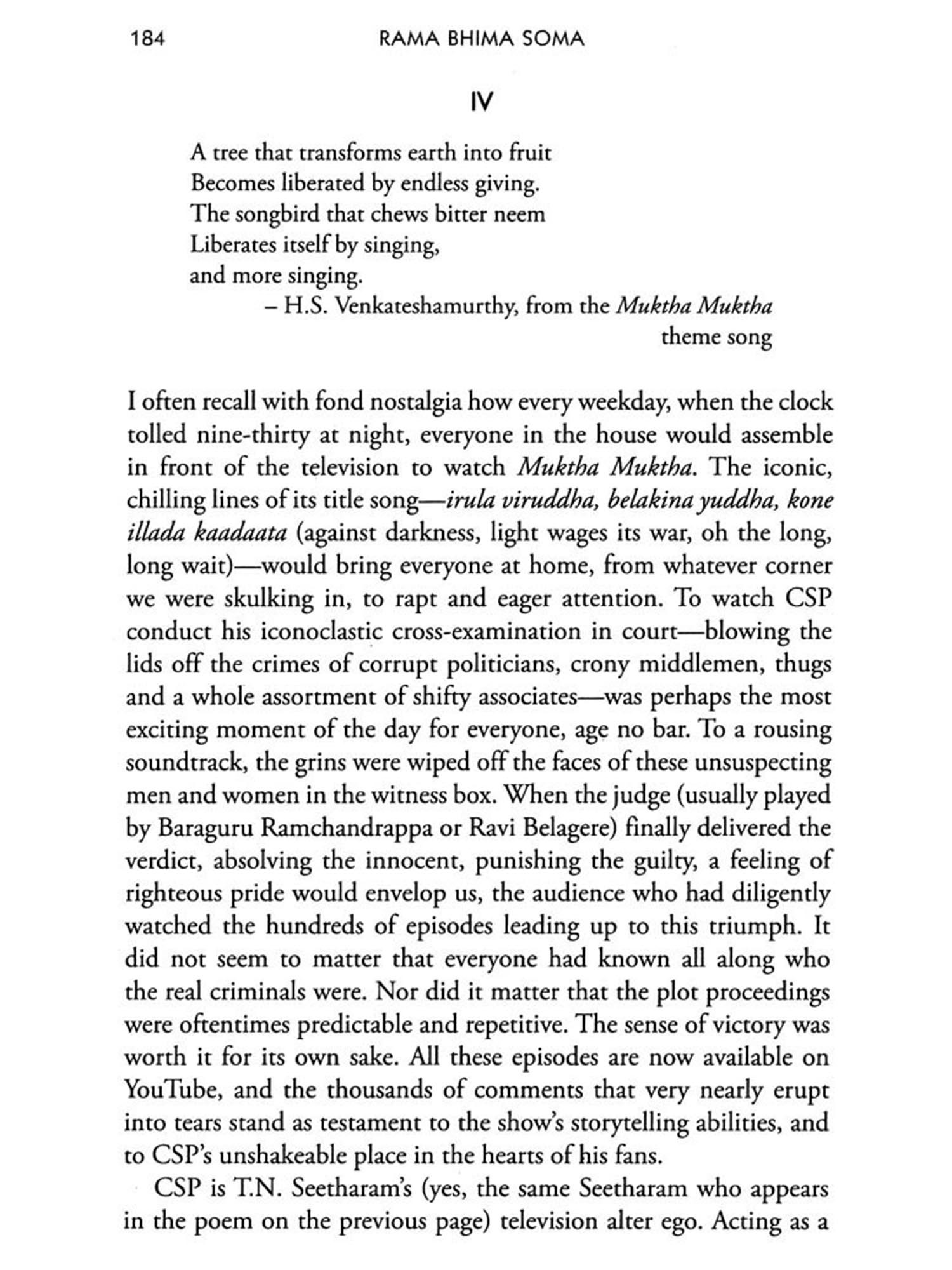 Rama Bhima Soma is an enterprise of translation and rediscovery, packed with stories and conversations. The life and times of legends like Kuvempu and Shivaram Karanth; the fall of Socialism and the rise of the Hindu Right; the intellectual ruminations of U.R. Ananthamurthy, D.R. Nagaraj and M.M. Kalburgi; the wildly popular television serials of T.N. Seetharam and the community-centred one-woman theatre shows of Du Saraswathi; a brief history of Naxalism in Karnataka and glimpses of other complicated legacies of the 1970s' Left-the book explores a dizzyingly wide sweep of Karnataka's contemporary history, seeking, above all, to forge new connections and begin fresh conversations.