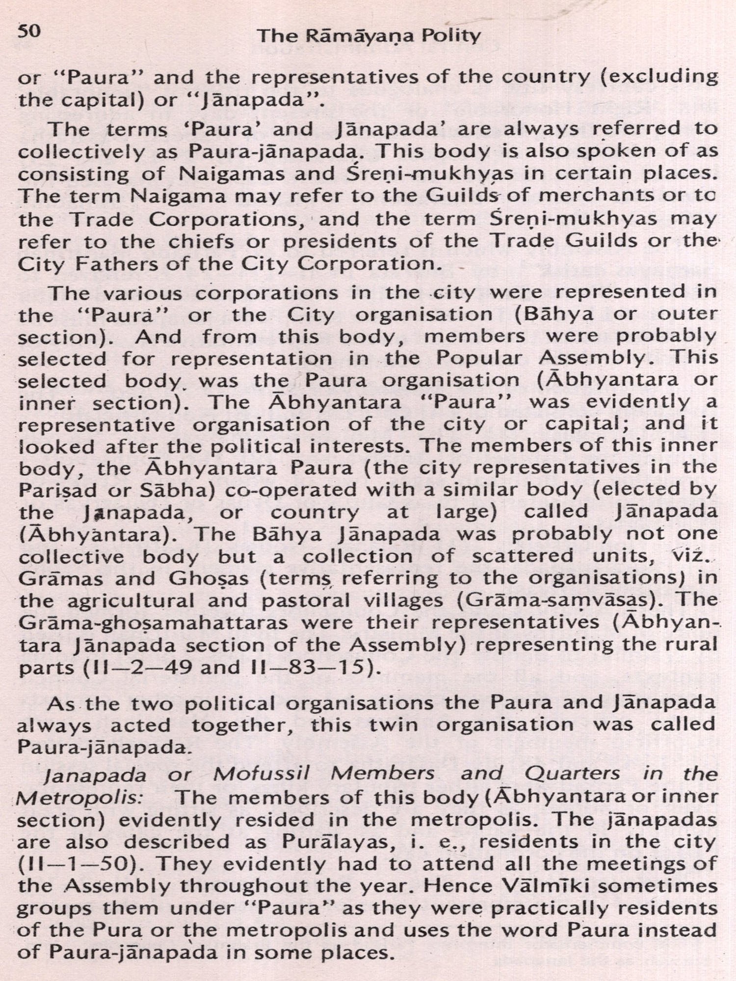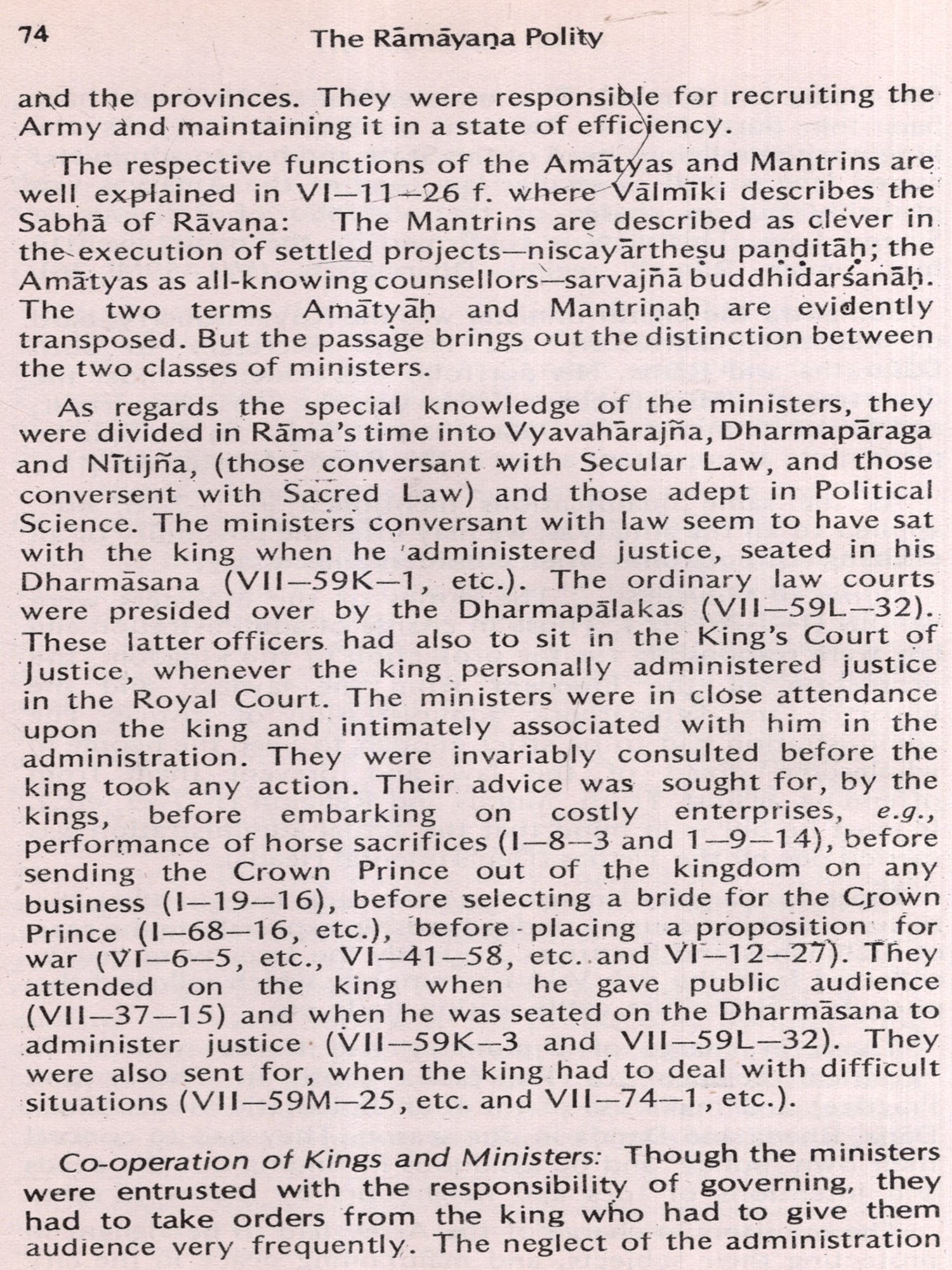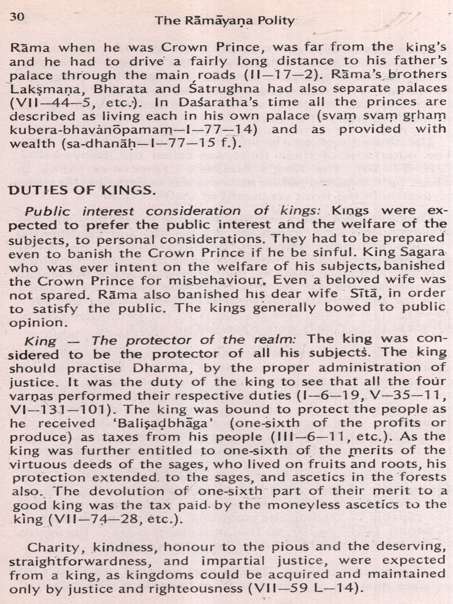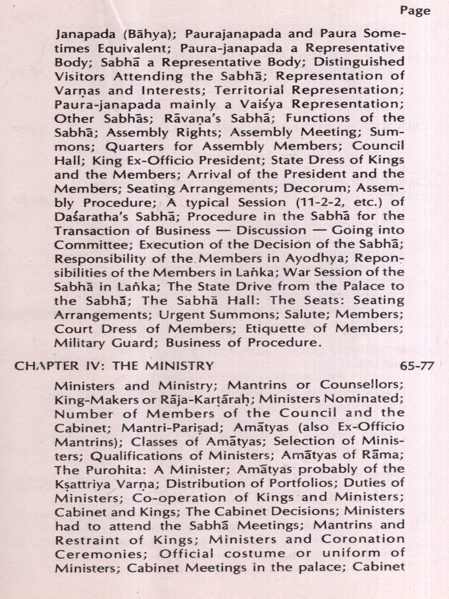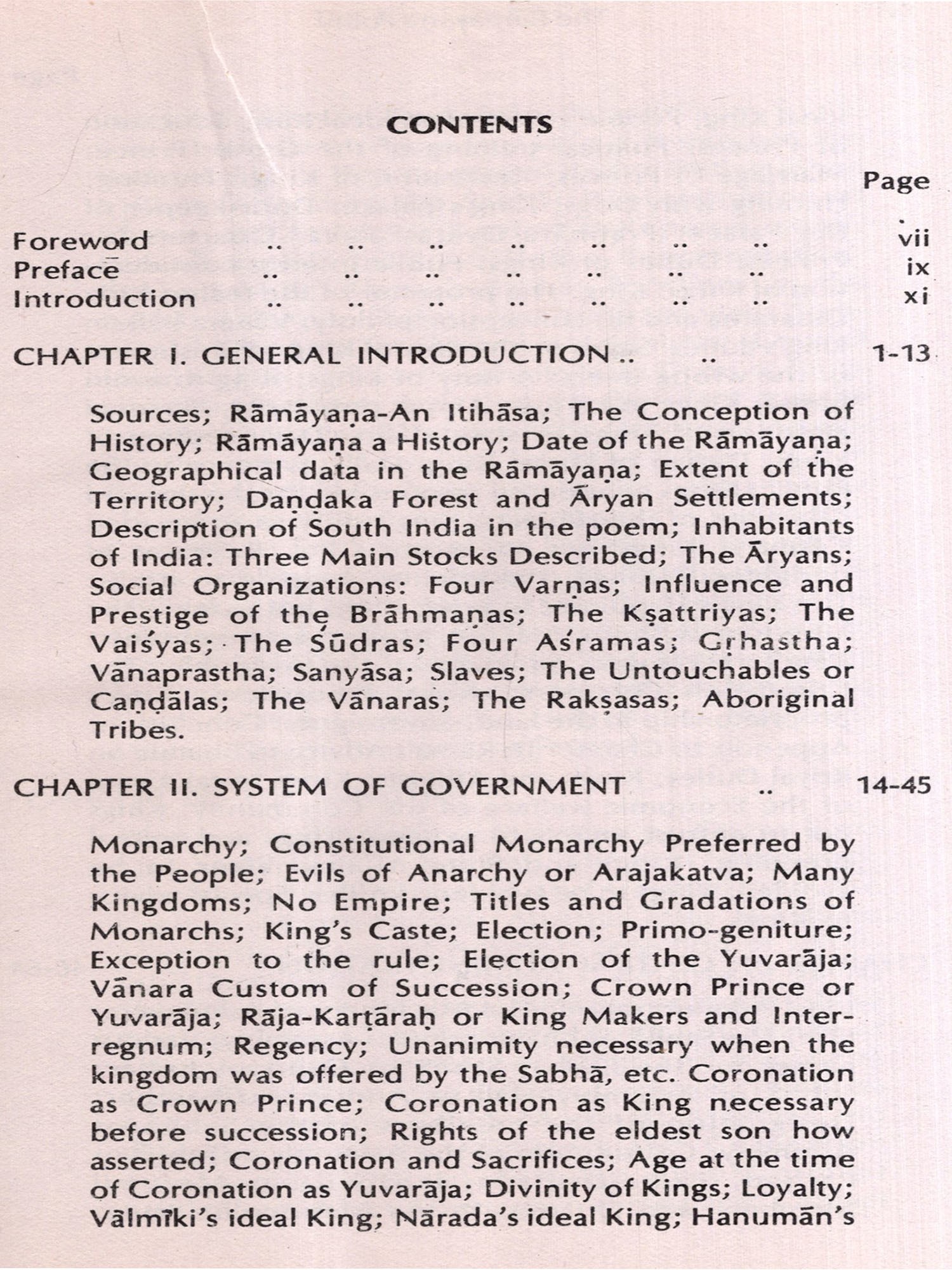 Many scholars have written on Ancient Hindu Polity and Sociology. But their attention has been riveted on a study mainly of the Vedas, the Mahabharata, the Arthasastra of Kautilya and other later works on Indian Polity. They have not fully utilised the information available in the Ramayana. The Ramayana has not been given its due importance. During the preparation of an Index to the Ramayana (which is yet unpublished), I came across a number of references dealing with the political and social conditions of the people. These, interesting details have been collected and worked up into a description of the polity that existed during the period subsequent to the Vedic and preceding the Bharata period.