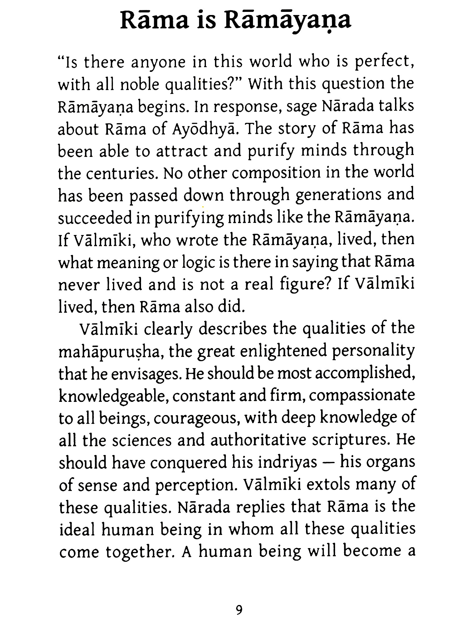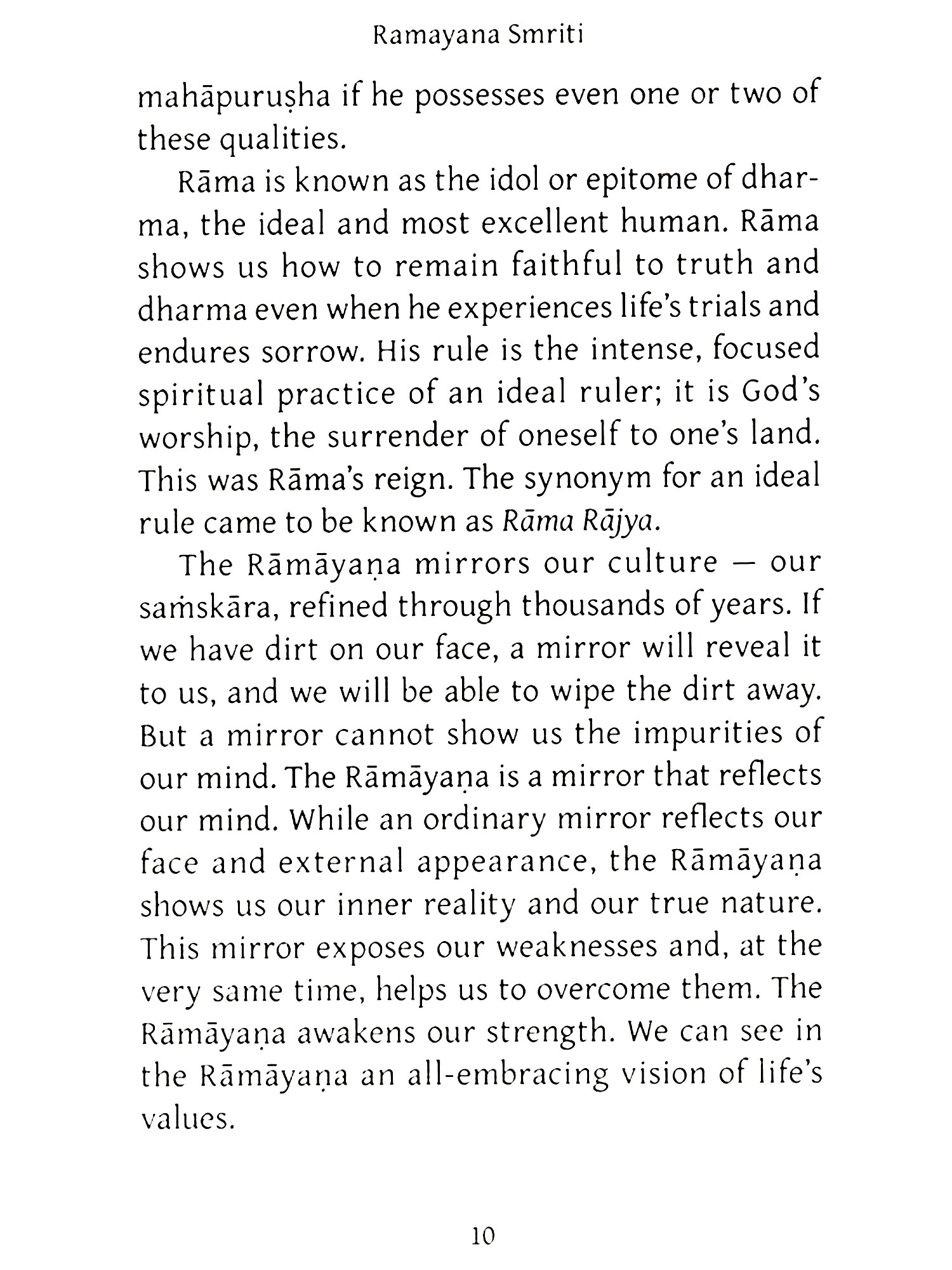 If we consider the challenges faced by the noble characters of the Rāmāyaņa, our difficulties will seem trivial. Because of this, the Rāmāyaņa gives us the inner strength to overcome any obstacle. Each character helps us to sharpen the weapons we need for life's battles.