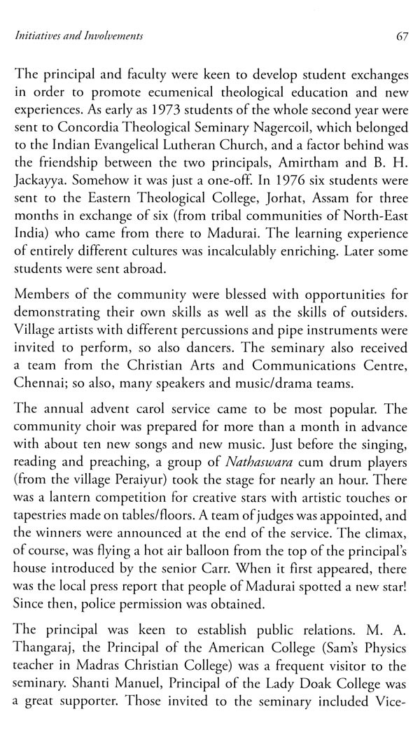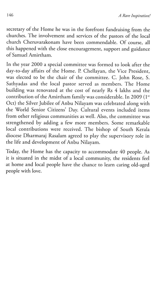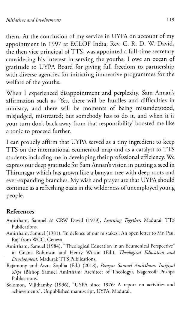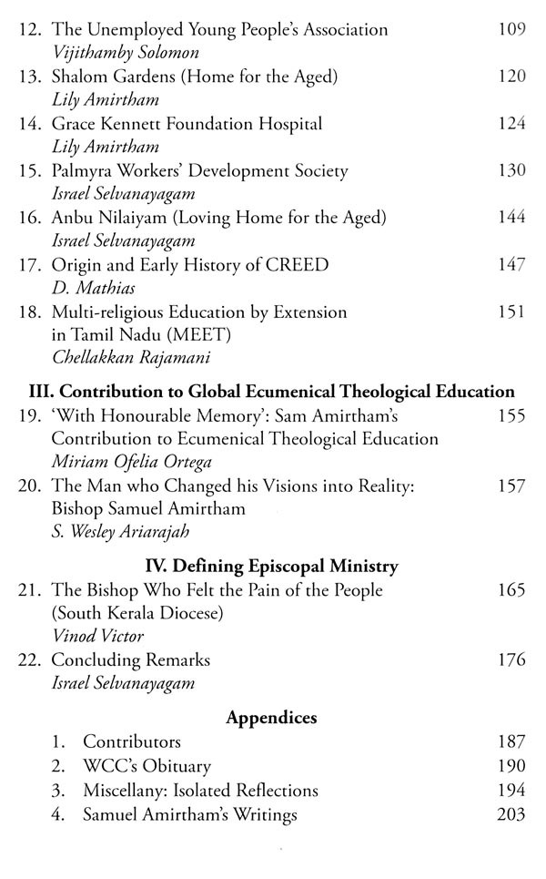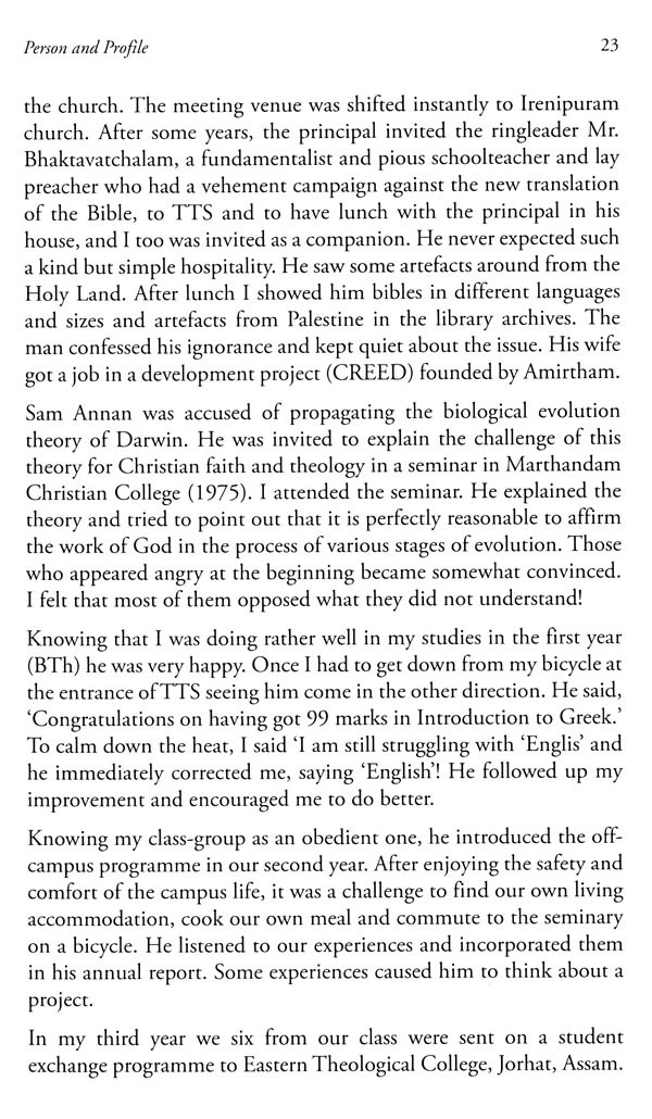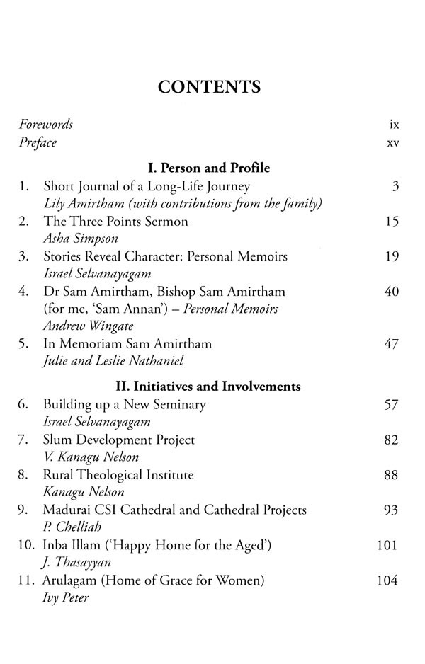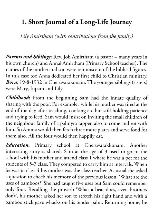 After two months he passed on to infinite intimacy with the Eternal I am. With full time ministry and pending writing works (including those 'in collaboration with him'), my time for collection of materials was limited. Whatever I could find in his study relevant to this work I collected (nothing in order!). Detailed accounts of certain projects were not available for my access. 1 had to be satisfied with bits and pieces which could be stitched together apart from the articles written by my former students and friends. For clarification and pieces of information to fill the gaps I had to repeatedly approach Lily Akka, and her contribution and encouragement has been beyond any measure. I sent the first draft to the Amirthams for factual verification. There was overall approval and appreciation. As Sam Annan specifically mentioned about focusing on his projects ('initiatives and involvements'). I thought this book represents them best as they have been written by those who were personally involved in them. However, I shared Arun's desirability of a monograph, more objective, concise and comprehensive, that would fulfil the requirements of a standard biography. At the same time, we agreed that in future such production would be possible with more research, planning and expertise. In any case, I made considerable improvement on the first draft with some additions. Also, I did not want to delay the publication any longer.