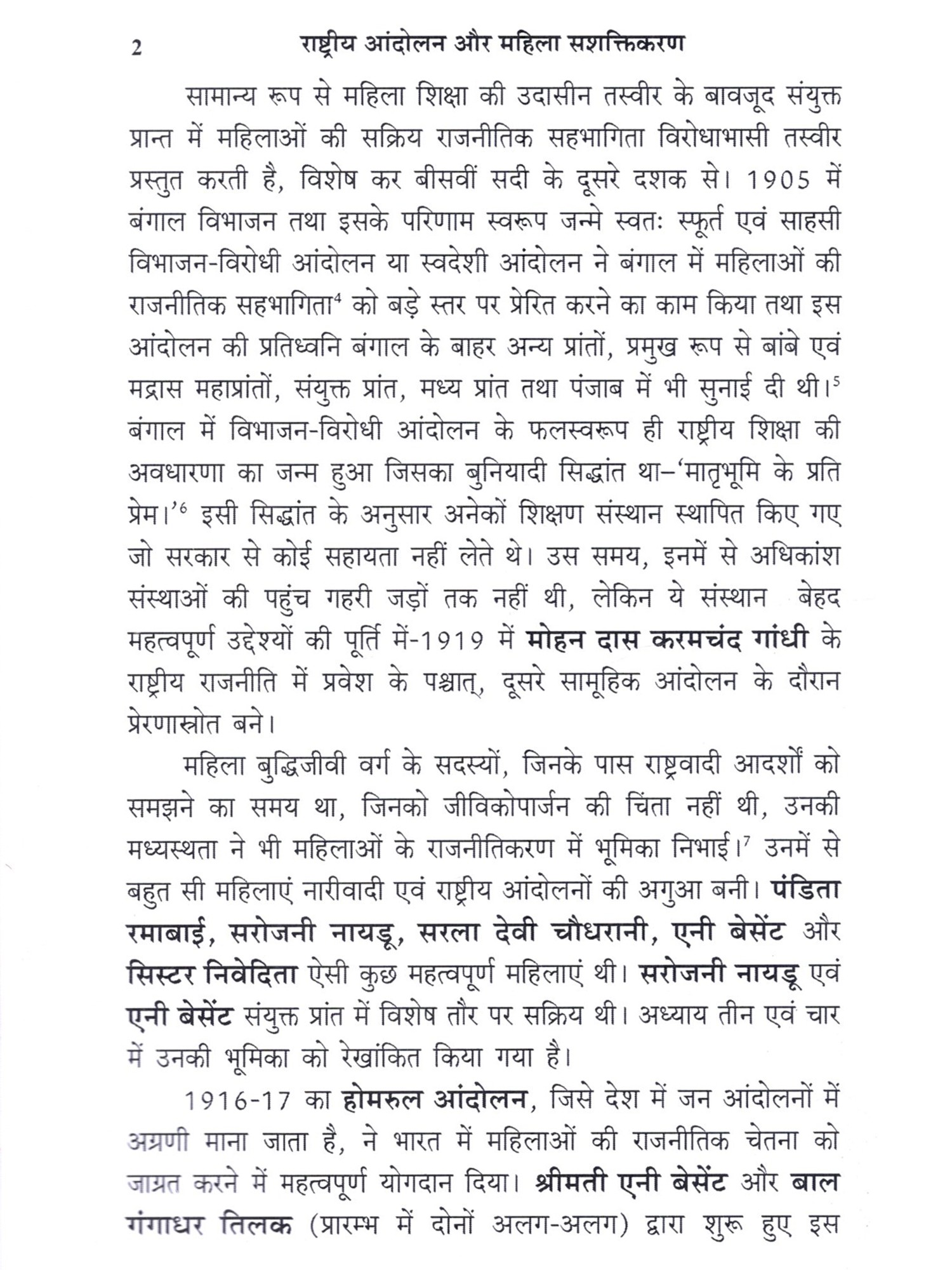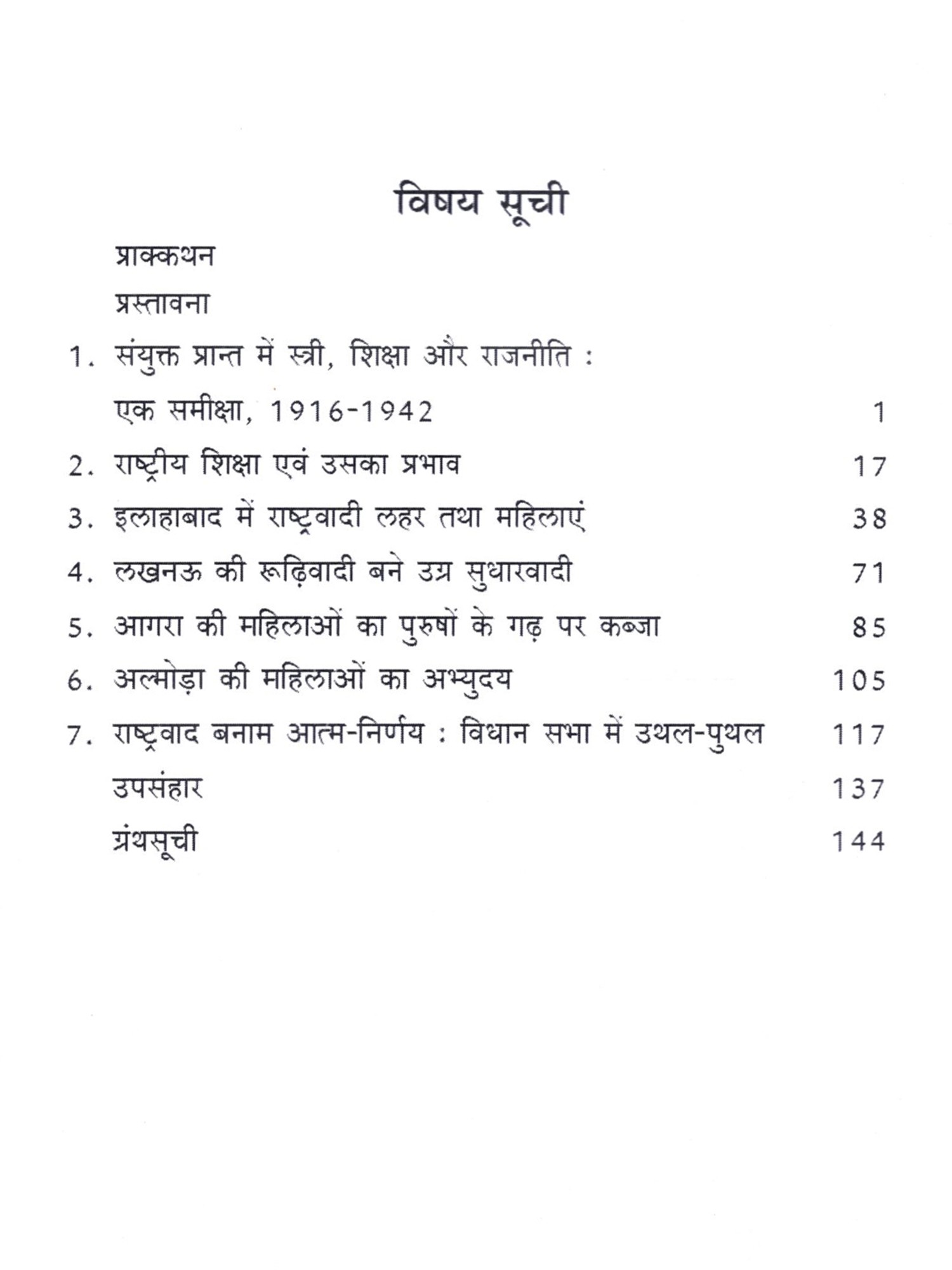 प्रस्तुत पुस्तक संयुक्त प्रान्त में महिलाओं के राजनीतिक सक्रियता, संगठन, तथा सहभागिता को नवीन दृष्टिकोण के साथ देखने का एक प्रयास है। पुस्तक में संयुक्त प्रान्त के संदर्भ में महिलाओं के शिक्षा स्तर तथा राष्ट्रवादी गतिविधियों में उनके सक्रियता के सम्बंध का अध्ययन किया गया है। इसके साथ ही तीव्र राष्ट्रवादी आन्दोलन के दौर एवं शैक्षणिक उपलब्धि के अन्दव एवं विस्तार के पारस्परिक संबंधों का अध्ययन भी शामिल किया गया है। पुस्तक में उल्लेखित दृष्टांतो से राष्ट्रवादी आंदोलन की सामाजिक गहराई, विशेषकर साधारण व मध्यम वर्ग के परिवारों और कुछ अंशों में 'अछूत' परिवारों, तक इसकी पहुंच स्पष्ट रूप से रेखांकित होती है। पुस्तक में वर्णित संयुक्त प्रान्त में महिला राजनीतिक सक्रियता की एक अन्य विशेषता यह भी है कि इसमे प्रान्त के चार जिलों- इलाहाबाद, लखनऊ, आगर। और अल्मोड़ा का विशेष विस्तृत अध्ययन भी है। संयुक्त प्रान्त के यह क्रमशः चारों क्षेत्रों-पूर्वी, केंद्रीय, पश्चिमी व उत्तरी भागों को दर्शाते हैं। पुस्तक का एक महत्वपूर्ण भाग महिलाओं द्वारा 1937-1939 के मध्य, प्रांतीय विधान सभा में किये गए वैचारिक व विधायी कार्यों को समर्पित है। एक स्वीकृत धारणा के विपरीत कि उन्होंने विधान सभा में कुछ भी उल्लेखनीय कार्य नहीं किया, यह पुस्तक रेखांकित करती है कि उनका कार्य असाधारण रहा, विशेषकर राष्ट्रवादी विचारधारा को परिभाषित और पोषित करते हुए नीति-निर्माण में उनका अतुलनी य योगदान रहा। 228 सदस्यीय विधान सभा में केवल 13 महिलाएं थी, यह देखते हुए उनका यह योगदान और भी उल्लेखनिय और सराहनीय प्रतीत होता है। यह पुस्तक राष्ट्र निर्माण की प्रक्रिया में संयुक्त प्रान्त की महिलओं के सकारात्मक भागीदारी को भी प्रकाशित करती है।