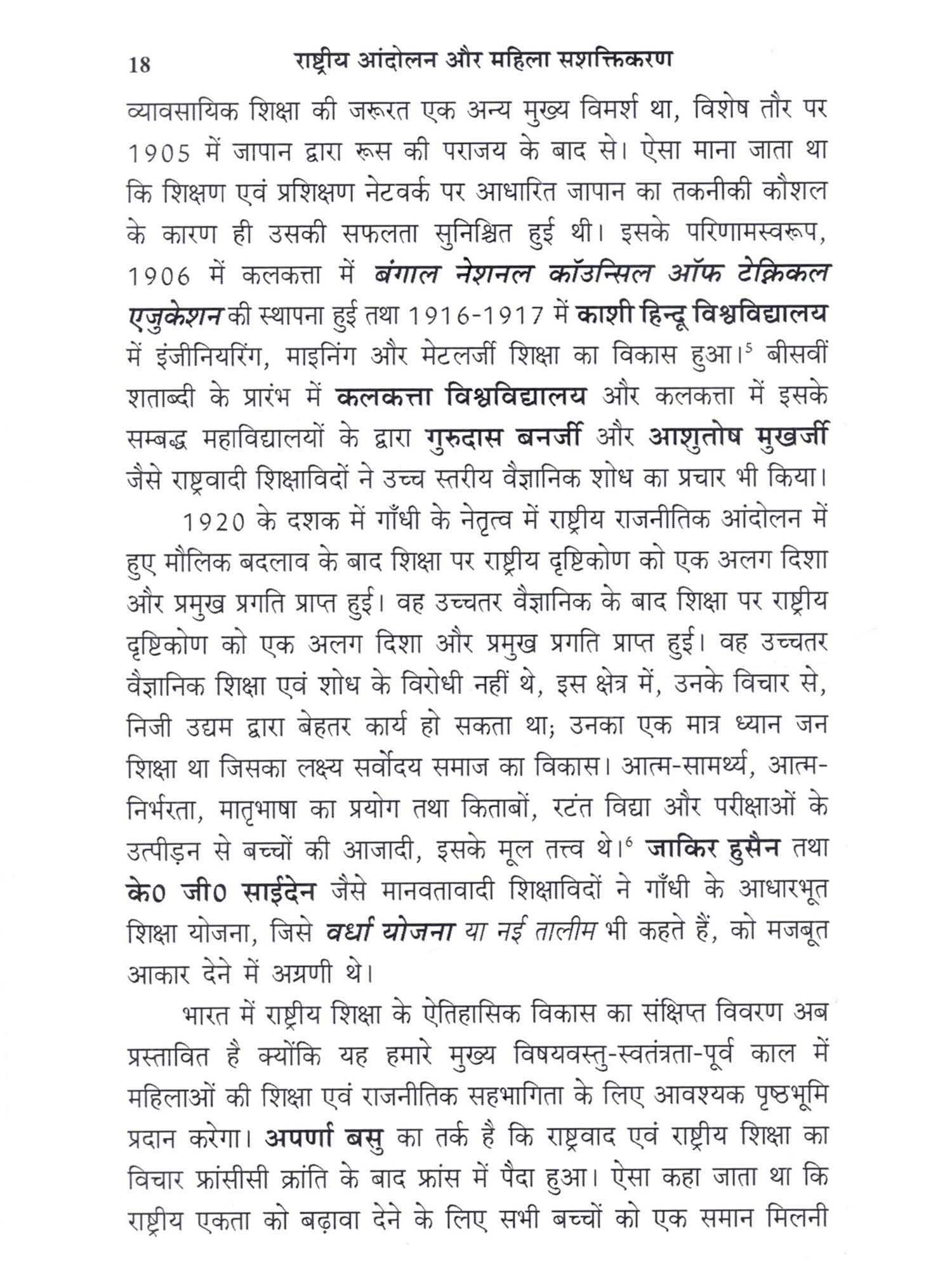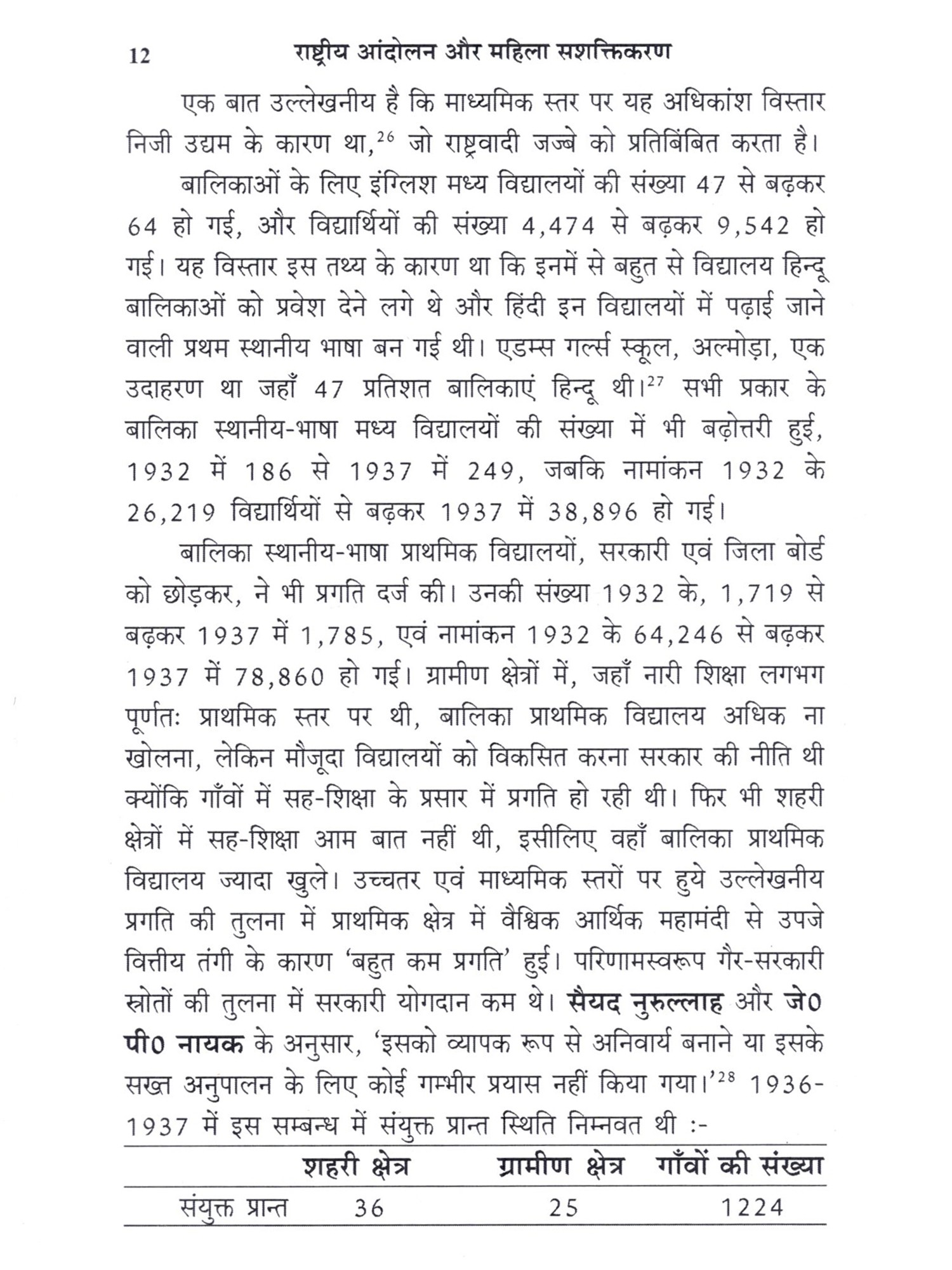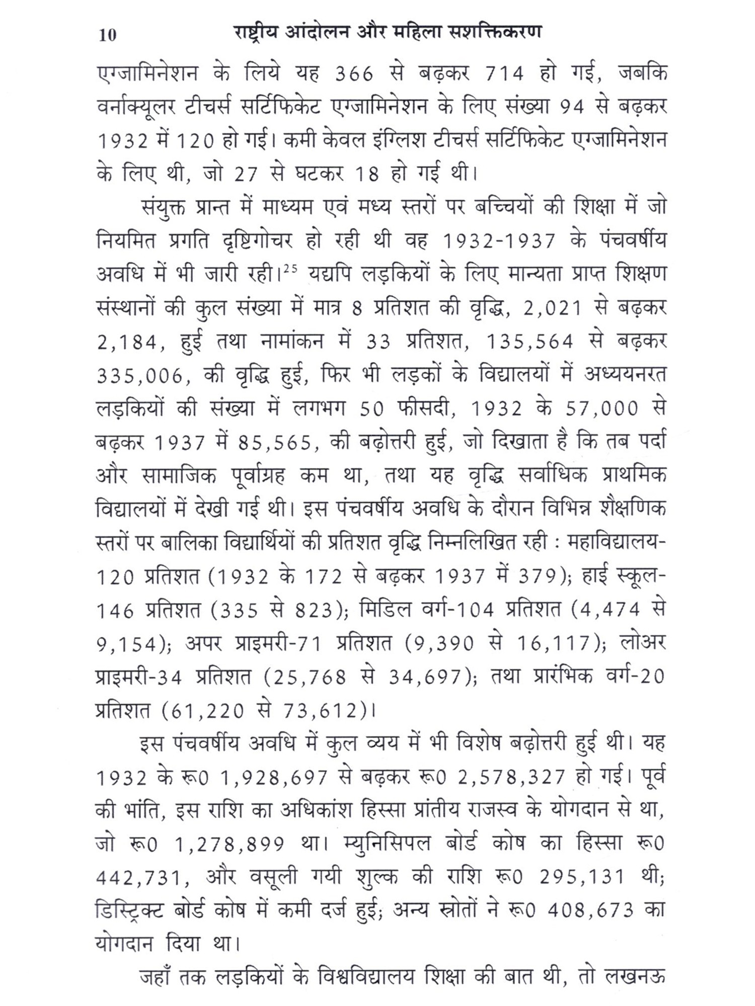 ब्रिटिश शासन के विरुद्ध भारतीय स्वतंत्रता संग्राम में महिलाओं के महत्वपूर्ण व निर्णायक योगदान को इतिहासकारों ने, प्रायः, मान्यता नहीं दी है। सामान्यतः विद्वान इस बात से सहमत है कि उनकी सहभागिता, संगठन तथा सक्रियता ने उनकी अपनी मुक्ति का मार्ग प्रशस्त किया, बहुत ऐसे भी है जो आज़ादी की लड़ाई में महिलाओं के विशिष्ट भूमिका को स्पष्ट शब्दों में स्वीकार नहीं करते।' इसी प्रकार, प्रसिद्ध विद्वान ज्ञानेंद्र पांडेय ने अपने श्रेष्ठ प्रबंध (मोनोग्राफ़) जो 1920 तथा 1930 के दशकों में संयुक्त प्रान्त (वर्तमान, उत्तर प्रदेश) में कांग्रेस की 'प्रभुत्व स्थापना' से संबंधित है, में एक पैरा भी इस विषय को समर्पित नहीं किया है। विख्यात इतिहासकार विपन चंद्र ने भी भारतीय स्वतंत्रता संघर्ष पर आधारित अपनी विश्रुत रचना में भी इस पक्ष पर विशेष प्रकाश नहीं डाला है। शिक्षा और राजनीतिक गतिविधि के बीच संबंध स्वतः स्पष्ट है तथा इसे समूचे विश्व में स्वीकार किया गया है। ब्रिटिश भारत में, 20वीं सदी के प्रारंभिक दशक तक, संयुक्त प्रान्त शिक्षा तथा राजनीतिक संगठनों के मामले में बंगाल, बॉम्बे तथा मद्रास प्रेसिडेंसियों से पिछड़ा हुआ था। इन तीनों प्रेसिडेंसियों में महिलाओं की शिक्षा तथा उनकी राजनीतिक सहभागिता के बीच अंतर्संबंधों पर पर्याप्त शोध हुआ है परंतु संयुक्त प्रान्त में इस विषय पर हाल ही में शोध-कार्य शुरू हुआ है। इसलिए संयुक्त प्रान्त में महिला शिक्षा के विस्तार तथा उनकी राजनीतिक सहभागिता के विशेष संदर्भ पर केंद्रित परीक्षण आवश्यकप्रतीत हुआ। बंगाल, बॉम्बे तथा मद्रास प्रेसिडेंसी, संयुक्त प्रान्त से दशकों पहले प्रत्यक्ष ब्रिटिश शासन के अधीन आ गए थे। ब्रिटिश शासन की पूर्व संध्या पर, स्वदेशी शिक्षा प्रणाली देश के कुछ अन्य भागों में जीवंत होते हुए भी, संयुक्त प्रान्त में जर्जर अवस्था में ही थी। ब्रिटिश प्रशासन की राजस्व नीतियों तथा शिक्षा क्षेत्र में देशी प्रयासों के प्रति ब्रिटिश सरकार की उपेक्षा के कारण भी स्वदेशी शिक्षा व्यवस्था का और अधिक पतन हुआ। इसके अतिरिक्त, राज्य द्वारा स्थापित या सहायता प्राप्त प्राथमिक व माध्यमिक शिक्षा व्यवस्था का विकास अत्यंत धीमी गति से हुआ क्योंकि शिक्षा कभी भी औपनिवेशिक शासन की प्राथमिकता नहीं थी, भले ही उनकी घोषित नीति इसके विपरीत थी। परिणामस्वरूप, संयुक्त प्रान्त में शैक्षणिक शून्यता की स्थिति बन गयी। एक तथ्य यह भी था कि ब्रिटिश शासन के पहले के सामाजिक रवैये के कारण से भी स्त्री शिक्षा की अवहेलना की जाती थी। अतः नारी शिक्षा को समर्पित अत्यल्प संसाधनों को इस शून्यता में और धक्का लगा। इस मामले में, ब्रिटिश हुकूमत का विचार भी यहाँ के शासित पितृसत्ता के सामाज