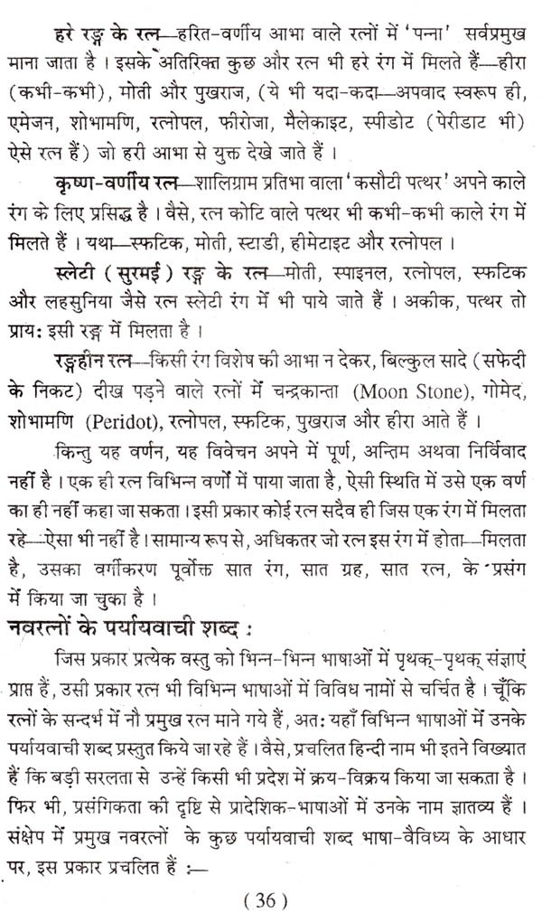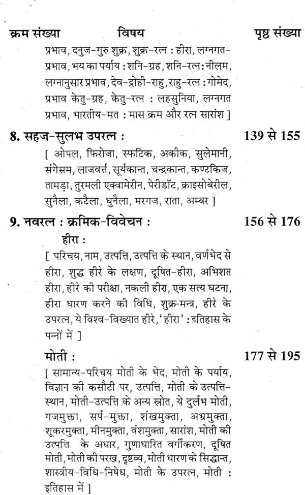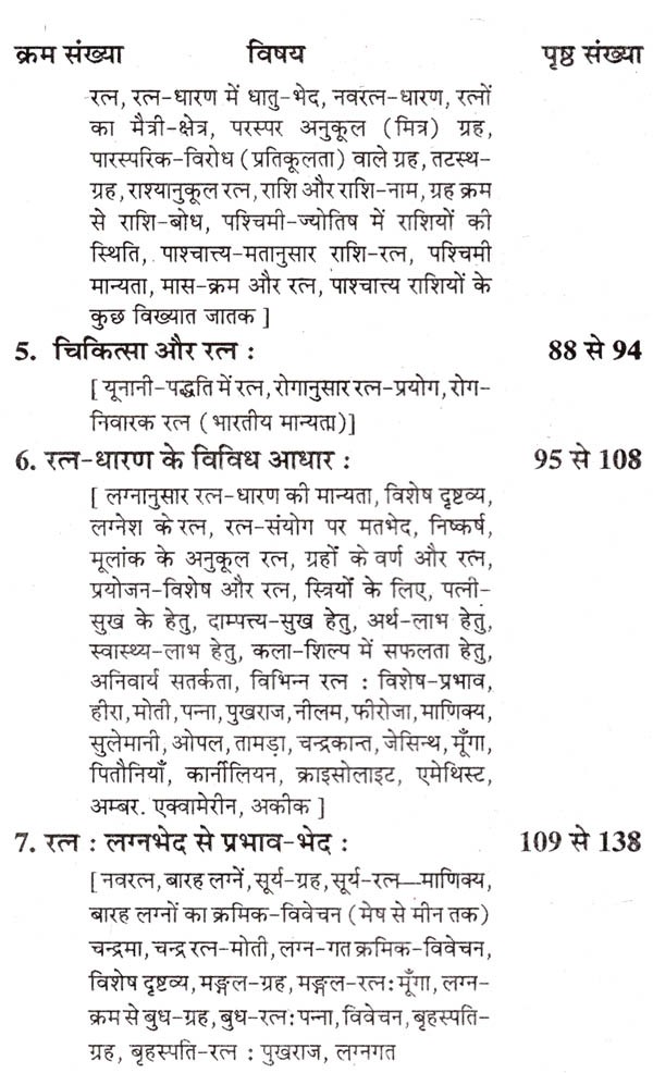 भारतीय-मनीषियों (चिन्तकों) ने लोक हित की भावना से प्रेरित होकर गहन समाधि की अवस्था में मानव जीवन, प्रकृति और परमपिता परमात्मा के गूढ़ रहस्यों का चिन्तन-मनन अपनी दिव्य दृष्टि से किया और परिणाम-स्वरूप आकाशीय पिण्डों (ग्रह-नक्षत्र आदि) का सूक्ष्मतम रहस्य-प्रस्तर खण्डों (रत्नों) पर पड़ने वाला प्रभाव-उजागर हुआ । मानव-समाज ने जब 'रत्न' धारण करके उनके प्रभाव को प्रत्यक्ष देखा तो चमत्कृत होकर, मनीषियों के शोध के प्रति नतमस्तक हो उठा। परिणामतः पृथ्वी के प्रत्येक भाग (देश-विदेशों) में 'रत्न-धारण' की प्रथा लोक-प्रिय हो उठी ! देश, धर्म, जाति, शिक्षा, अशिक्षा की संकीर्ण परिधियों के प्रभाव से सर्वथा दूर रहते हुए, रत्नों के प्रभाव को समूची मानव जाति ने स्वीकार किया ! प्रस्तुत ग्रन्थ में उन्हीं रत्नों, उप-रत्नों की उत्पत्ति, उन पर पड़ने वाला ग्रह प्रभाव, उनके उत्पत्ति स्थान तथा धारण करने की विधि का विस्तारपूर्वक वर्णन-मनोहारी ढंग से करने का प्रयास किया गया है। रलों से सम्बन्धित कोई जानकारी छूट न जाय, इसके लिए पूरी सतर्कता बरतते हुए, पुस्तक को सर्वांगपूर्ण बनाने का भरसक प्रयास किया गया है। जो पाठक 'रत्न-रहस्य' से सर्वथा अपरिचित हैं, उनके लिए तो यह ग्रन्थ आश्चर्यचकित कर देने वाला सिद्ध होगा ही, जिन्हें रत्नों के विषय में पर्याप्त ज्ञान है, वे ही इसमें कुछ न कुछ नयी जानकारी अवश्य प्राप्त करेंगे और एक ही ग्रन्थ में सब कुछ (All In One) पाकर पुस्तक को बेहद पसन्द करेंगे-मुझे यह पूरी आशा है।
