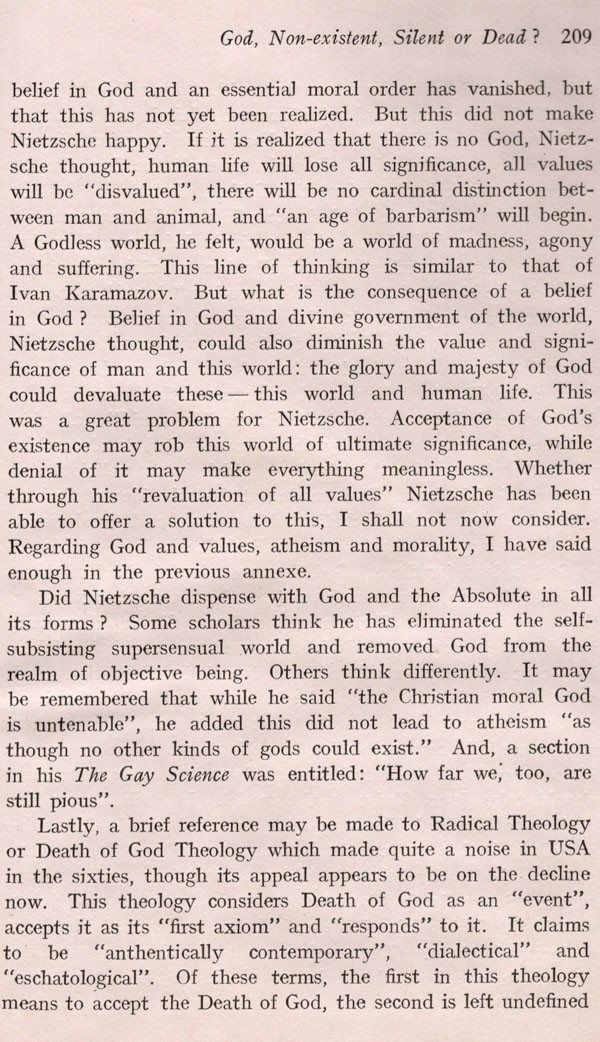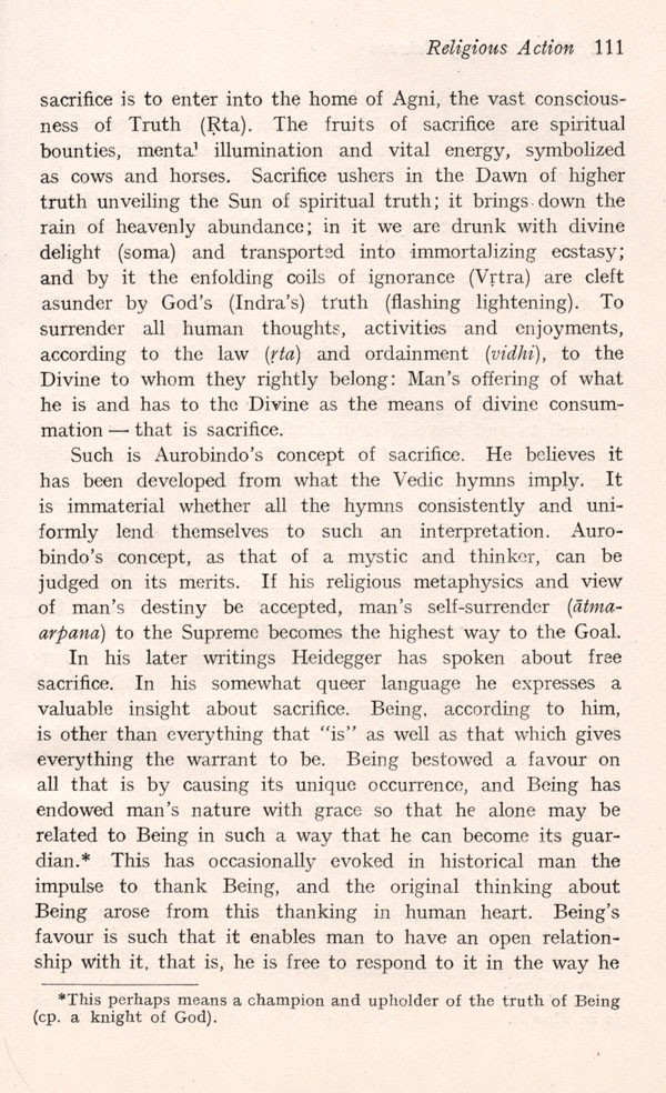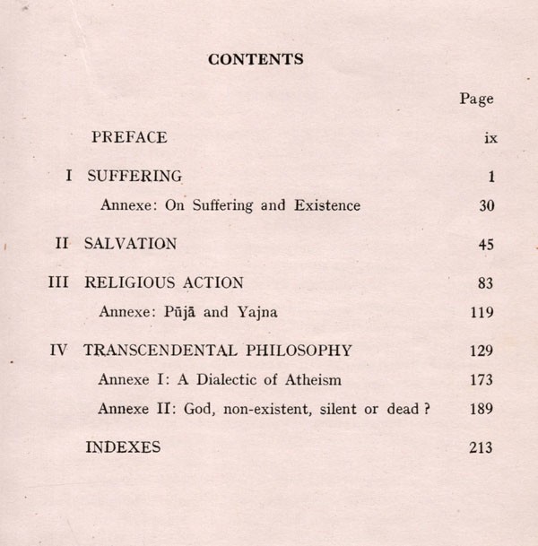 The third chapter is concerned with two basic forms of religious action - sacrifice and worship. Sacrifice is giving up of what one has leading to transformation of life, while worship is taking refuge in God with the prayerful thought that one in sinful, naught, and helpless and that. He is the only means of salvation. The fourth chapter grapples with the questions of God's existence, non-appearance, silence, absence and death, and the dialectic of atheism and the relation between religion and ethics. A few arrive at an awareness of Being, while to some others it is revealed as a Person; but most of us have to be satisfied with believing what cannot be proved, and it is a glorious risk - a great wager - to have faith in the Unconditioned Being or the Supreme Person. But atheism does not necessarily lead to the deification of man or history or to immorality; nor is it true that "there is no virtue of there is no immortality". Without a belief in God or immortality some can live, endure, and meaning, and engage themselves in ethical endeavours of the highest type.