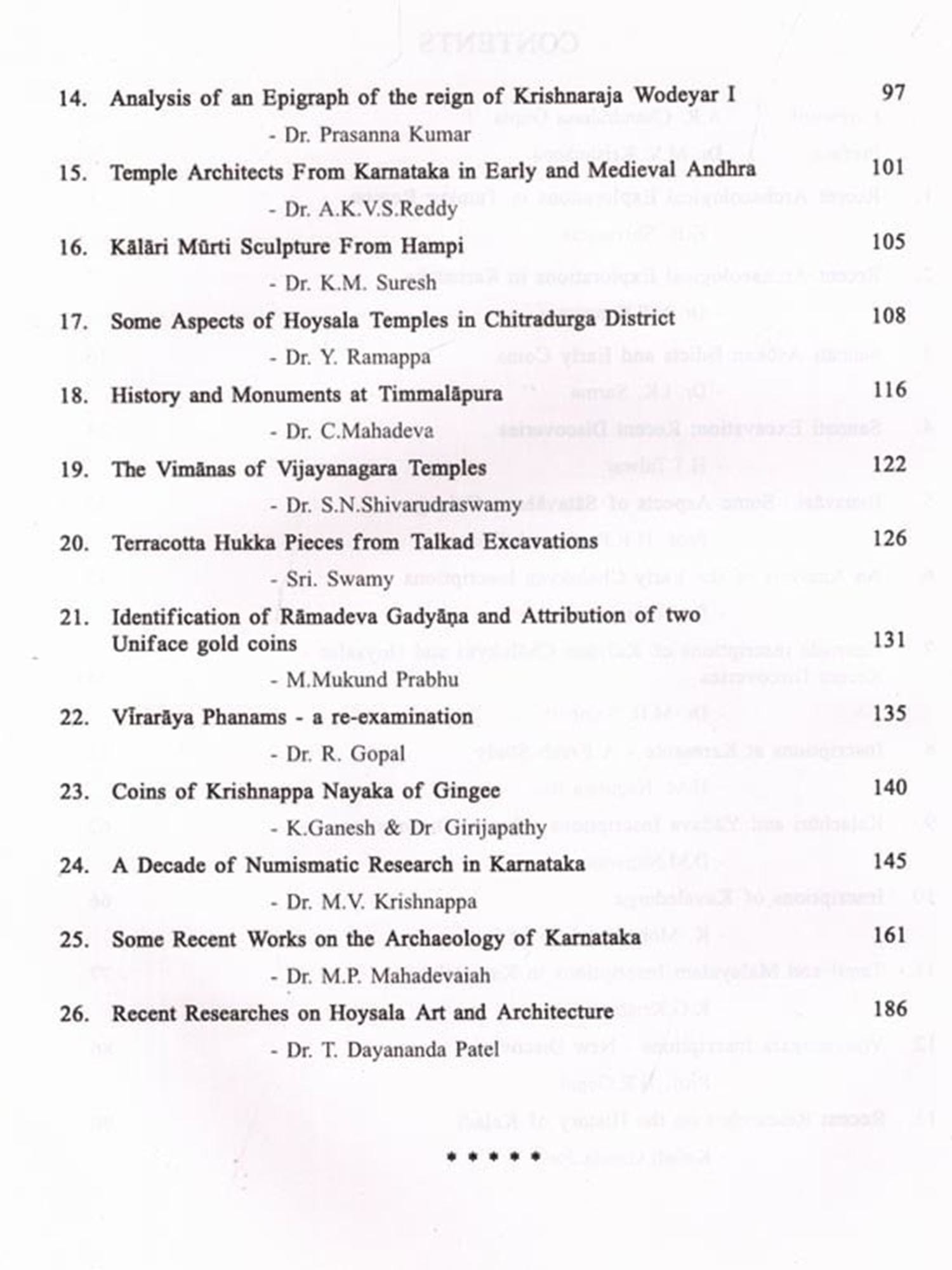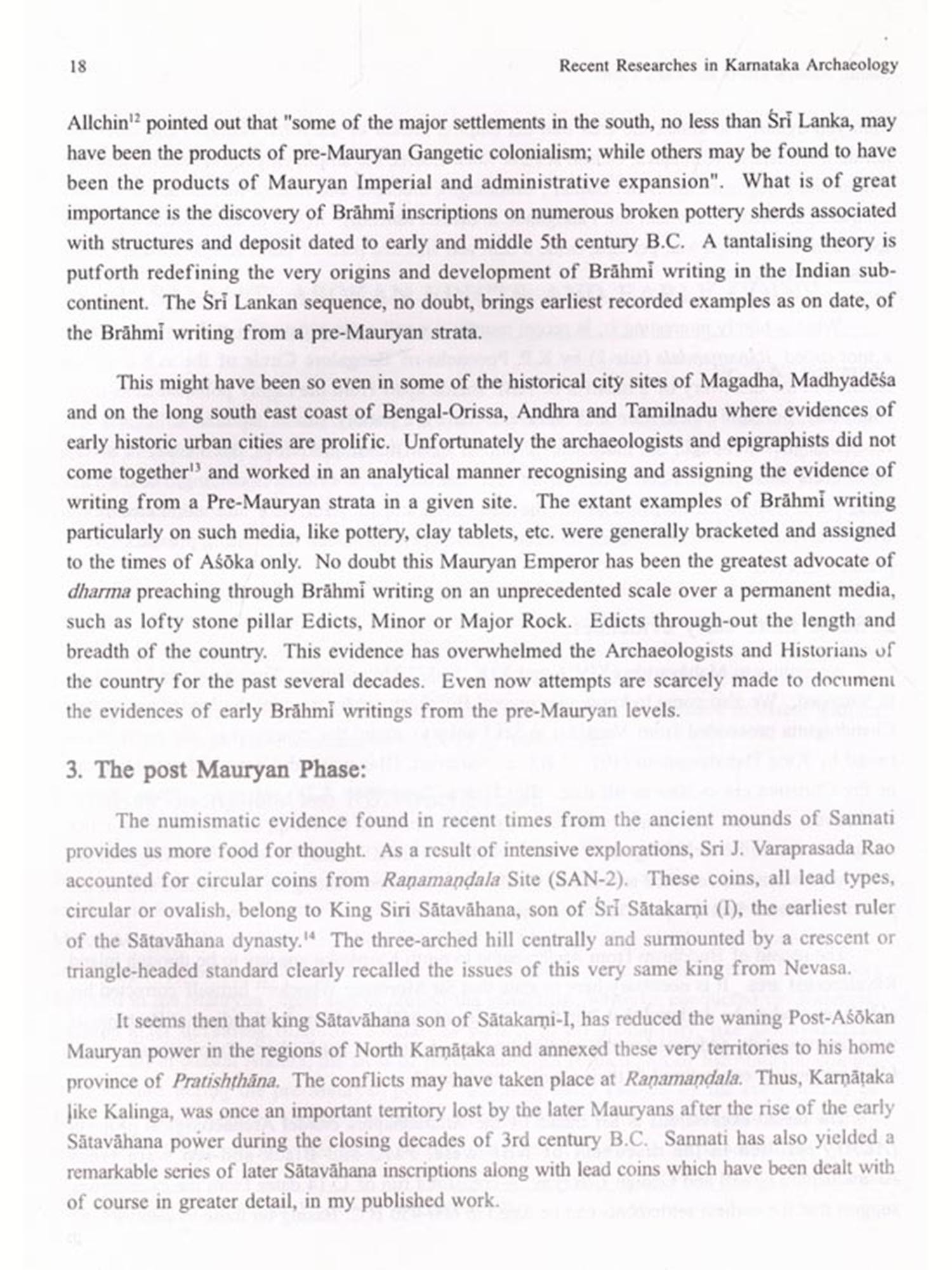 The progress of Archaeology in Karnataka has been assessed twice before, once in 1973 and the second time in 1985, by arranging seminars. The first seminar was arranged by Prof. A.V. Narasimha Murthy, under the auspices of the Mysore University and its proceedings have been published under the title Archaeology of Karnataka (1975). The second seminar was by Prof. A. Sundara under the Directorate of Archaeology and Museums in the year 1985 and the proceedings have been published by this Directorate. Exactly after a decade Dr. D.V. Devaraj arranged the third seminar on the same theme. In fact this seminar coincided with the felicitation and farewell to Dr. A.V. Narasimha Murthy on the eve of his retirement from the University Service. The learned professor's contribution to the different branches of archaeology such as excavation (Talkad, Banavasi, Heggadehalli and Koppa), epigraphy, numismatics and art is well known and need not be repeated here. Though active even now, his formal retirement marks the end of an era in Karnataka archaeology. This seminar provided an opportunity to learned scholars to present their latest researches on different branches of Karnataka archaeology. This volume contains research papers presented at the seminar.