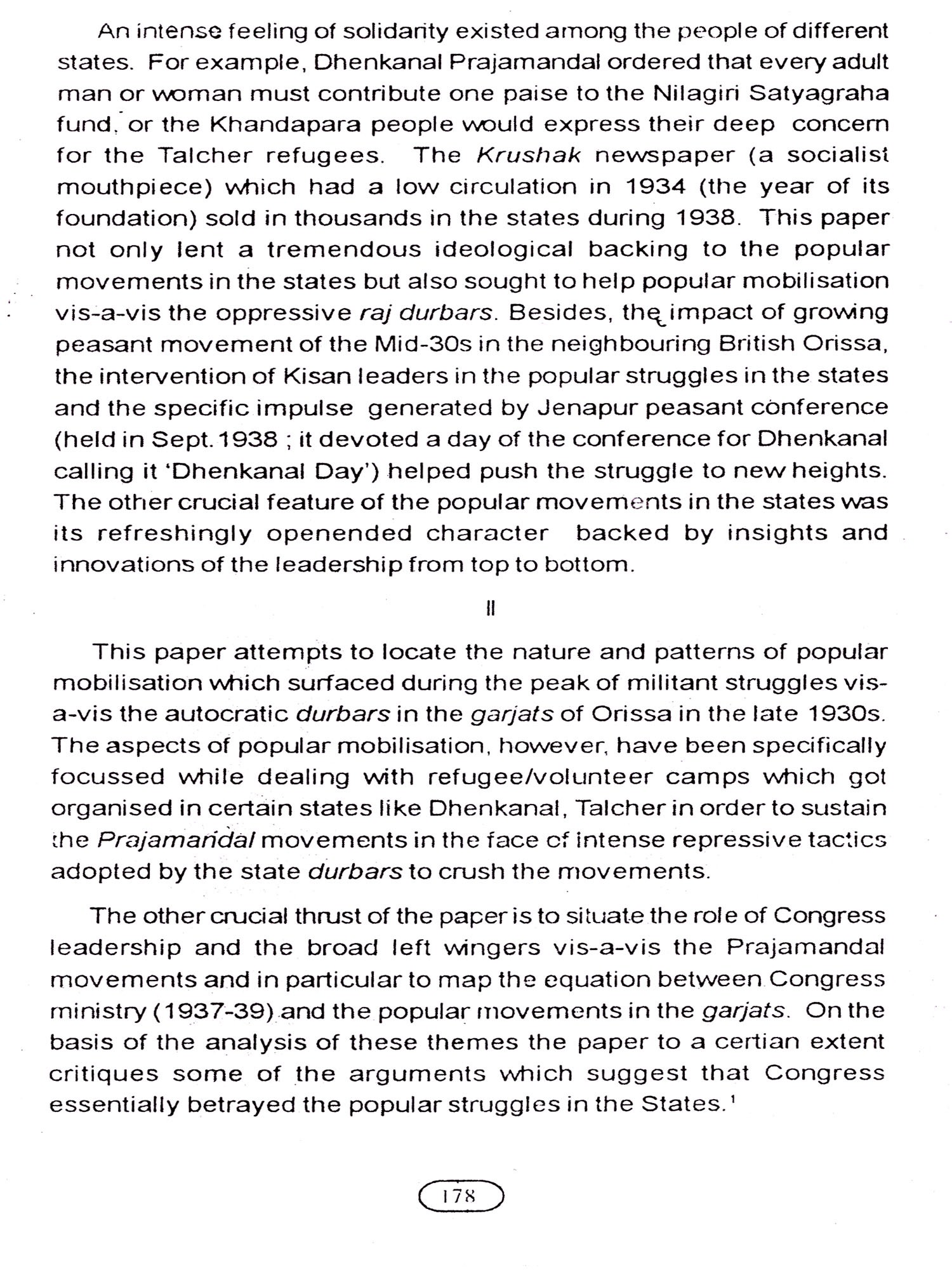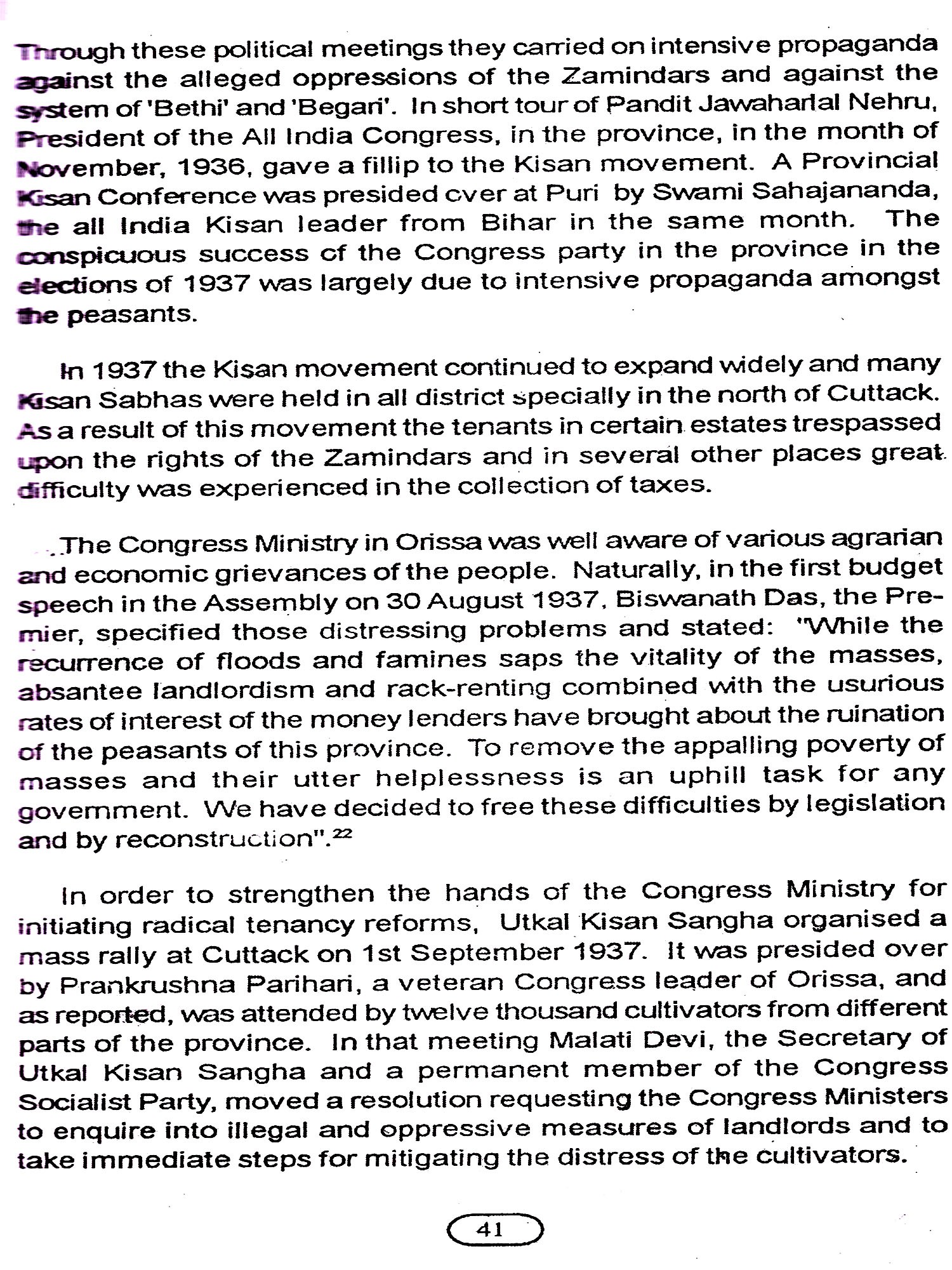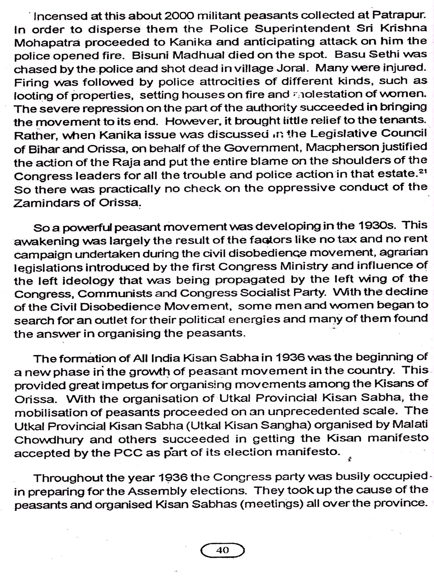 After fifty years of independence it has become imperative on our part to recollect the memorable phases of the national movement in Orissa, when popular protest was combined with socio-economic programmes. The leaders not only started agitations, they had undertaken constructive socio economic programme for the making of modern Orissa. Historiography on national movement in Orissa demands in depth study of participation of the people in general, tribals and peasants in particular. Nature of the participation of many rural leaders needs to be emphasized. Old perceptions on the study of the national movement need to be revised and changed.