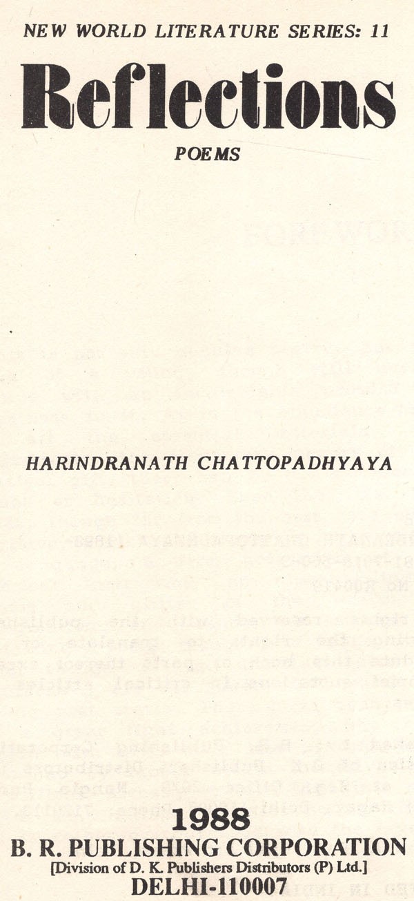 Harindranath's Reflections are the reflections of a many di mensional sun of consciousness on the mirror like lake of a creative mind. They inspire in us many a mood. They make us wonder afresh on things we thought we knew well and bring issues and ideas hitherto considered remote closer to our nearest. One feels grateful for the facts that such reflections are still undertaken. The poet had the unique privilege of living in the Ashram of Sri Aurobindo at Pondicherry, in his early phase, when he could draw the Master's attention to his aspirations. Though these Sparkling Reflections must have become prominently formed much later, they had been ignited at this stage of his life. Whatever be their chronology, one comes across in them impressive flushes which can be linked to Sri Aurobindo's vision of man's evolus ionat v journey.
