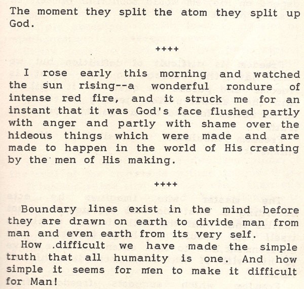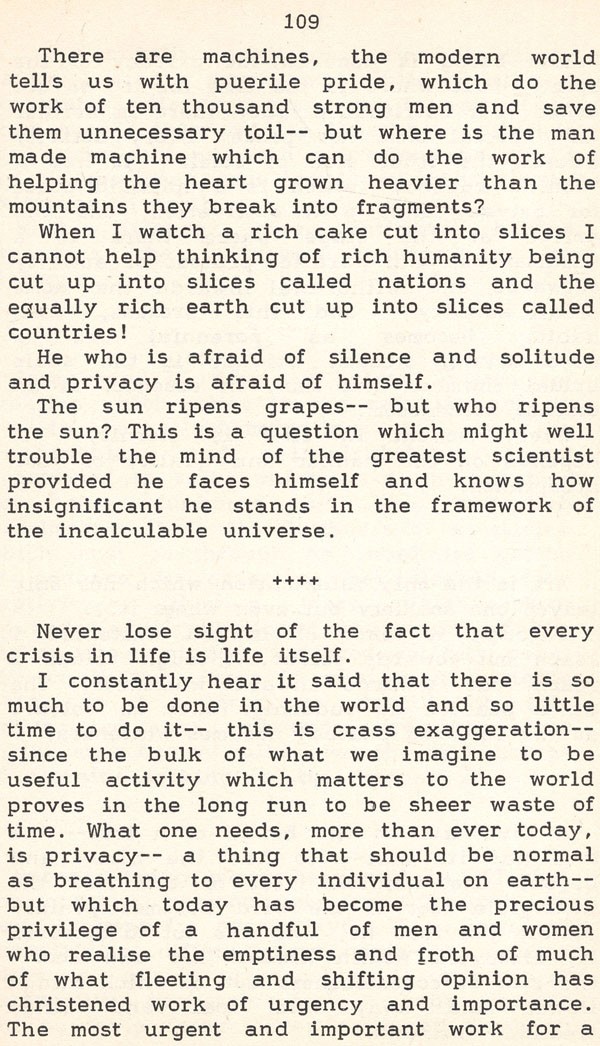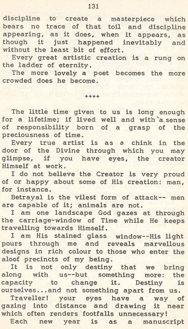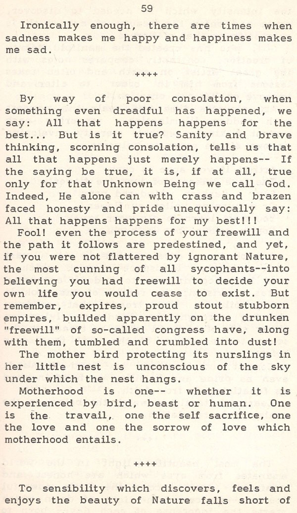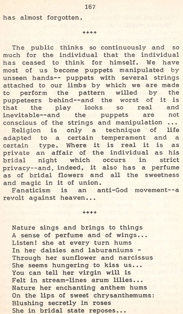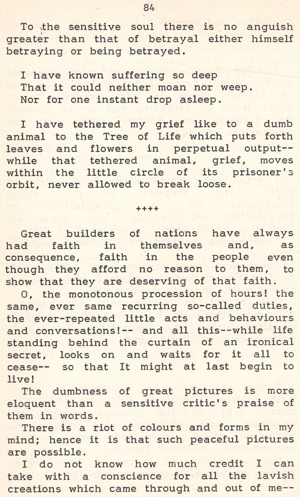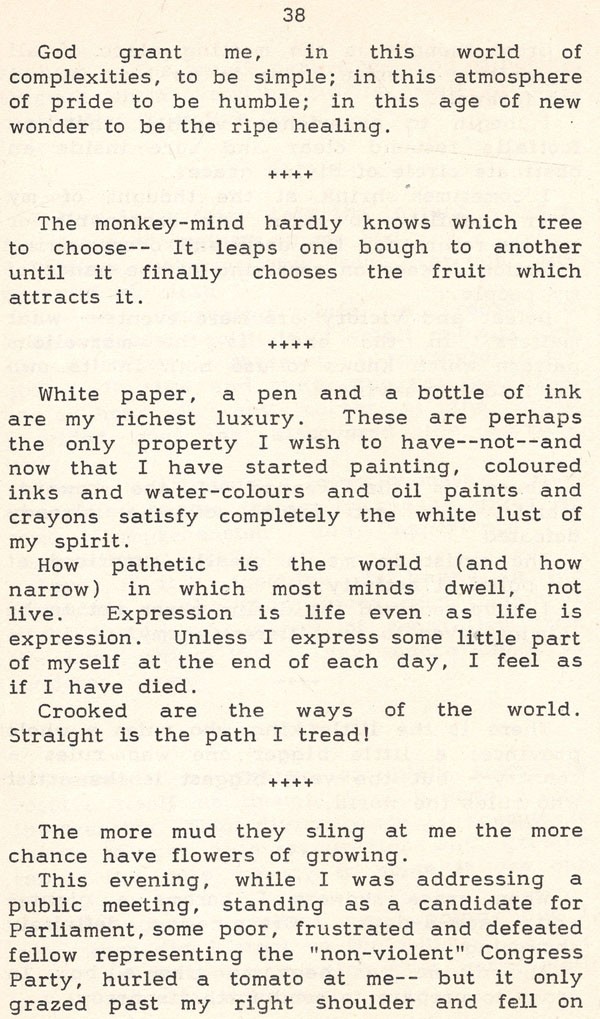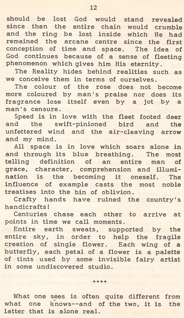 "This is not only genuine poetry, but the work of a young, though still unripe genius with an incalculable promise of greatness in it. As to the abundance here of all the essential materials, the instruments, the elementary powers of the poetical gift, there can be not a moment's doubt or hesitation. Even the first few lines, though far from the best, are quite decisive. A rich and finely lavish command of language, a firm possession his of metrical instrument, an almost blinding gleam and glitter of the wealth of imagination and fancy, a stream of unfailingly poetic thought and image and a high though as yet uncertain pitch of expression, are the powers with which the young poet starts. There have been poets of a great final achievement who have begun with gifts of a less precious stuff and had by labour within themselves and a difficult alchemy to turn them into pure gold. Mr. Chattopadhyaya is not of these; he is rather overburdened with the favours of the goddess, comes like some Vedic Marut with golden weapons, golden ornaments, car of gold, throwing in front of him continual lightnings of thought in the midst of a shining rain of fancies, and a greater government and a more careful and concentrated use rather than an enhancement of his powers is the one thing his poetry needs for its perfection." This is the tribute-- a rare treat indeed- which Harindranath received from Sri Aurobindo who reviewed his first book of poems, The Feast of Youth, in the Arya of November, 1918. Sri Aurobindo found in him a spontaneous and inherent poetic gift of high quality which he expected to flourish in the course of time. To what extent Harindranath has justified this expectation is a question that should be left for another time. All we know is, his has been a restless soul travelling from pasture to pasture-- though whether from pasture old to pasture new or vice versa is again another question to be examined. He had the unique privilege of living in the Ashram of Sri Aurobindo at Pondicherry, in its early phase, when he could draw the Master's attention to his aspirations. My feeling is, though these sparkling "Reflections" must have become prominently formed much later, they had been ignited at this stage of his life. Whatever be their chronology. One comes across in them impressive flashes which can be linked to Sri Aurobindo's vision of man's evolutionary journey: "Out of the rough black stone of animal desires and propensities man appears slowly but surely, losing the dark hue and chiselled into the higher being by the hand of error whose blows are myriad and terrible. "Dogma is the bane of the intellect holding it in thrall withdrawing it from the plasticity of spiritual illumination. "I cannot help beginning to believe that humanity, which is the sum total of individuals, is as a mountain possessing a base which slowly rises to a peak which it supports- It is a graph which rises and falls through the ages; it is at the apex of its upward movement that the great are born-- while, at the same time, a broad mediocrity remains at the base by way of support. The small peak-measuring minority through whom evolution fulfils itself thereby continuing to evolve." This theme is distinct in one of his early poems, Futurity. Time is Eternity's womb-hole ensconcedly bearing Each man like a foetus information projected Warmed into ripeness conceived by some far evolution; Sealed grave-lids of eyes, strange image of funeral pathos, Rawness of limb awaiting the strength of a giant Moment of master-maturity, rounding of motive, Sidereal substance, stranger to dream and delirium.