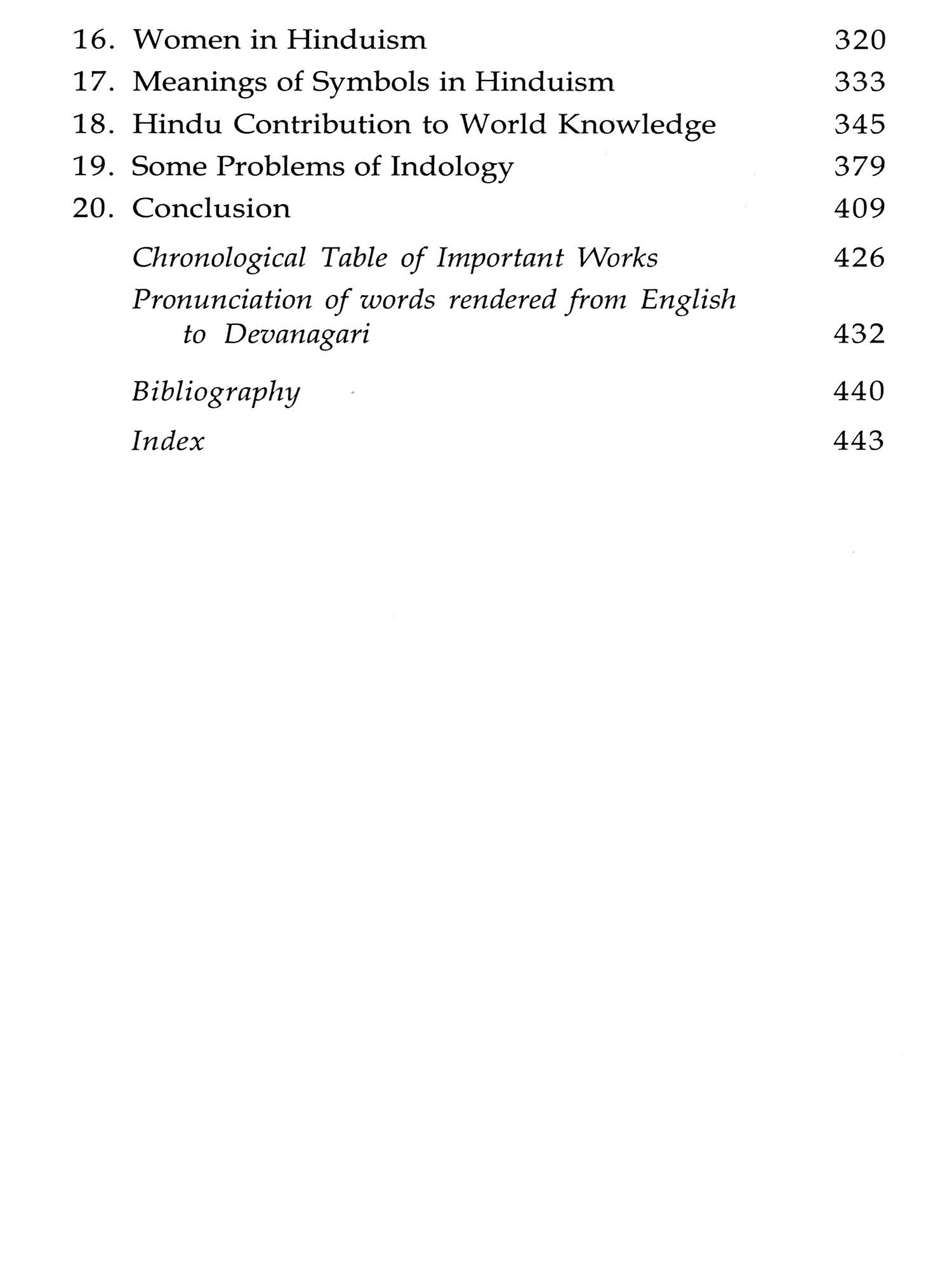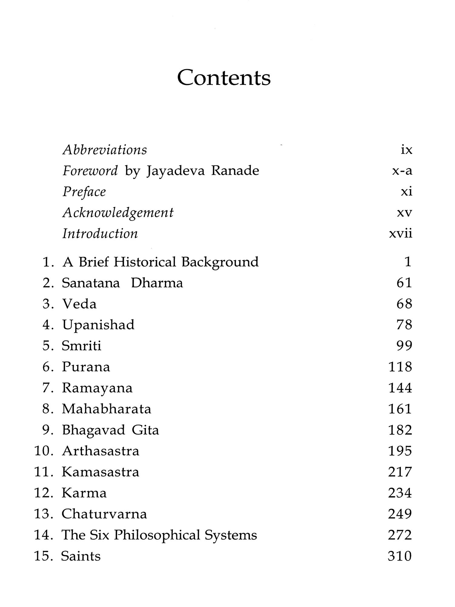 This book consists of twenty chapters apart from the Introduction. The chapters are, A Brief Historical Back-ground, Sanatana Dharma, Veda, Upanishad, Smriti, Purana, Ramayana, Mahabharata, Bhagavad Gita, Arthasastra, Kamasastra, Karma, Chaturvarna, The Six Philosophical Systems, Saints, Women in Hinduism, Meanings and Symbols in Hinduism, Hindu Contribution to World Knowledge, Some Problems of Indology and Conclusion.