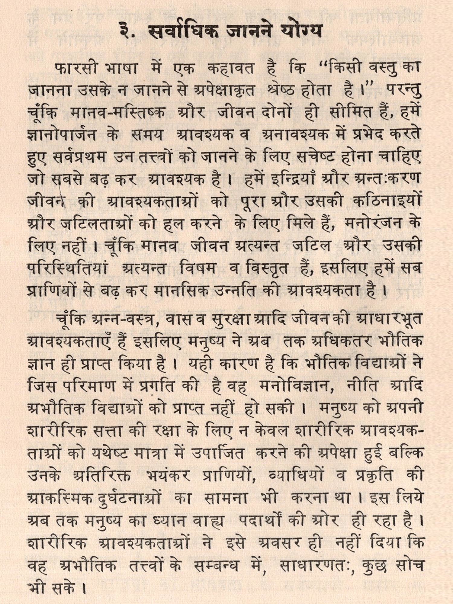 सूर्योदय होते ही समस्त कृत्रिम दीपक अनावश्यक हो जाते हैं। इसी प्रकार जीवन-ज्ञान का उजियारा परम्परागत अनेक मतों को अर्थहीन बना देता है। अब समय आ गया है कि हम स्वरूप में जागृत होकर स्ववर्म पालन करना सीखें और क्रम-विकास द्वारा प्राप्त अपनी पैतृक पाशविकता से नियन्त्रित होने के स्थान पर इसे अपने मानवीय उद्देश्यों की सेवा में लगा दें।