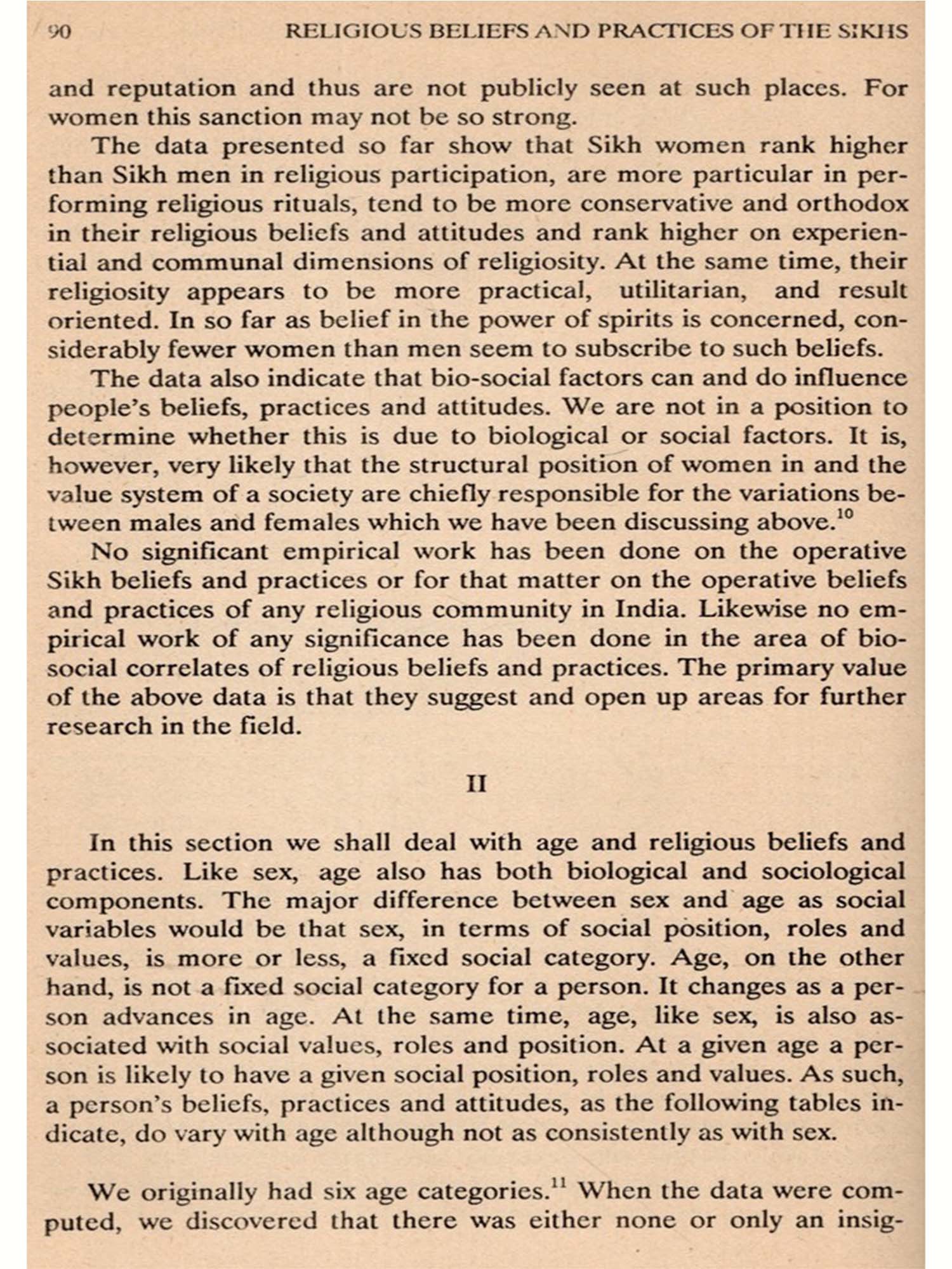 Religious beliefs and practices, at least in theory, are considered to be central to any religious system, though religion is much more than a set of beliefs and practices. Theologically, a religion may be reduced to the study and discussion of the value, nature, origin and validity of its beliefs and practices. From a sociological perspective, however, religion and society have a dialectical relationship, and religious beliefs and practices are social facts. The present study of the Sikh religious community attempts to investigate the location of religious beliefs and practices in that people's social life, their bio-social correlates and their centrality in creating a world view and religious communities.