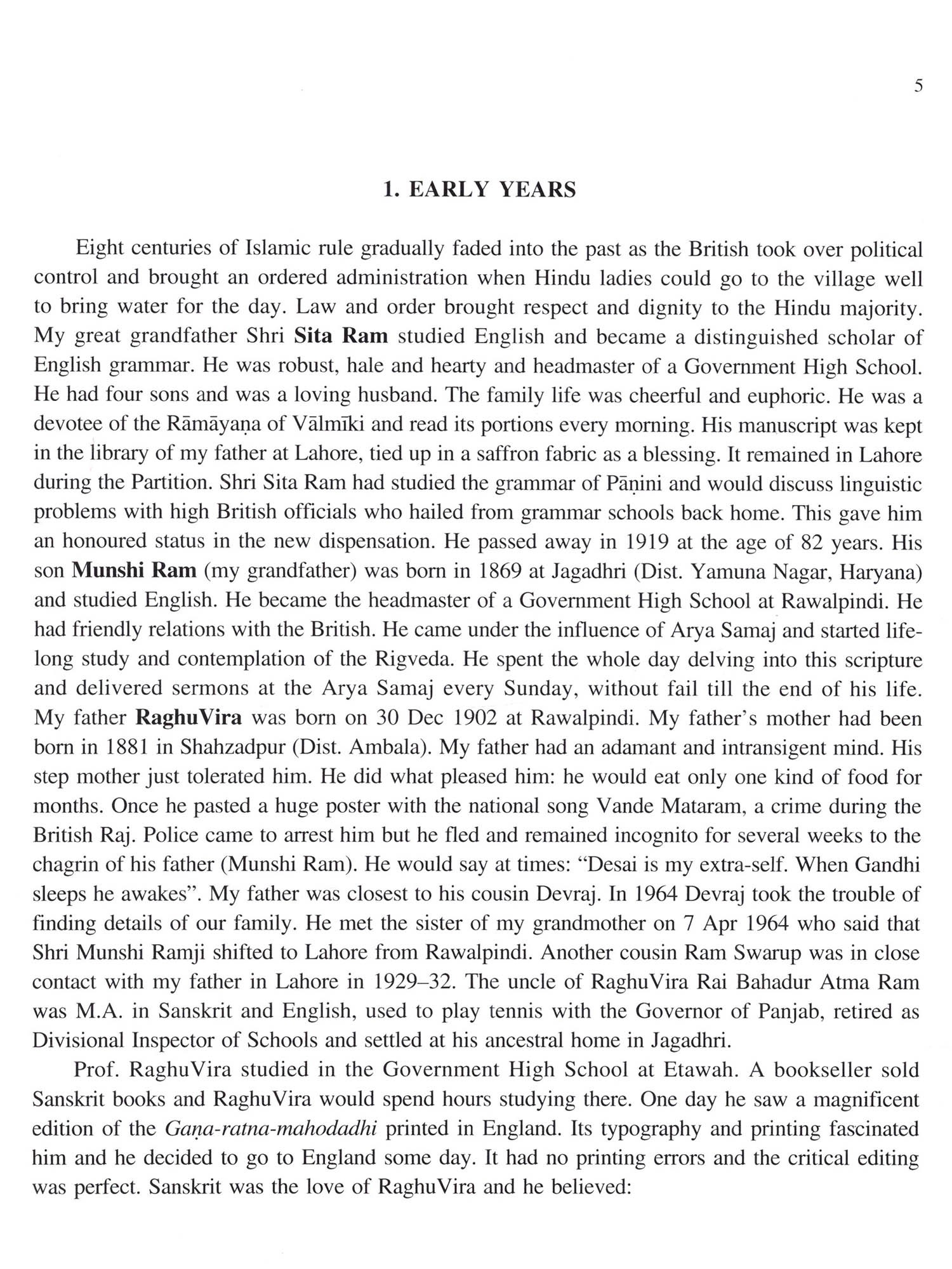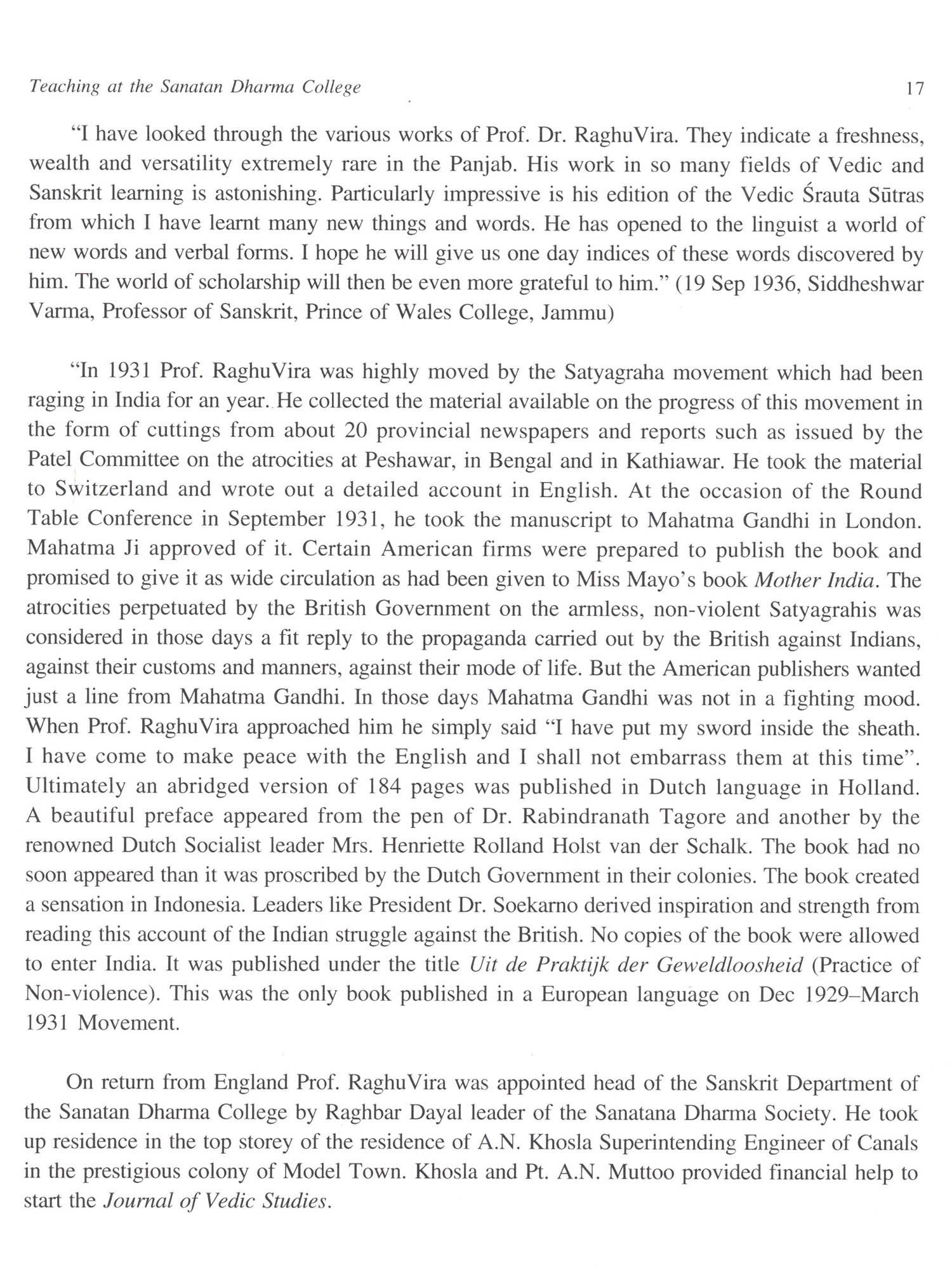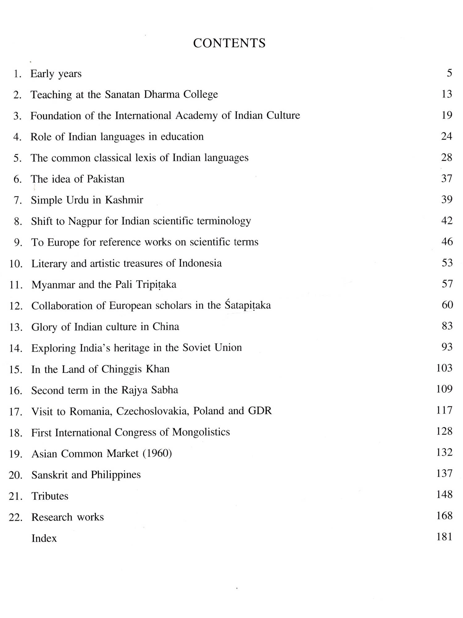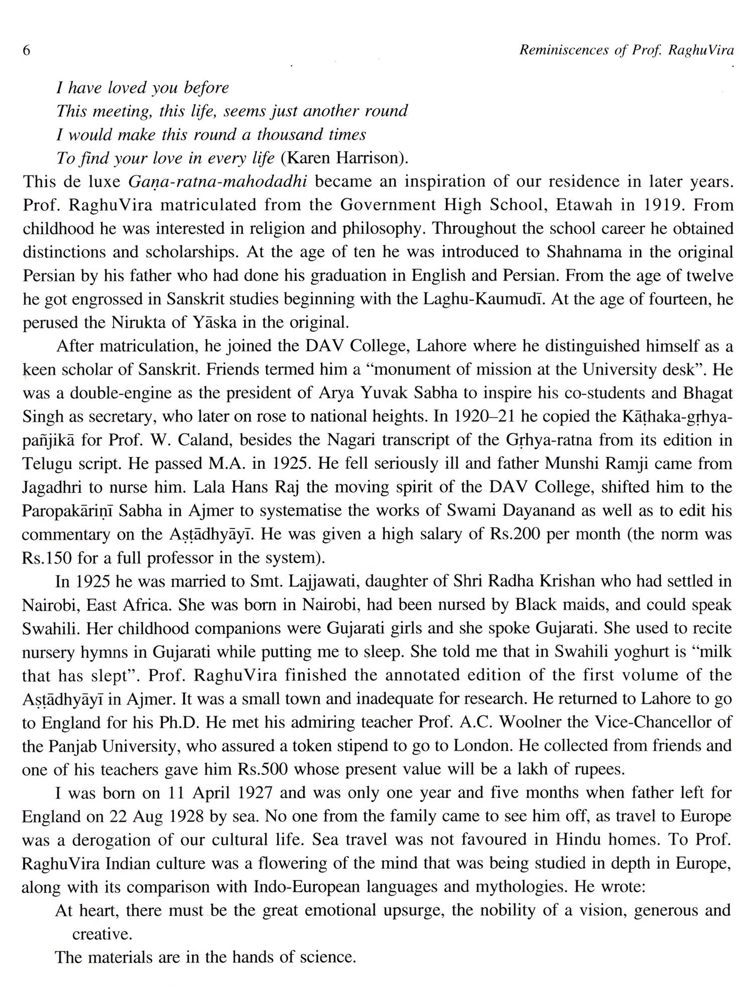 Reminiscences of the life and work of Prof. Raghuvira by his son Prof. Lokesh Chandra begin with a sketch of family history, his fascination by the perfect edition of the Gana-ratna-mahodadhi printed in England became as an inspiration to study Indology in London, besides Indo-European linguistics and modern Lithuanian where Rigvedic dhend are alive as daina. He studied Mongolian as the Mongols were the only Asians to have ruled in Europe. Did his first doctorate at Utrecht and the second at the SOAS London. Headed the Sanskrit Department at the Sanatan Dharma College, Lahore. Founded the International Academy of Indian Culture on 1 Jan 1934. Started the Journal of Vedic Studies and Panjabi Prakash in Gurumukhi script. Received two Japanese students to study Sanskrit in India for the first time inspite of the 1400 years of Indo-Japanese cultural nexus. Led a nation-wide campaign for Hindi. Created a comprehensive Indian administrative and scientific terminology of 150,000 technical terms with the support of the Govt. of Madhya Pradesh from 1947 onwards. A substantive part has become the integral vocabulary of India's languages, like Sansad for Parliament. Visited Europe to collect dictionaries of scientific subjects in around a hundred disciplines. Started the Satapițaka series for editions of texts and scientific studies of countries with a shared cultural hegemony with India, like Tibetan, Mongolian, Chinese, Japanese, Old Javanese and Uigur Turkish. European scholars came to the Academy to cooperate: "The number of publications is amazing not only in quantity but also in quality" (Prof. J.G.de Casparis). Prof. Raghuvira visited China in 1955, and brought back ten tons of culture. Prime Minister Chou En-lai said: "You are the Xuan-zang of India", and ordered "Give all”