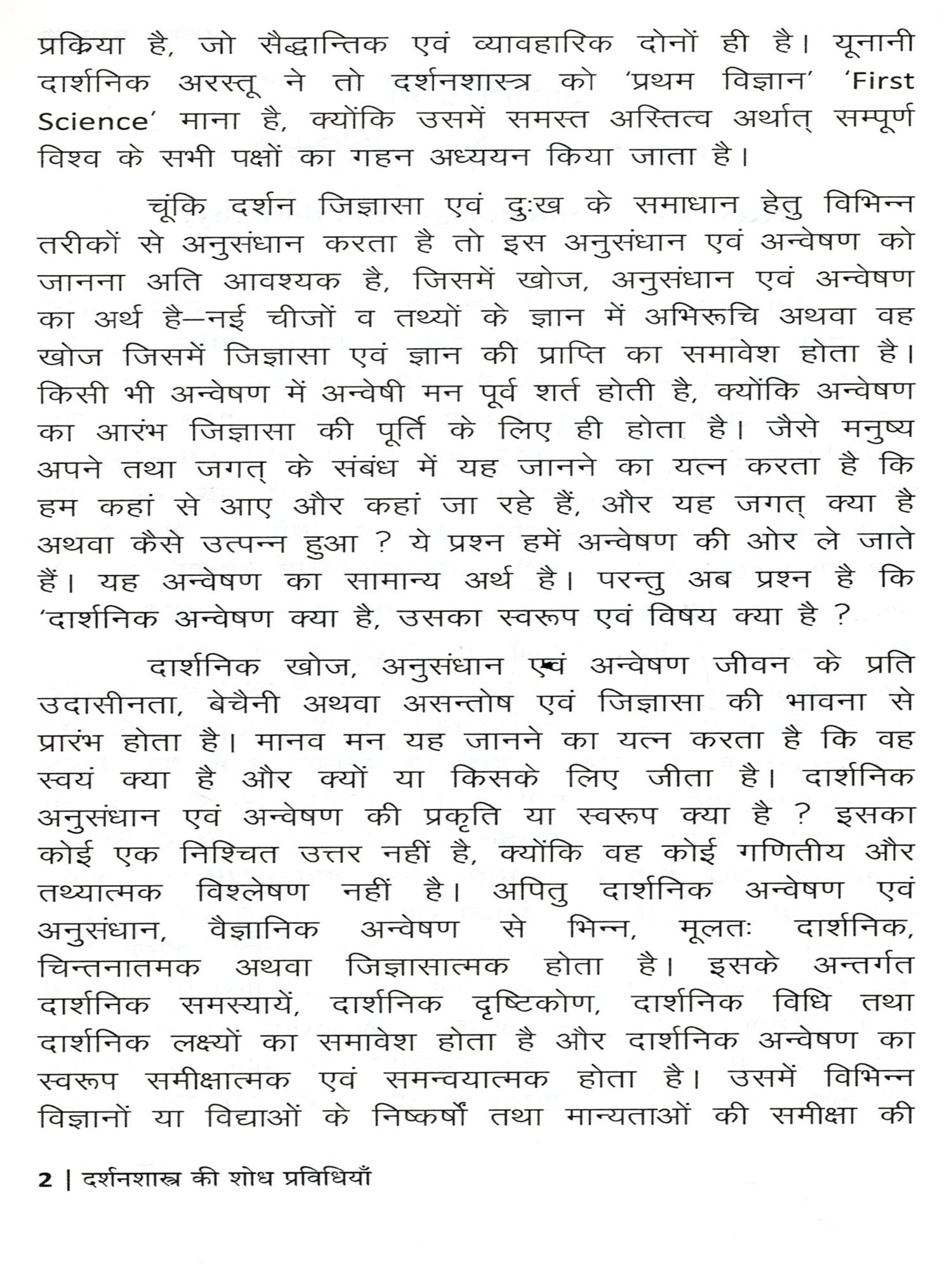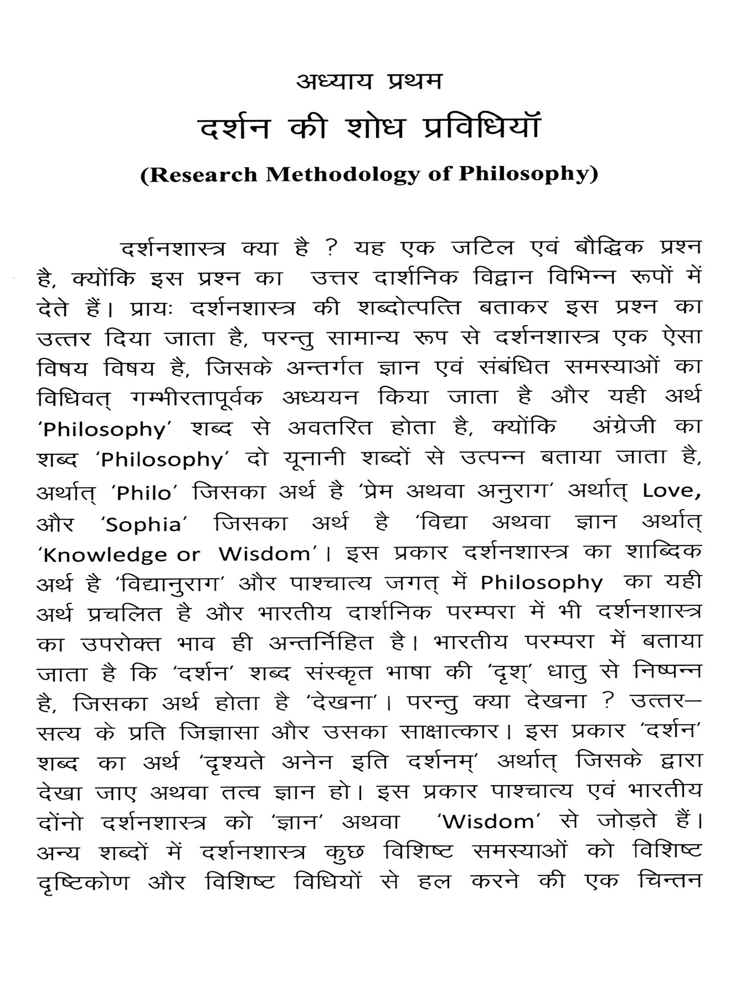 यदि कोई विद्यार्थी दर्शन शास्त्र के क्षेत्र में शोध करना चाहता है, तो उसको दर्शन की इन पद्धतियों का अध्ययन अवश्य करना चाहिए, क्योंकि इनके समुचित अध्ययन से ही उसके शोध कार्य में गुणात्मकता आयेगी और उसको यह भी ज्ञान होगा कि दर्शन में सोचने एवं शोध करने के कौन-कौन से तरीके हो सकते है। प्रस्तुत पुस्तक में यही प्रयास किया गया है कि दर्शन शास्त्र विषय में शोध करने वाले शोधार्थी दर्शन की प्रमुख पद्धतियों से परिचित हो जाये और एक उत्तम शोध का चयन करके एक उत्तम शोध कार्य कर सके और इस पुस्तक के द्वारा विभिन्न विश्वविद्यालयों में पी०एच डी कार्यक्रम के अन्तर्गत संचालित कोर्स वर्क के पाठ्यक्रम को समाहित करने का प्रयास किया गया है, ताकि शोधार्थी इस पुस्तक से लाभ उठाकर अपने कोर्स वर्क को अच्छी श्रेणी के साथ उत्तीर्ण कर सके। और यहां मैं यह बात भी कहना चाहता हूँ कि संभवतः अभी तक पी० एच-डी कार्यक्रम के लिये कोई भी पाठ्यपुस्तक उपलब्ध नहीं हैं।