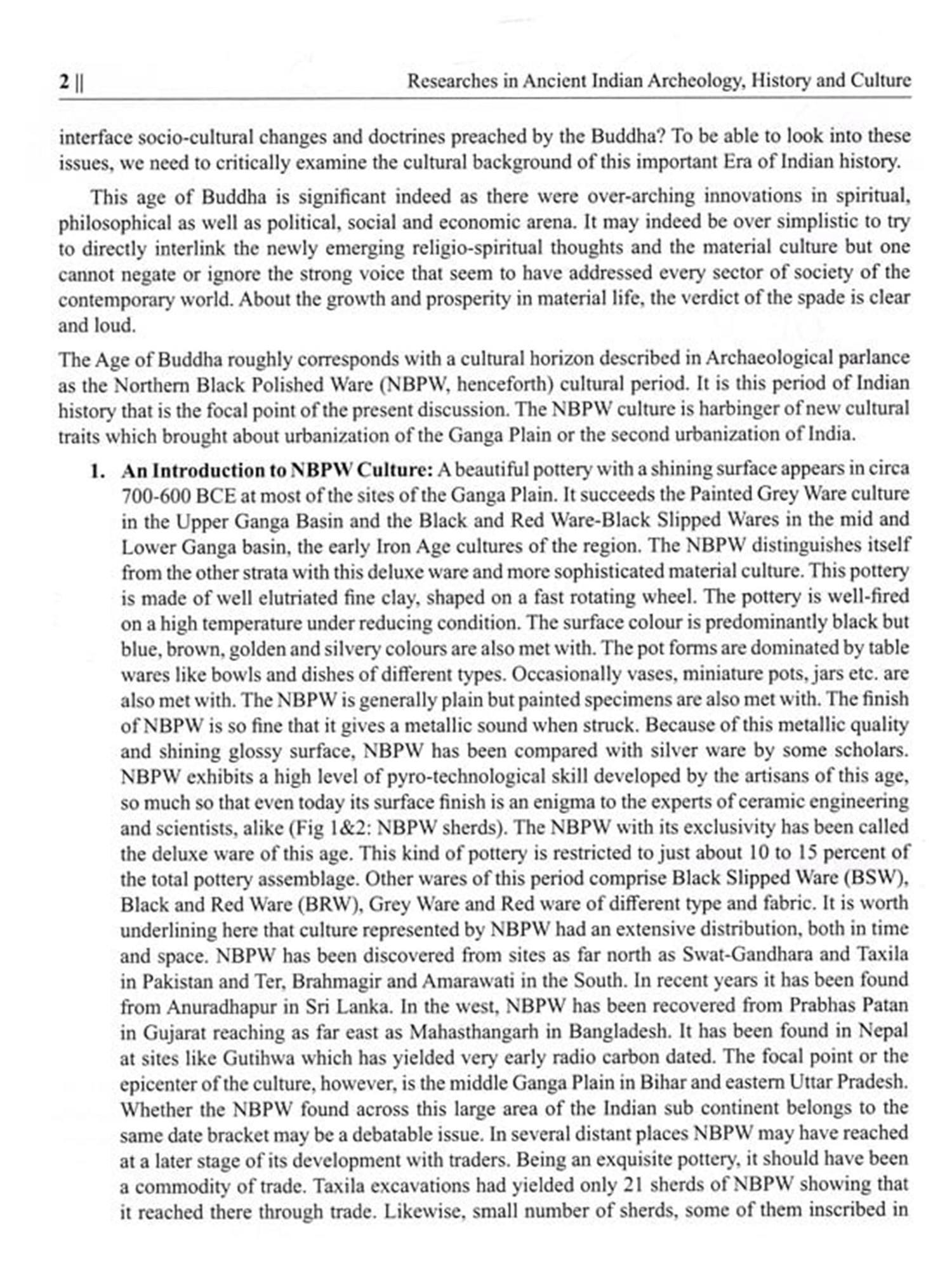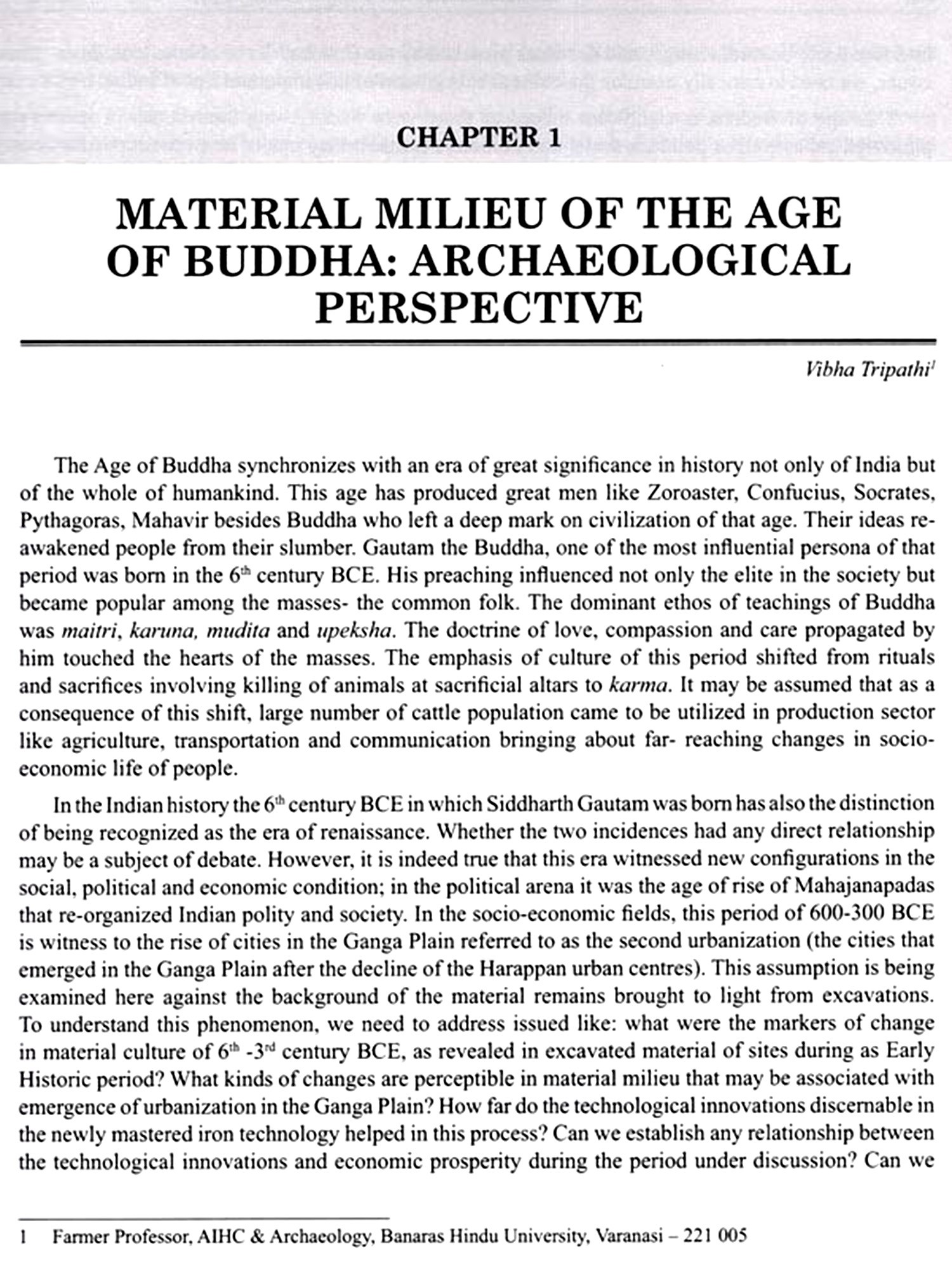 The first section Archaeology begins with Vibha Tripathy's article entitled Material Milieu of the Age of Buddha: Archaeological Perspective. In Early Indian history the period 600 to 300 BCE is characterized as the Second Urbanization. This characterization has been examined by the author against the background of the material remains brought to light from exacavations at relevant sites in the Middle Gangetic valley. The author delineates the material culture on the basis of the known NBPW sites, settlement pattern and their catchment arcas, impact of the use of iron etc., etc Critically analysing the Radiocarbon dates ranging from 1800 to 1000 BCE of iron known from recent excavations, the author holds the view that although these dates cast fresh doubts, yet the decisive impact of iron use was mostly felt during the of age of Buddha (500 to 300 BCE) when significant Socio economic and religious changes took place.