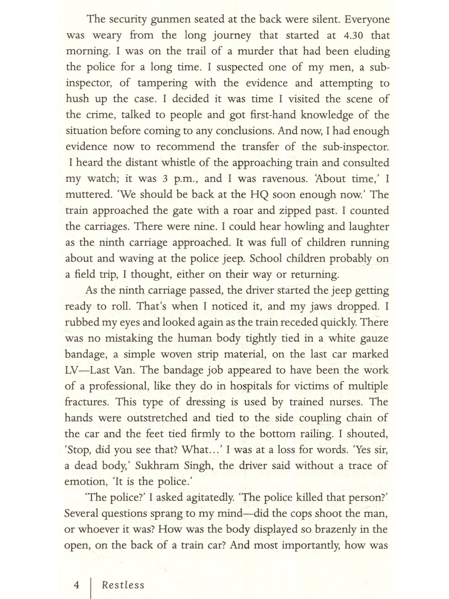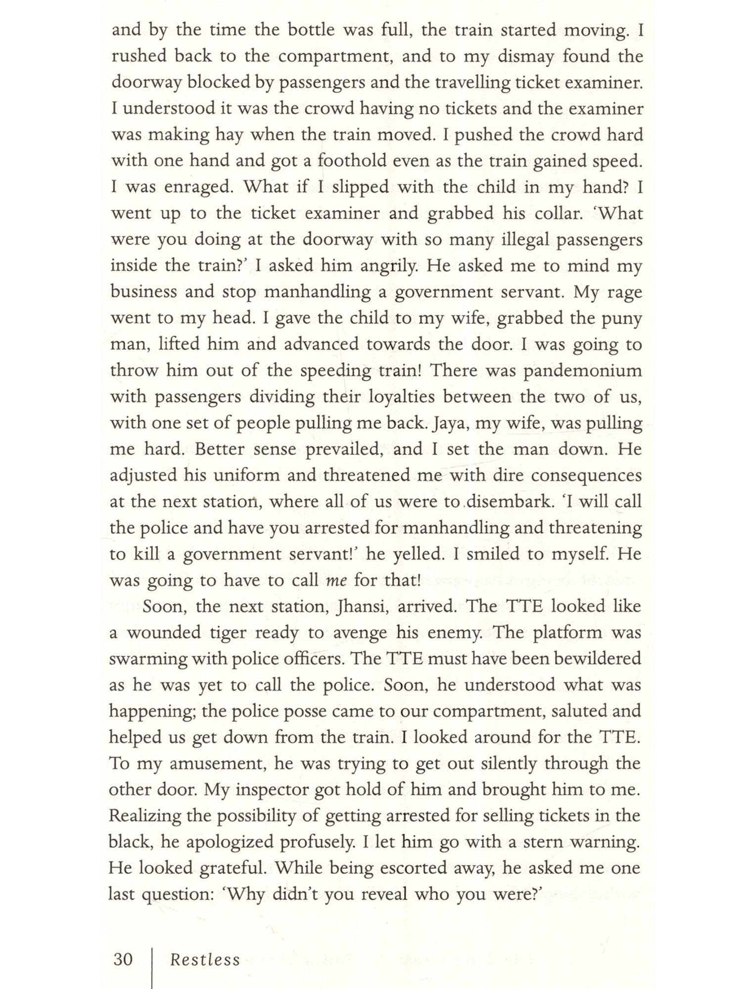 The story of an individual who walked out of his 'Goldilocks Zone three times to stay 'alive'. V.R. Sampath leaves his comfort zone the moment it gets too comfortable. Now retired but still a seeker, Sampath's life is governed by freedom and knowledge. He left a stress-free bank job to join the highly demanding Indian Police Service, and then quit the police force at a very senior position to seek challenges in the corporate world. In the corporate world, he rubbed shoulders with the likes of Mukesh Ambani, Anil Ambani, G.M. Rao and Gautam Adani. If he had a close-up view of how political and administrative power worked during his police days, he got to know the world of money power during his stint in the biggest corporates in India. In Restless, Sampath talks about his life and his encounters with the 'Indian way of life'. Through his varied experiences, he feels that India is on survival mode even after seventy years of independence. This struggle for survival has made Indians devoid of trust, compassion and humanity, more often than not. Then, how does one survive? The book takes an honest and hard look at the definition of success and happiness. Sampath believes that people need to keep reinventing themselves constantly. That is the only way to keep the spirit alive.