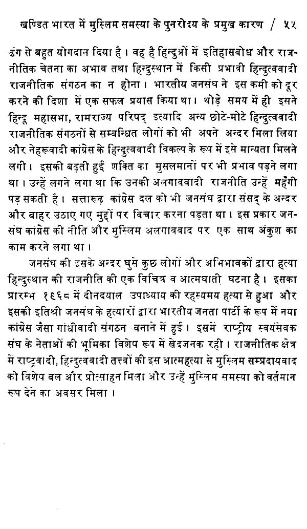 हिन्दुस्थान ने इसके दोनों रूप देखें हैं। इस्लामी राजकाल में भारत के लोग इसके दमनकारी रूप से पीड़ित रहे। मुस्लिम सत्ता खत्म होने के बाद जब मुसलमान भारत में एक अल्पसंख्यक समुदाय रह गए तब इनका विघटनकारी रूप सामने आया। १६४७ में भारत का विभाजन उसी का परिणाम था। तब यह सोचा गया था कि उन्हें पाकिस्तान के रूप में अलग घर मिल जाने के बाद खण्डित हिन्दुस्थान में यह समस्या नहीं रहेगी। परन्तु यह सोच गलत निकली। अनेक कारणों से गत ४४ वर्षों में मुस्लिम समस्या अधिक भयानक रूप से फिर खड़ी हो गई है। इसके कारण देश की शान्ति, एकता और सुरक्षा के लिए ही नहीं अपितु इसके अस्तित्व और विशिष्ट हिन्दू पहचान के लिए भी नए खतरे पैदा हो गए हैं।
