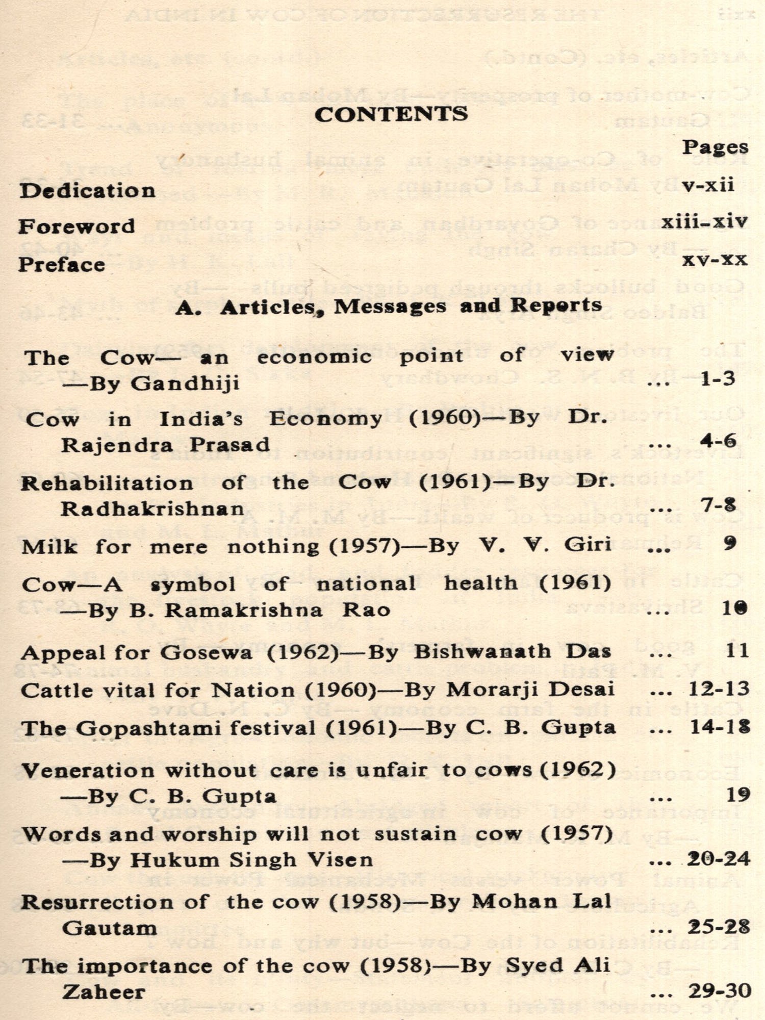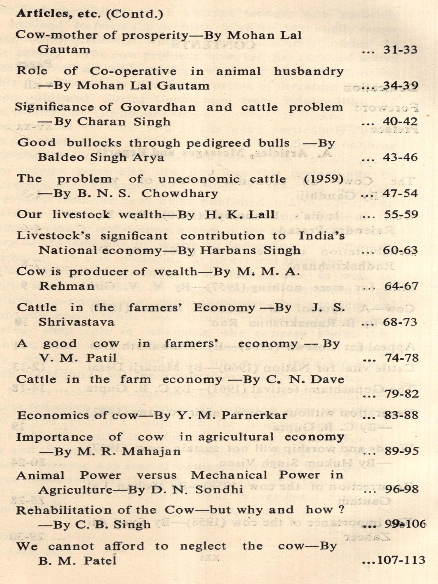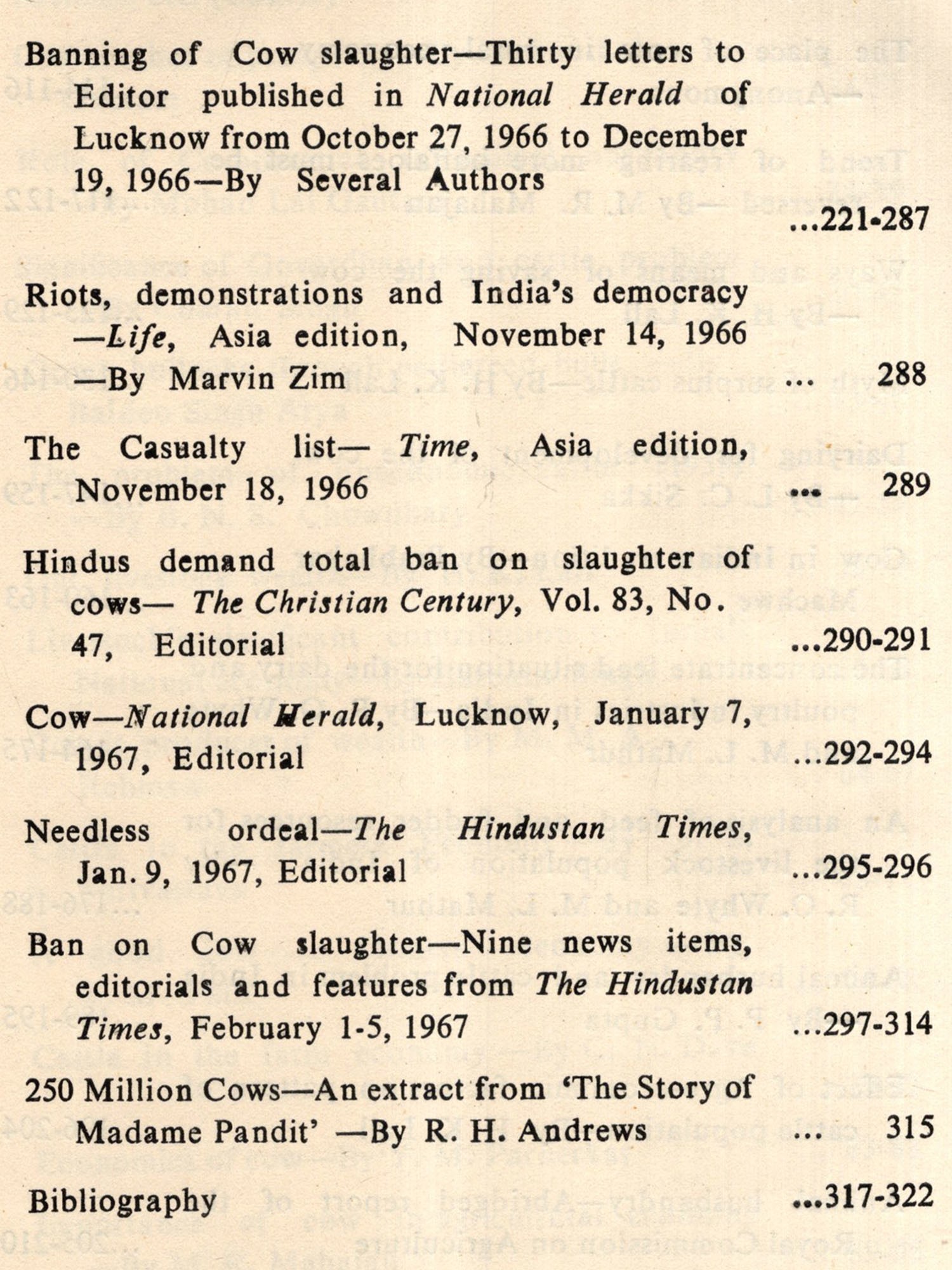 A review of this literature gives a fair cross-section of public opinion regarding the problem of the Cow in India and an idea as to how wide and deep are the ramifications of this problem, which affects the very vitals of our rural economy. It also shows that an average Indian has an open mind on the subject and is constantly reviewing this problem from time to time under changing economic conditions.