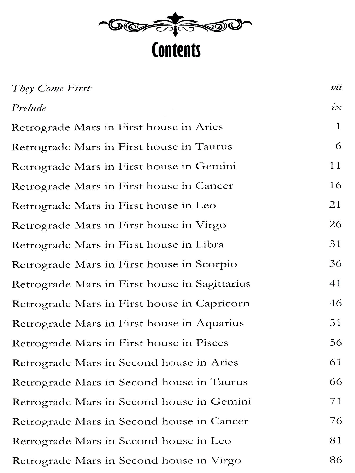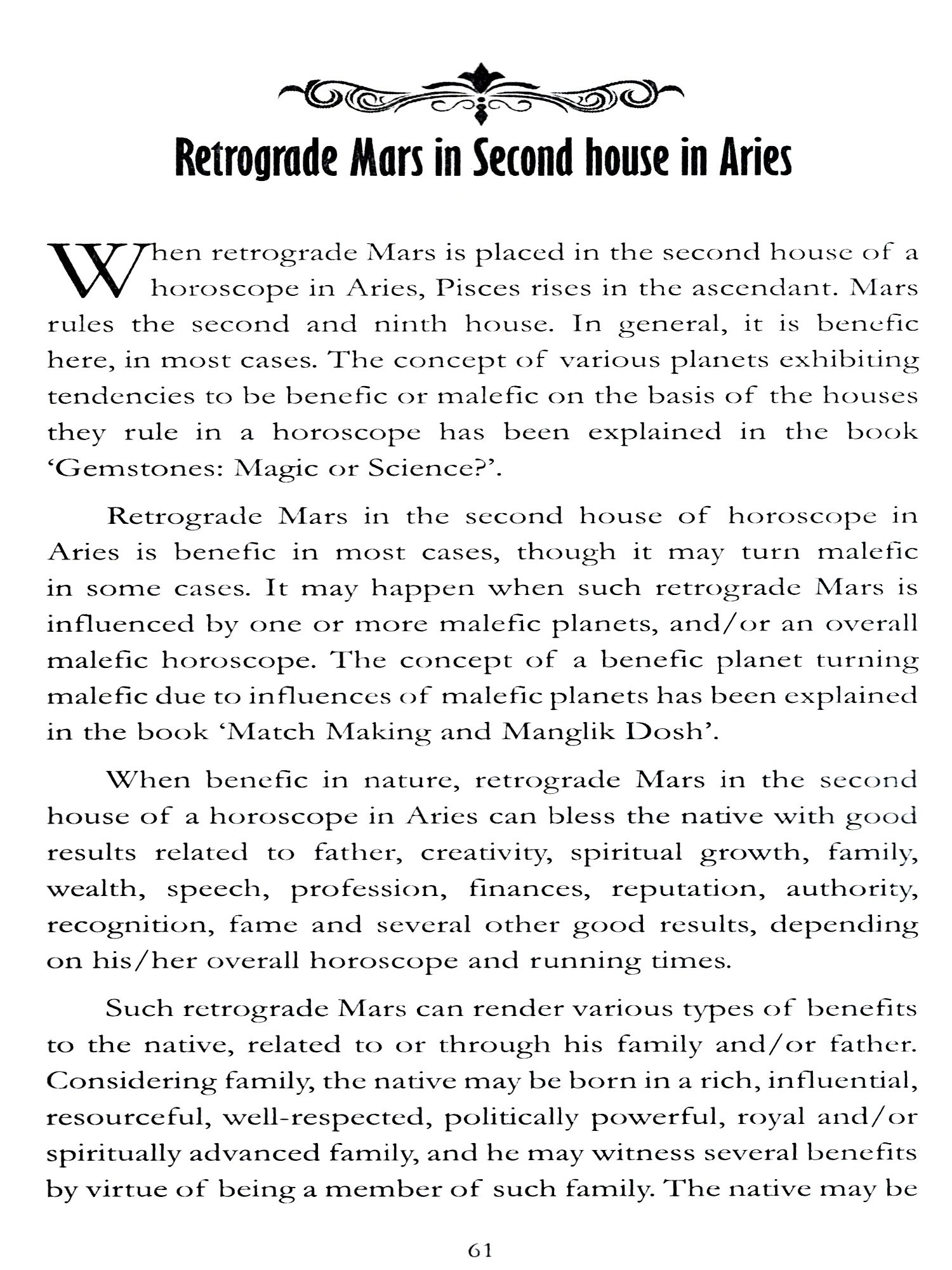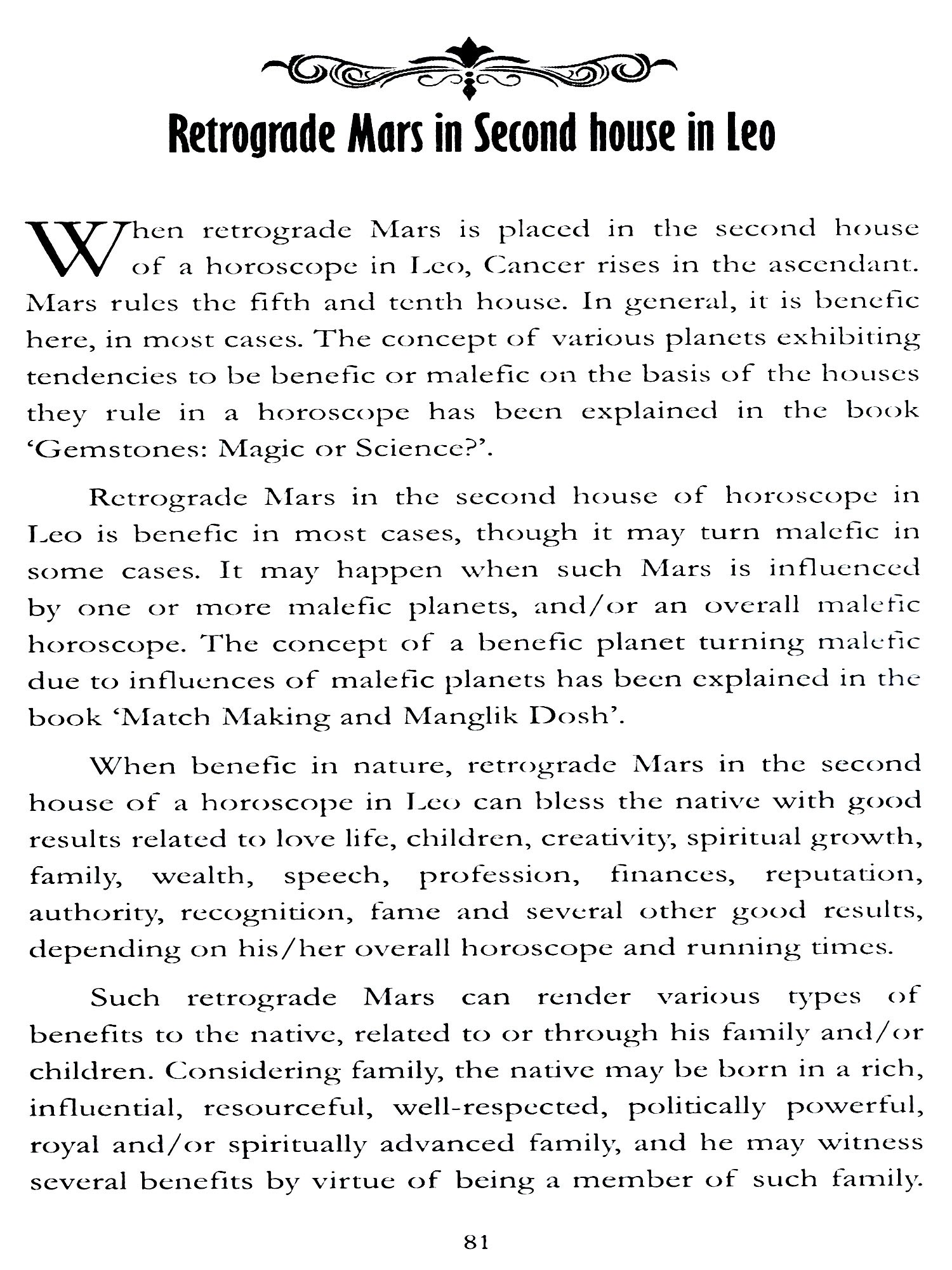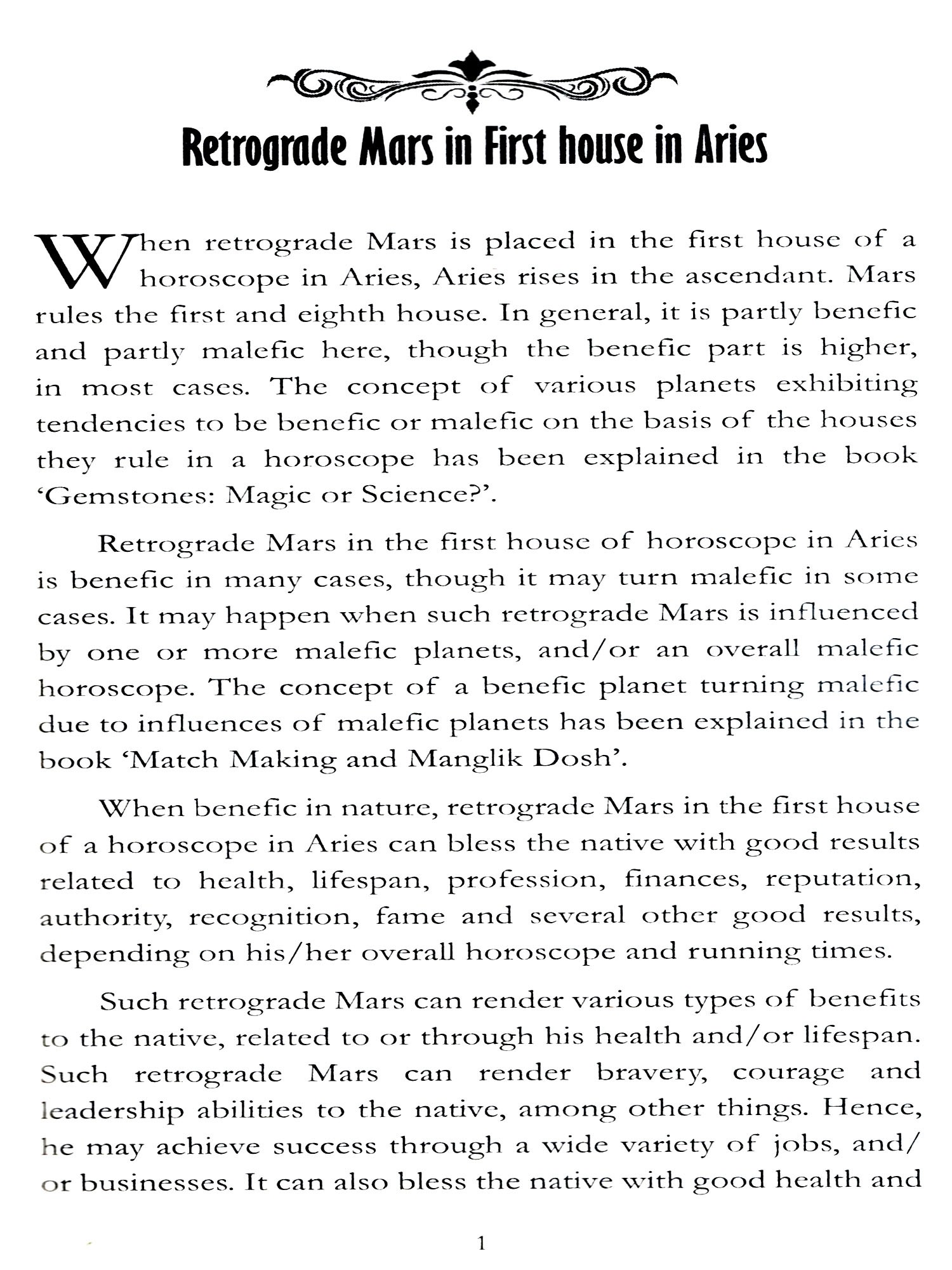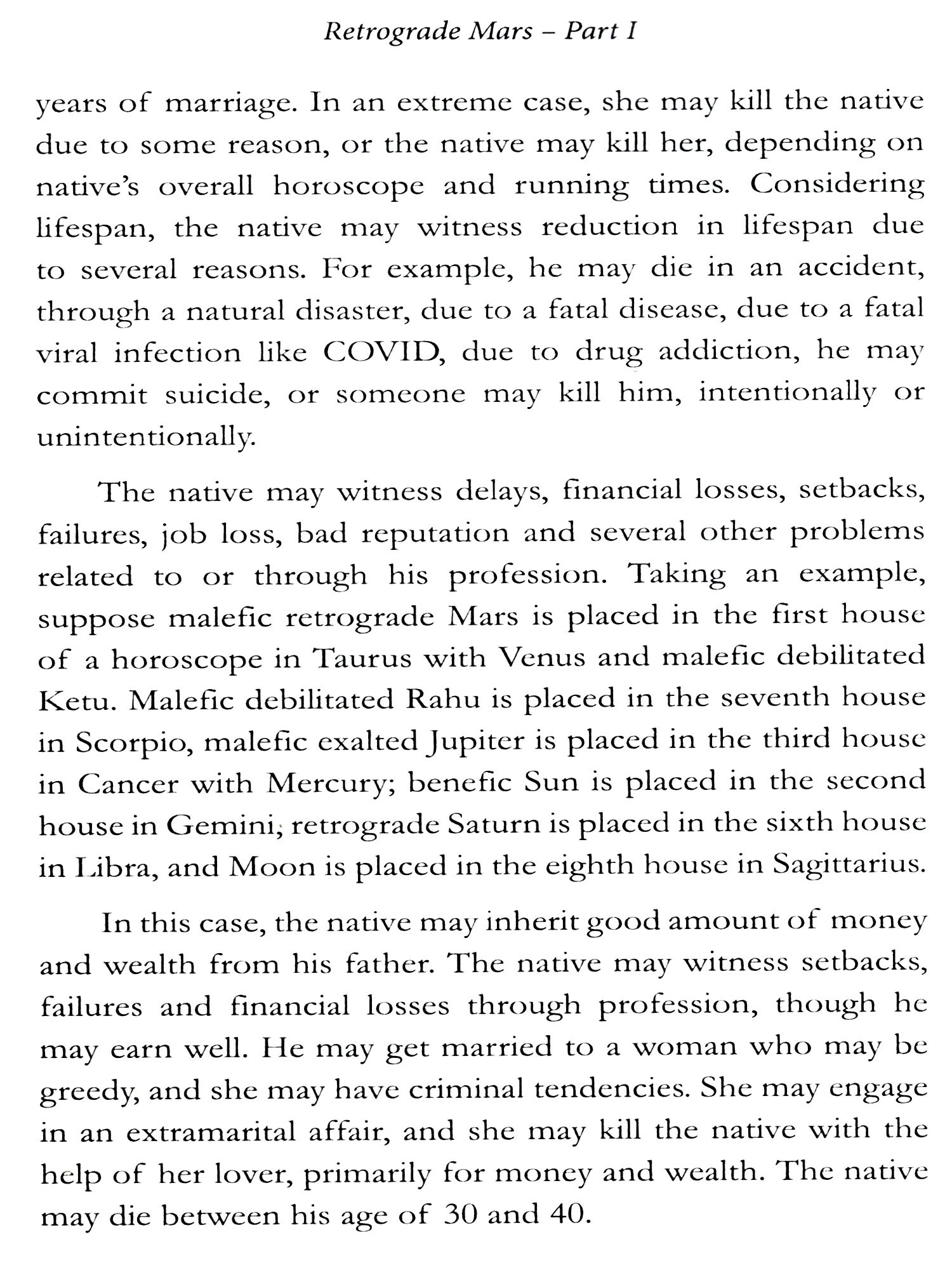 This book deals with the placements of retrograde Mars in the first three houses of horoscope. Benefic as well as malefic effects of retrograde Mars have been discussed in each one of these houses in different signs, along with relevant examples from horoscopes.