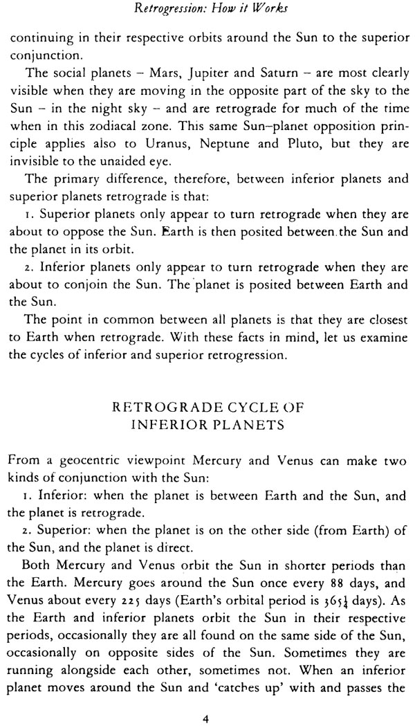 I could see that the inferior planets might be a problem to any ancient sky-watcher because of their proximity to the Sun and the long-standing belief in geocentricity. As for the superior planets, however, I could not understand why greater mention had not been made of their import when they were retrograde, since they would have been viewed in the night sky when the Sun was opposed to them. When I finally surveyed some ancient sources, there were a few mentions of retrograde planets but primarily in the context of dire warnings about their stations and the terrible afflictions which they portended!