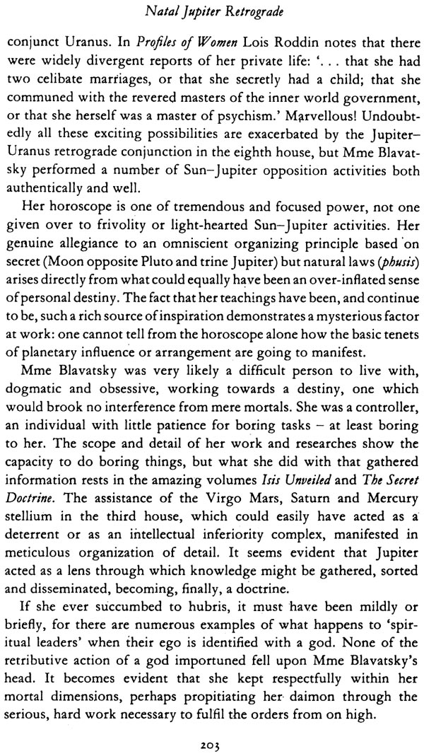 You may notice a lack of emphasis on house position and sign placement in all sections delineating retrograde planets. This is deliberate for two reasons. First, the most significant power of a retrograde planet lies in the fact that it is retrograde, and, therefore, is implicitly in aspect to the Sun. Secondly, the power of a retrograde planet is dependent upon its place in the gestalt of the horoscope, that is, dependent on whether it has an exact aspect with the Sun; whether it is a singleton; or whether it is otherwise segregated from the main body of planets in the rest of the chart.