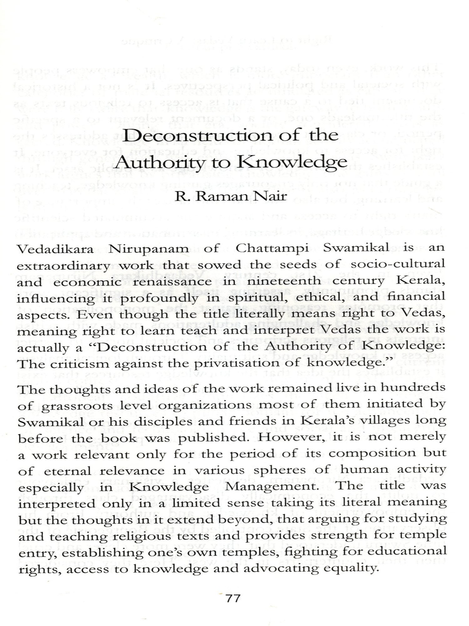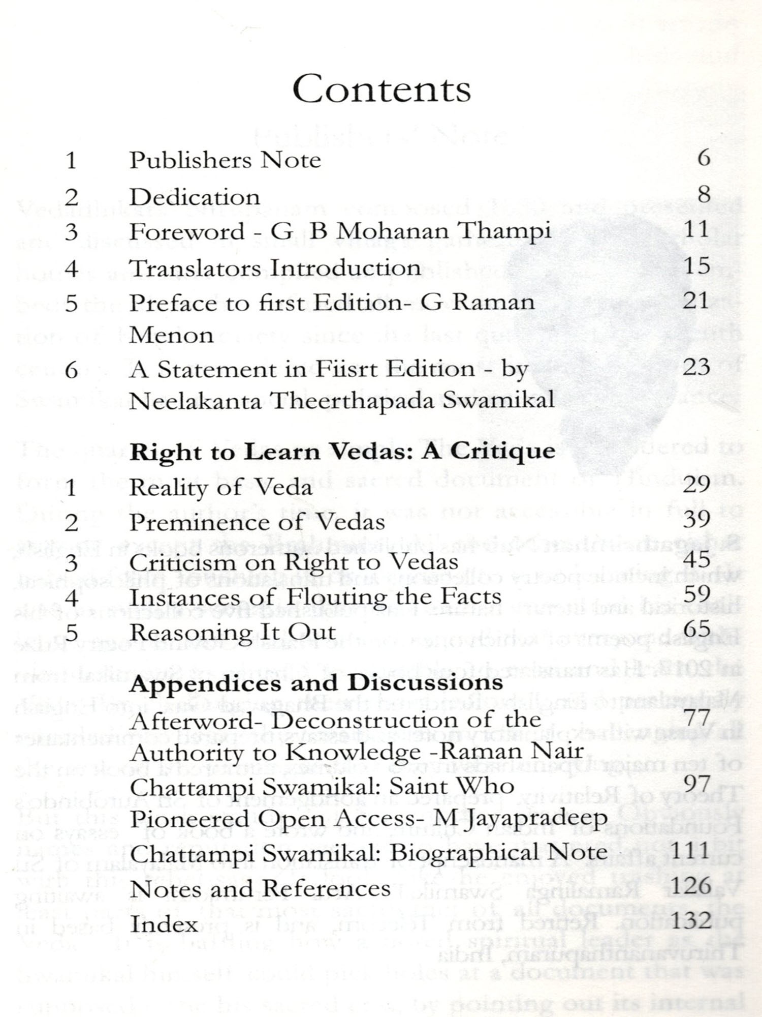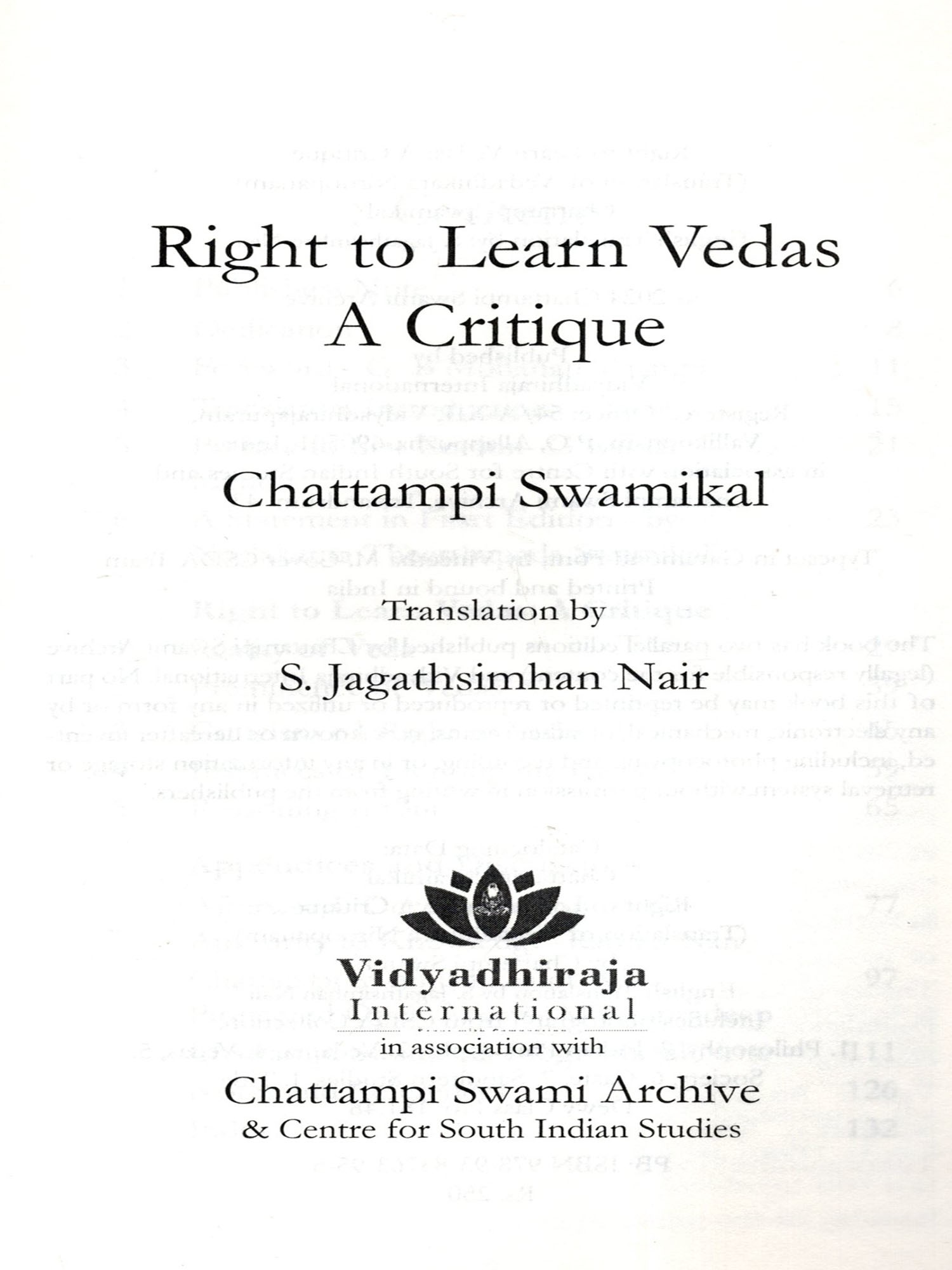I feel that I am but ill-qualified to write a foreword to this very learned and thoughtful work on the nature of the Vedas and the qualifications required for their study, by Chattampi Swamikal. Still, I have been induced to write this owing to the friendly request of my saintly and learned friend Neelakanta Thirthapada Swami, one of the foremost of the disciples of Chattampi Swami. My excuse is that, as the work is already in the press, it will be unbecoming on my part to force my friend to seek for a preface elsewhere.
