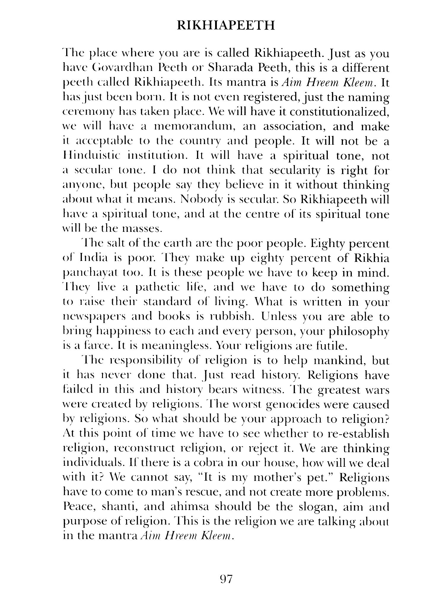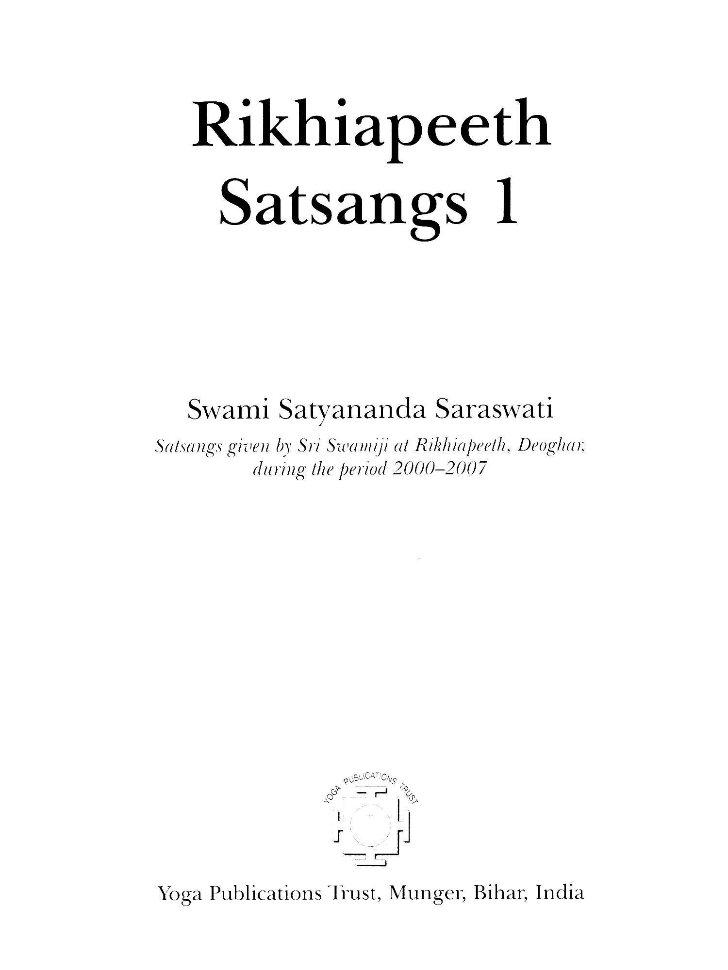 Sri Swami Satyananda Saraswati came to the village of Rikhia (Jharkhand) in 1989. There he performed intense austerities and, as a result of his sadhanas, transformed the lives of the villagers around him, whom he calls his 'neighbours'. Rikhiapeeth Satsangs is a selection of talks given by Sri Swamiji between 2000 and 2007 to visitors from all over the world.