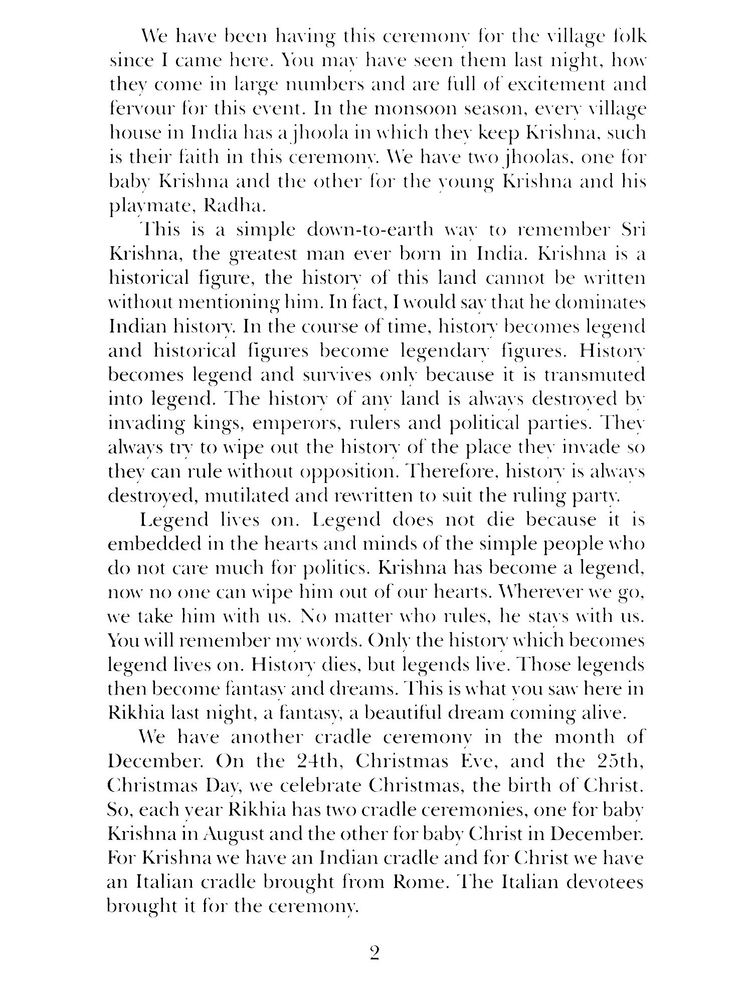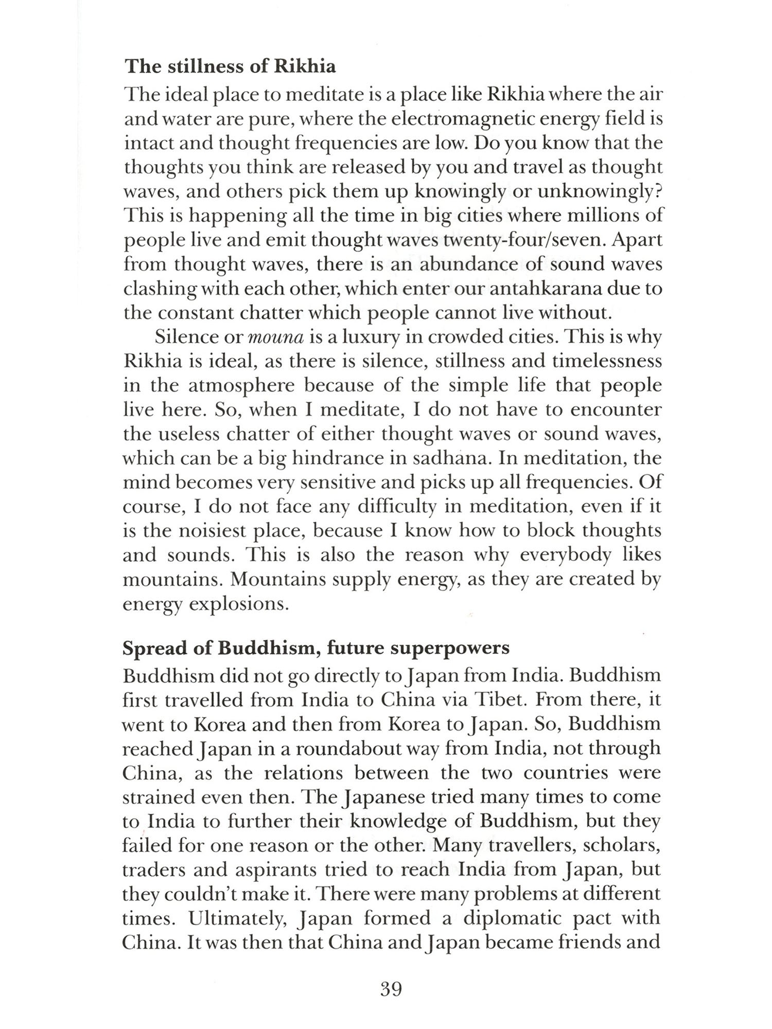 Rikhiapeeth Satsangs 2 is a collection of talks given by Sri Swamiji between 2004 and 2009. He speaks on a broad range of subjects, including the changes in Rikhia, his sadhanas, his birthday, yajna, yogic principles, children, kriya yoga, jnana yoga, transcending the mind, the sannyasa tradition, Sri Krishna, Jesus Christ, war and peace, and the future of the world. Sri Swamiji's liberal, compassionate and practical views provide inspiration and fresh insights to all individuals seeking expansion of mind.