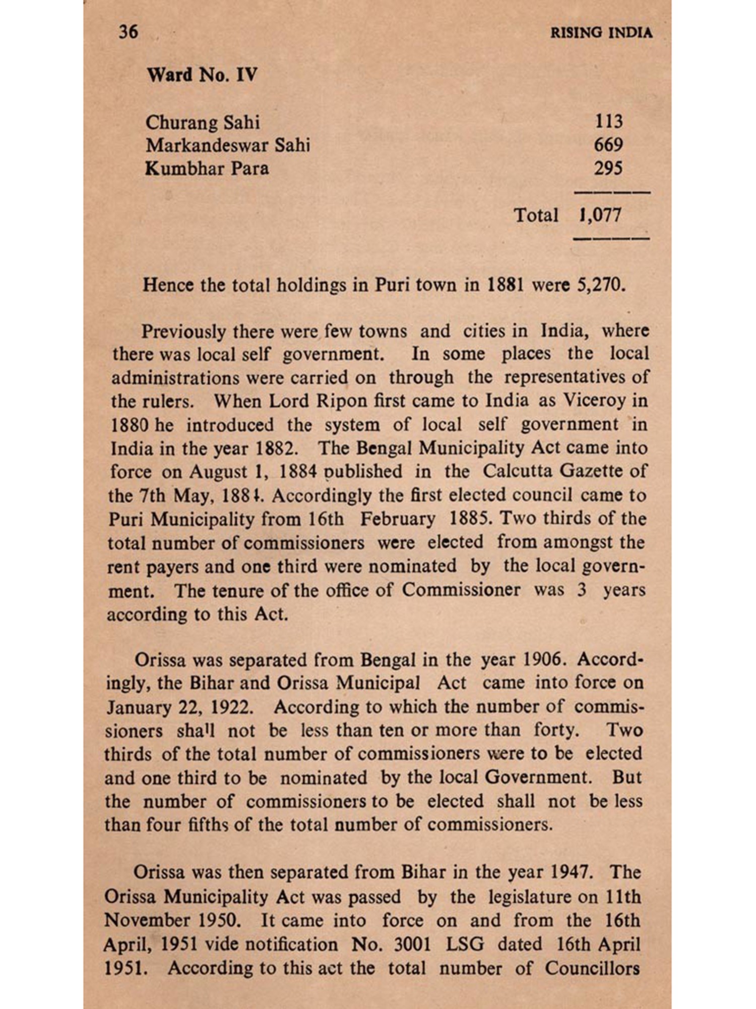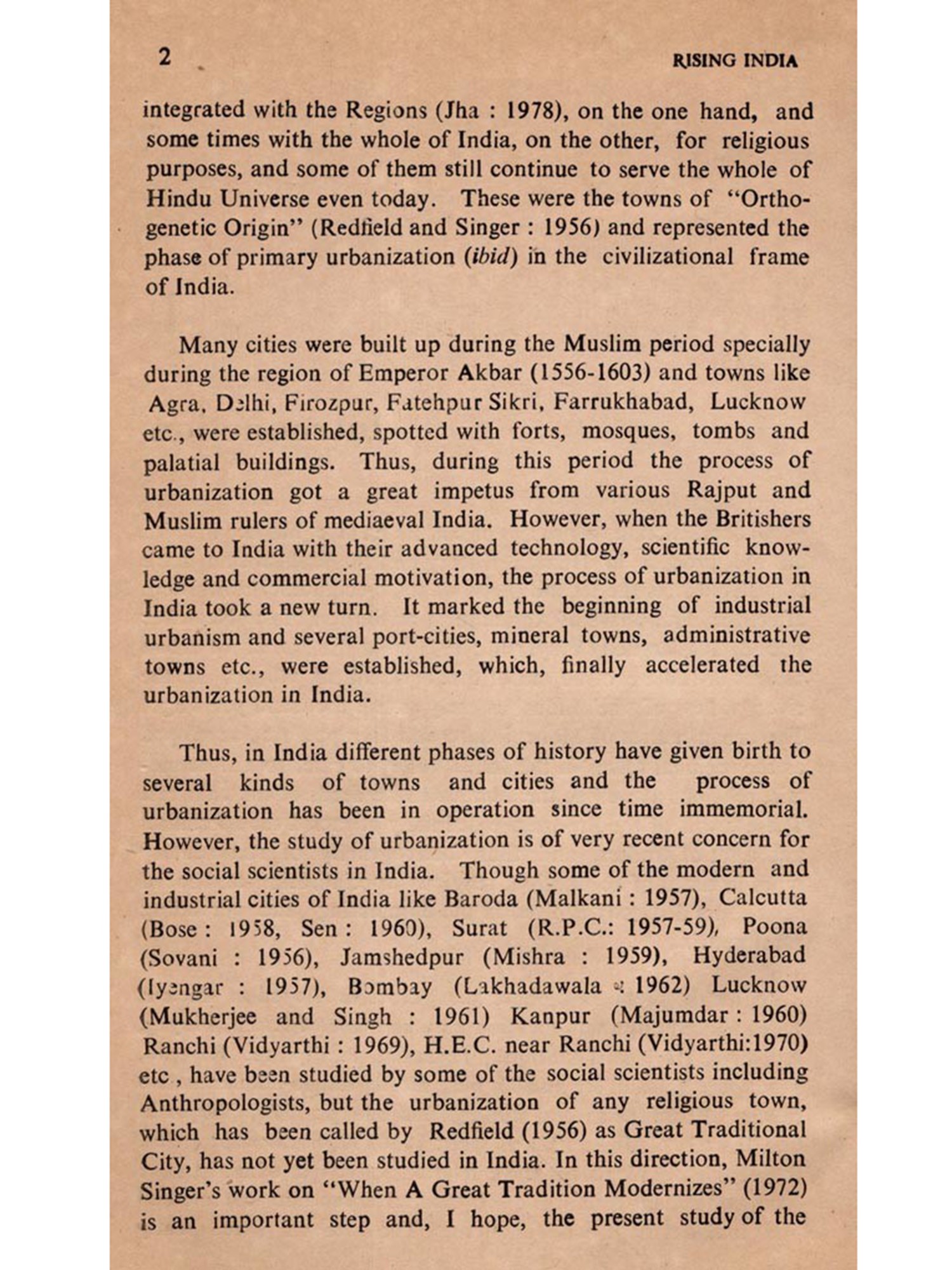 It gives me a great pleasure in presenting this volume on the study of Urbanization of a Great Traditional City, entitled "Rising India", which describes the processes and factors of urbanization of an ancient place of pilgrimage-Puri, which has been one of the four Dhams of the Hindus. Puri attracts lakhs of pilgrims from different corners of the Hindu Universe through-out the year. This traditional irtha of Puri has passed through the various historical phases, and therefore, has acquired many Sanskritic, Buddhistic, Tantric as well as the folk elements, which are evident in its "Sacred Complex" le. the sacred geography, the sacred performances and the sacred specialists (or different Niyogas). These aspects of this traditional pilgrim's centre have been highlighted by many scholars (viz. Patnaik, Rath, Mahapatra etc.) from time to time. However, besides these aspects, the increasing trend of urbanization of this traditional town of Puri, has been an important factor, and uptill now no anthropological work of any kind had been done on it. Thus, keeping in view the importance of both the sacred and urban dimensions of Puri, the Post-Graduate Department of Anthropology, Ranchi University, Ranchi, organised a field. expedition along with a batch of the Post-Graduate Research students under my guidance and supervision, which continued for nearly three months i.e. from December, 1974 to February, 1975 and the present volume is, thus, an out-come of that empirical field study.