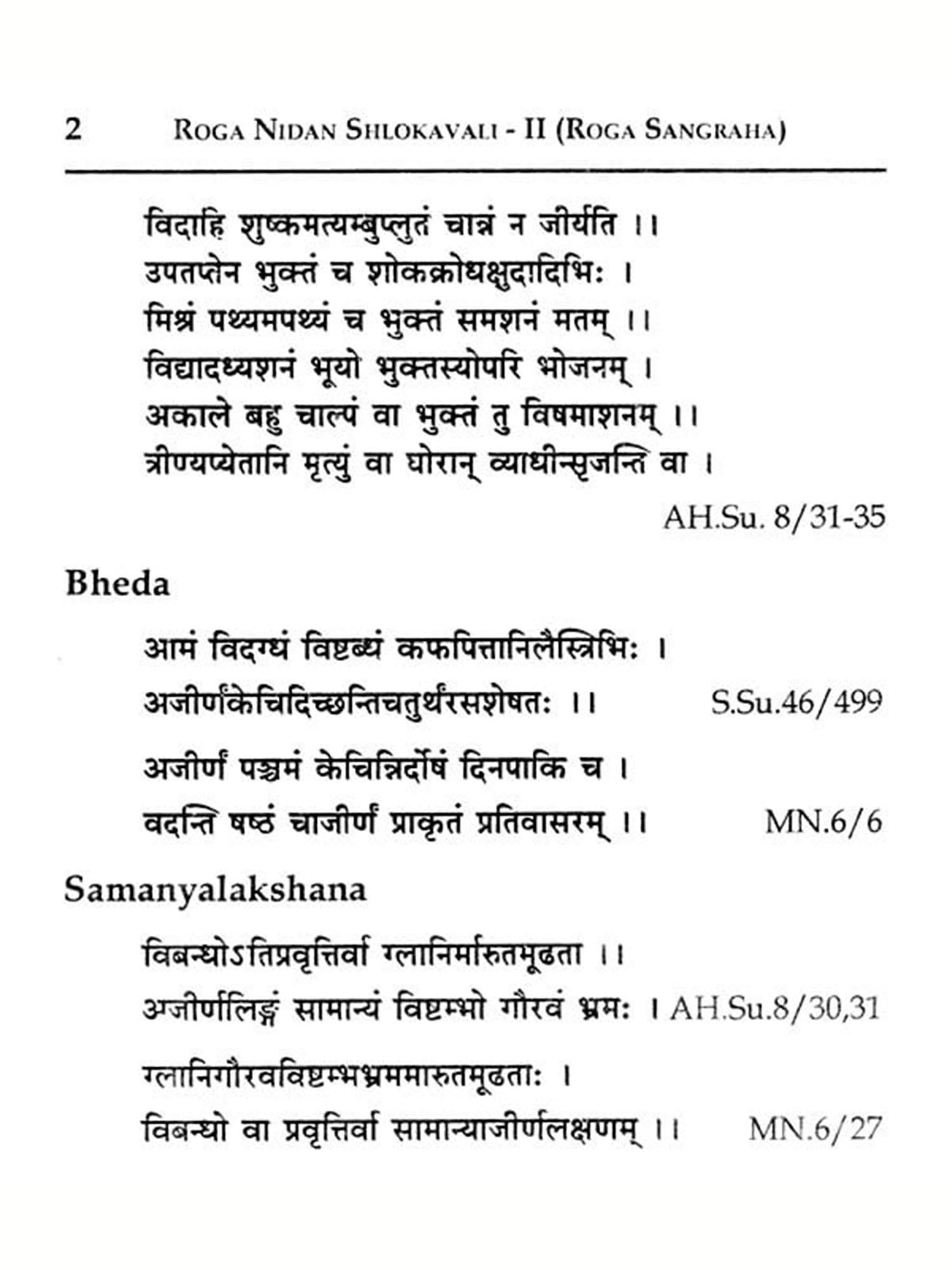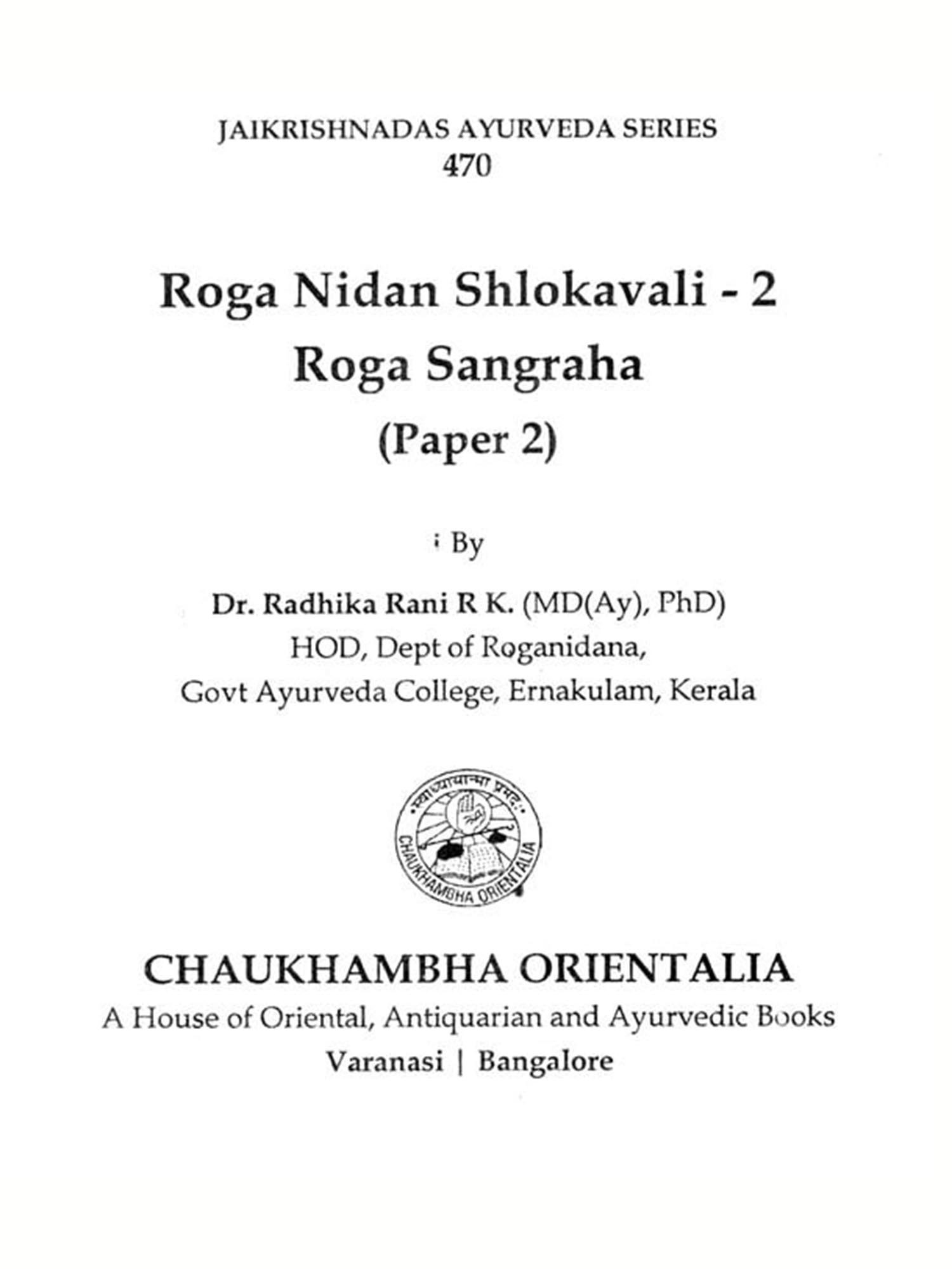 Roga sangraha is the second book in the Slokavali series on Roganidana. Unlike Paper I of AyUGRN, all the classical Ayurvedic texts had dedicated a separate volume named Nidanasthana exclusively to describe the contents of Paper II. As the name suggests, the book is a compendium of those diseases, the management of which comes under the syllabus of the subject Kayachikitsa during the final professional of the UG course. It includes only diseases mentioned in the Ayurvedic literature; though the syllabus also consists of those from modern literature. Fresh learners are urged to understand the literal meaning of the sloka before memorizing them because comprehension and interpretation of the content are the specific learning objectives envisioned in the competency-based curriculum introduced by NCISM.