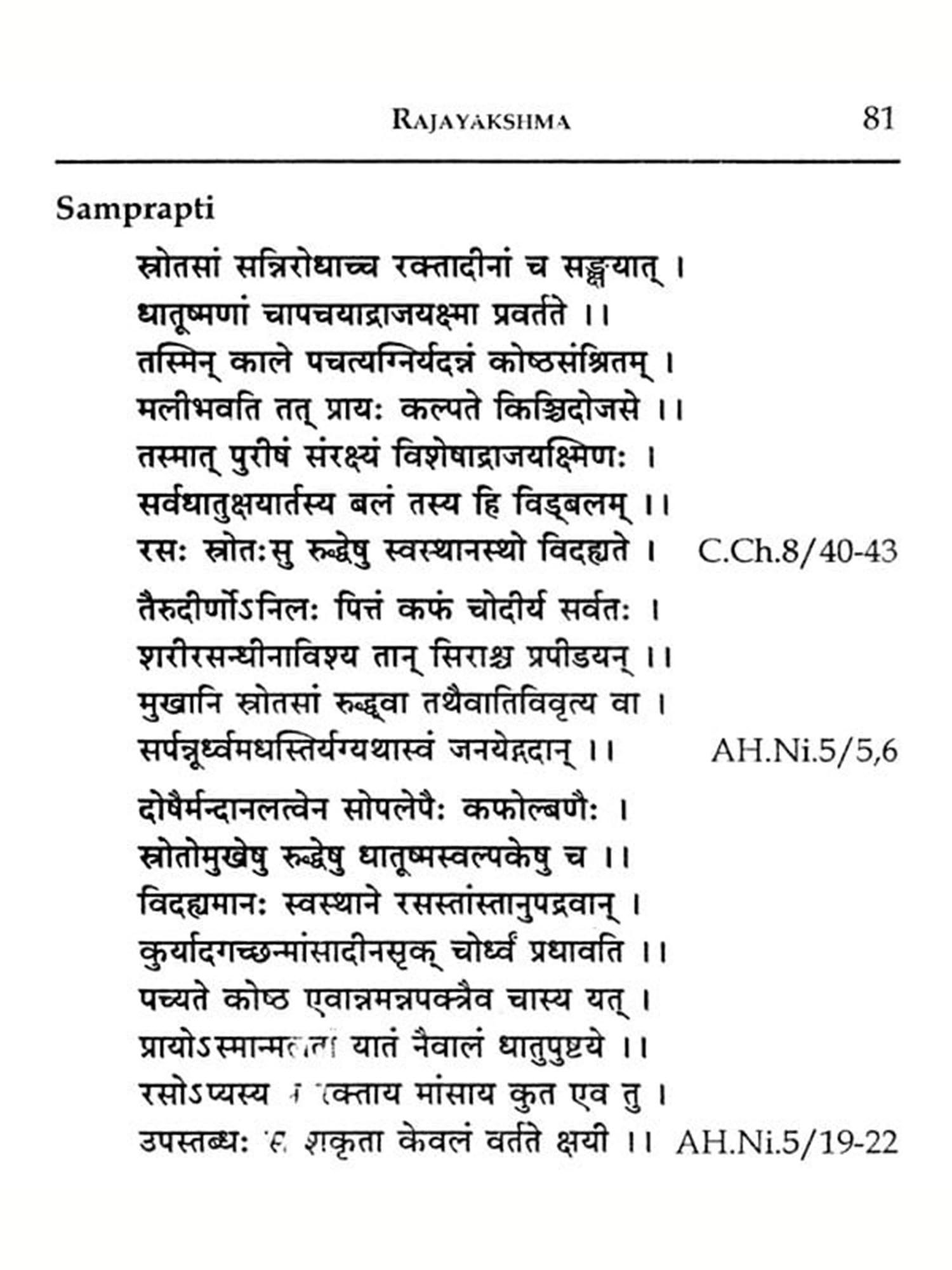 Though the book primarily follows Charaka Samhita, references from other authors among the Brhattrayees have been included so that the learner can understand differences of opinion, if any. This would benefit all learners irrespective of the regional differences in the principal text followed for their Ayurveda education. Care was taken to include a few relevant explanations on the bare slokas by the commentators. Besides, relevant shlokas from other texts like Madhava Nidana, Hareeta Samhita, and Gadanigraha were also included. Hence, the book would be a ready reference on classical references on Ayurvedic diseases for the PG scholars in Roganidana and Kayachikitsa.