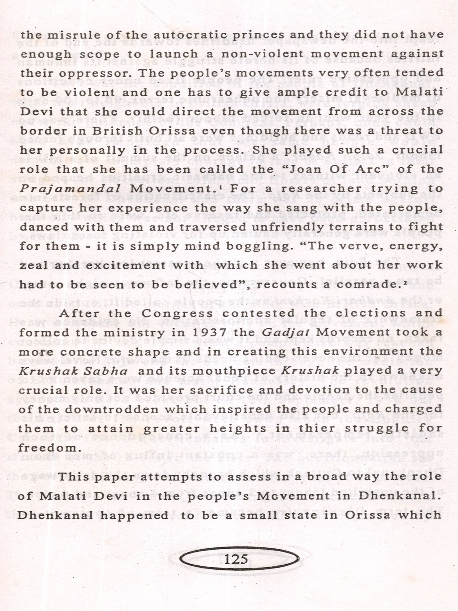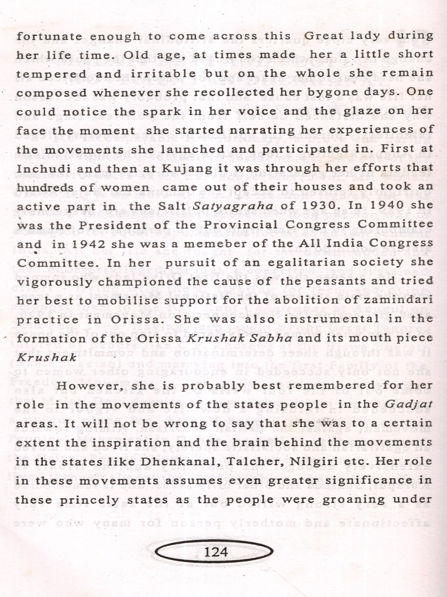 Orissa had a fair share of agitational activities in the pre-independent period leading to unprecedented level of mass mobilisation against the British in the eastern parts and Prajamandal activities in the Garjat areas. What is commonly not known is that the women played a significant role in providing both, the leadership as well as the mass discontent in these troubled times.