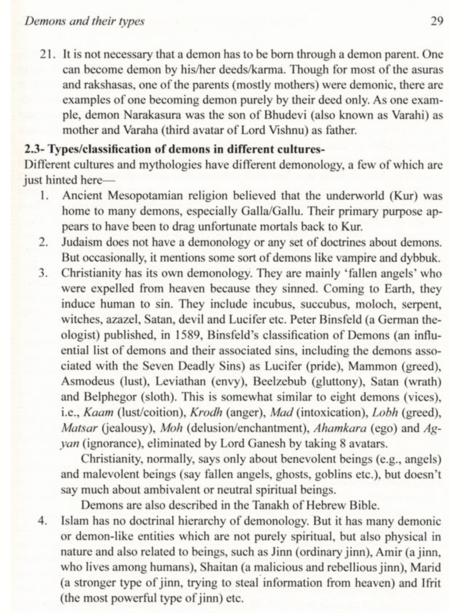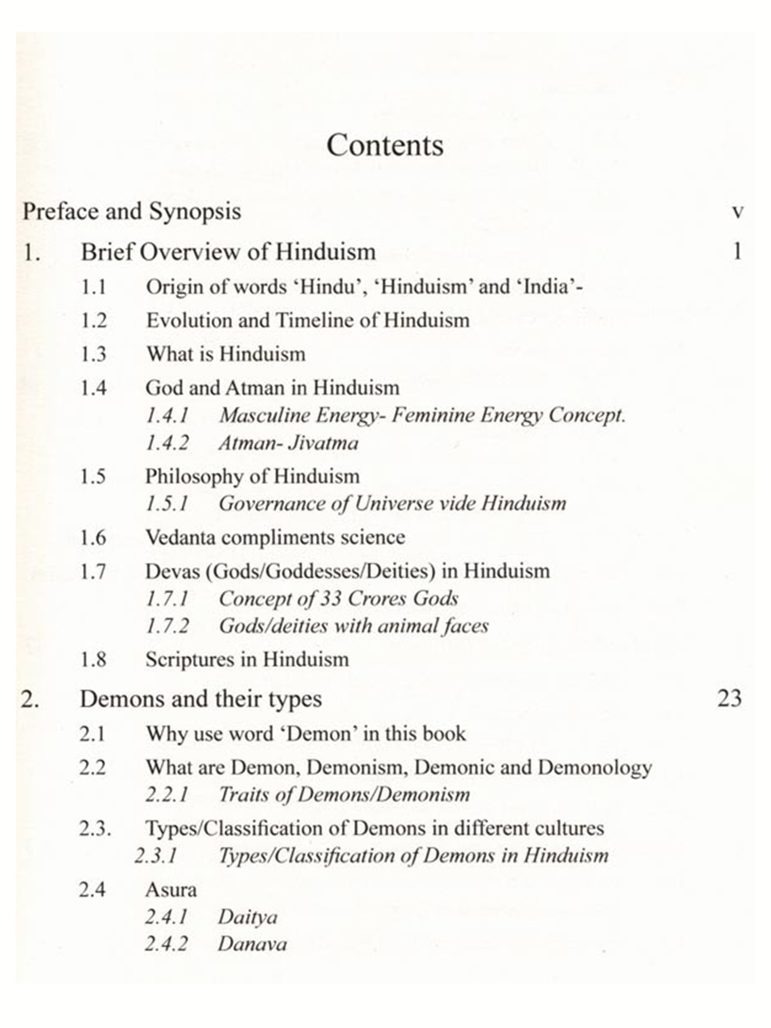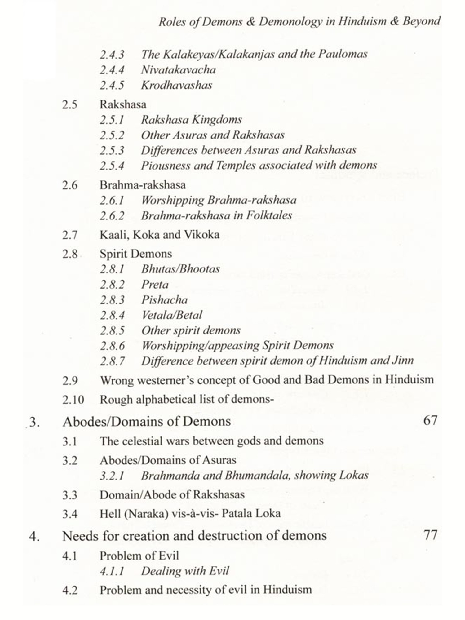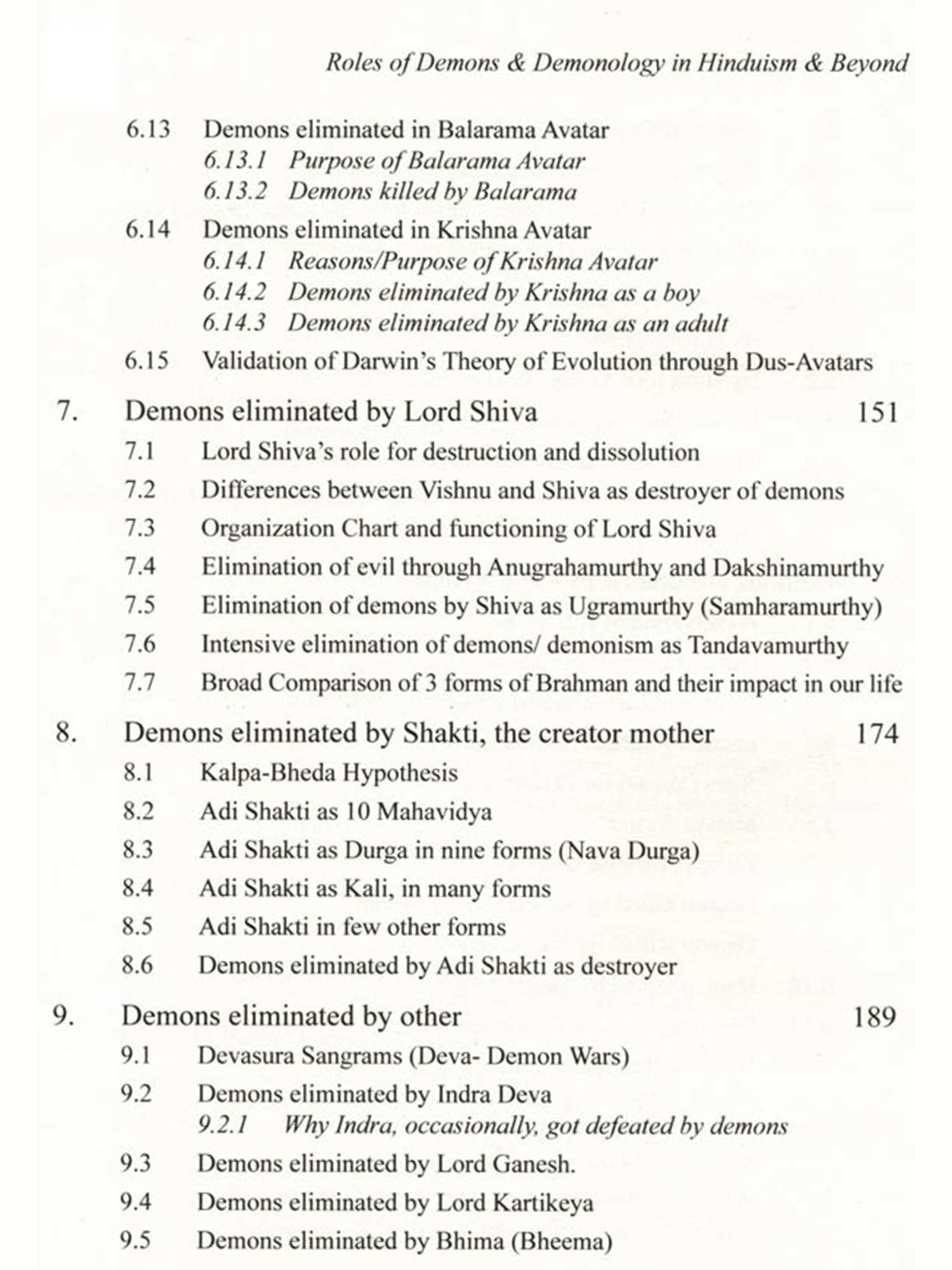 The concept of demon in Hinduism is quite different from the concept of demon in Christianity and many other cultures. Unlike Christianity and few other reli-gions, Hinduism hardly ever blames the demons for the corruption of mankind. The demon plays the character of a villain in the psychodrama of salvation with the di-vine avatar as the hero. In Hinduism, there is no concept of evil, as it is all governed by 'Law of Karma' and demons are not considered evil. The demons are rather a positive concept moving in the wrong direction, leading to demerit and bondage. While Western view is that God creates demon (Satan etc.) against his will, Hin-duism considers that God creates demons willingly, and also out of necessity. The book vividly illustrates what are the types of demon (both, external and internal), why and how demons were created (both, external and internal) and why and how demons had to be eliminated.