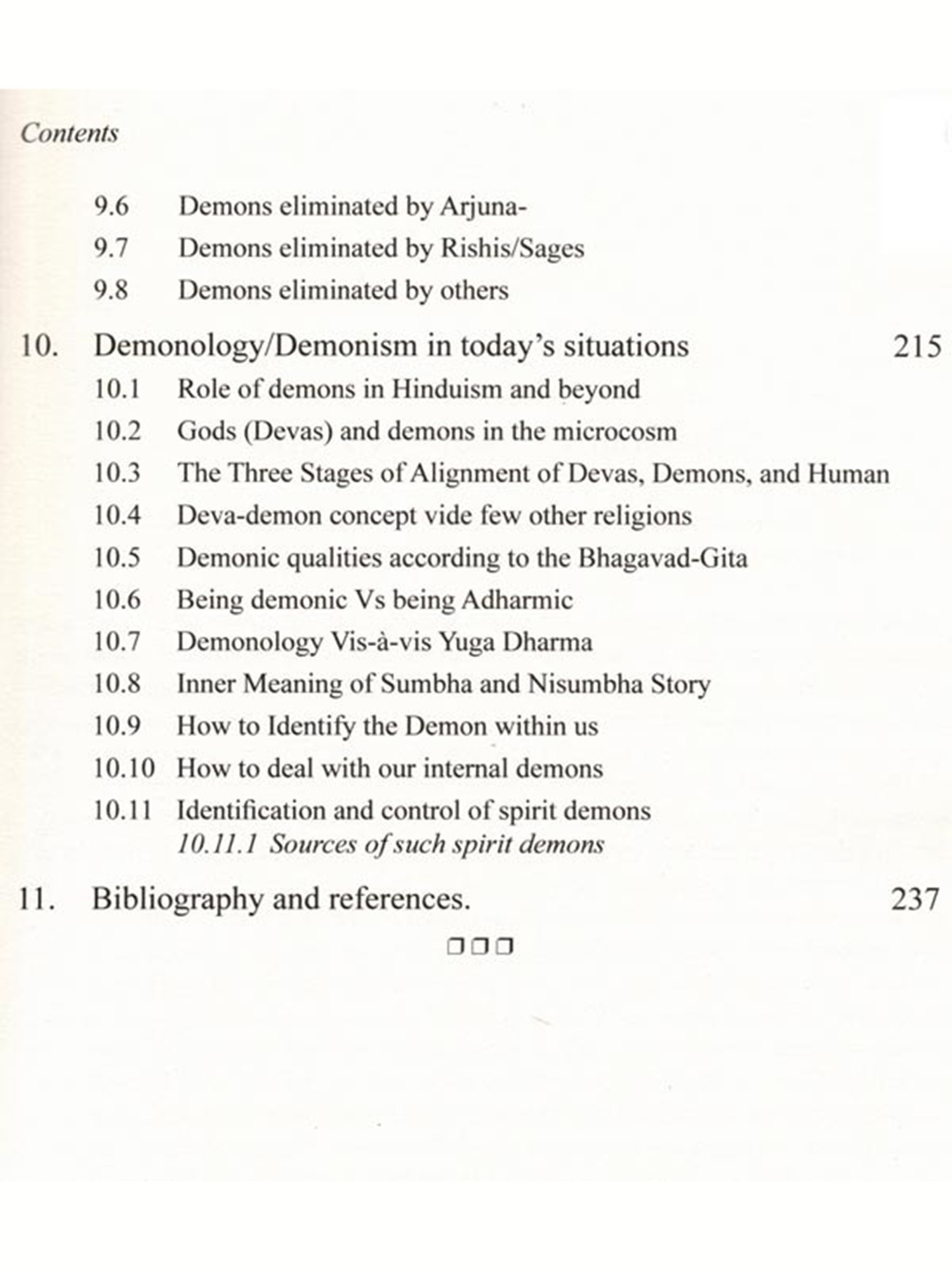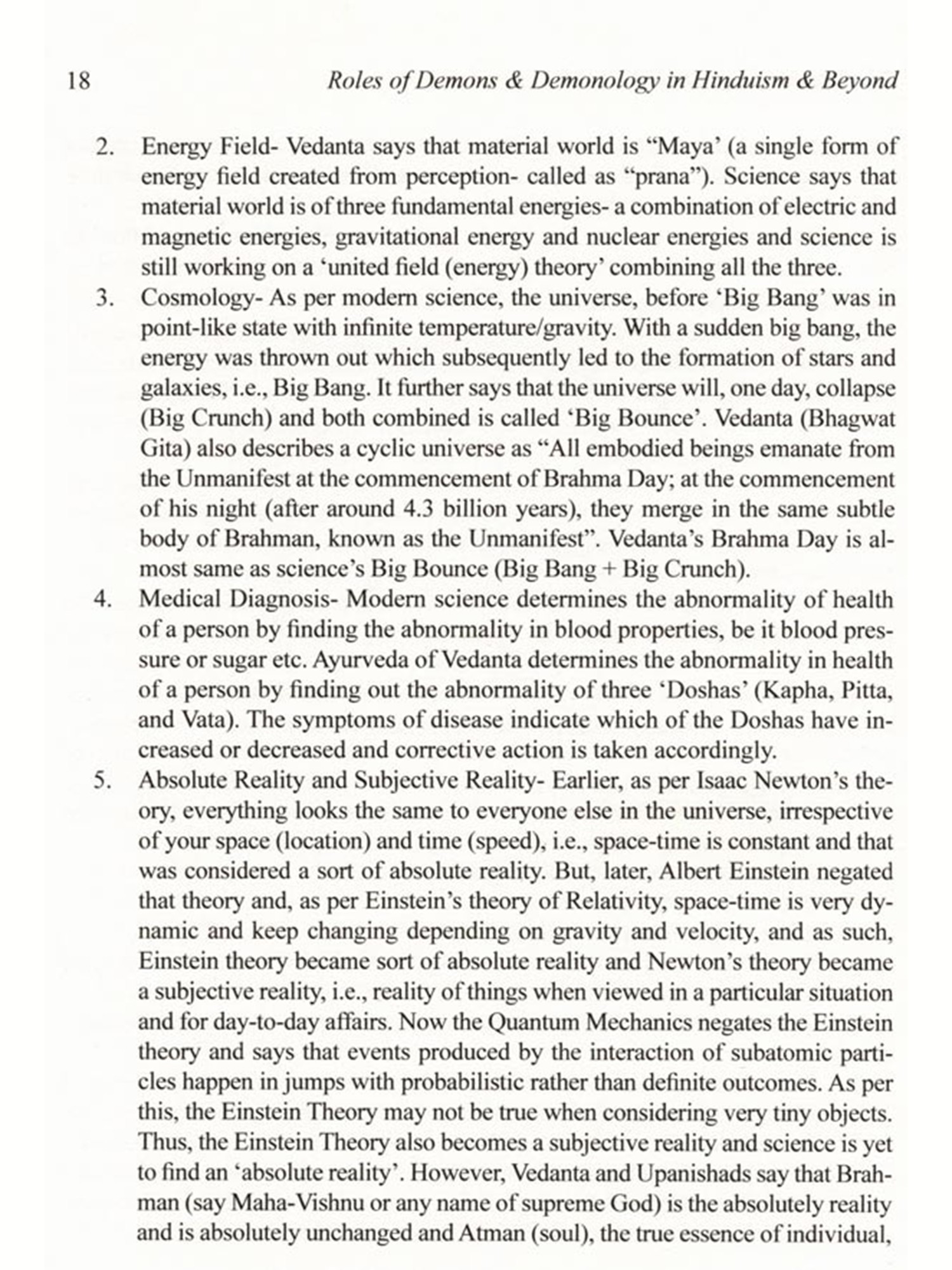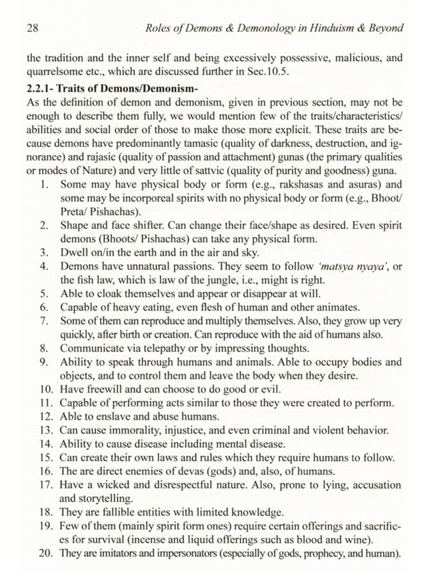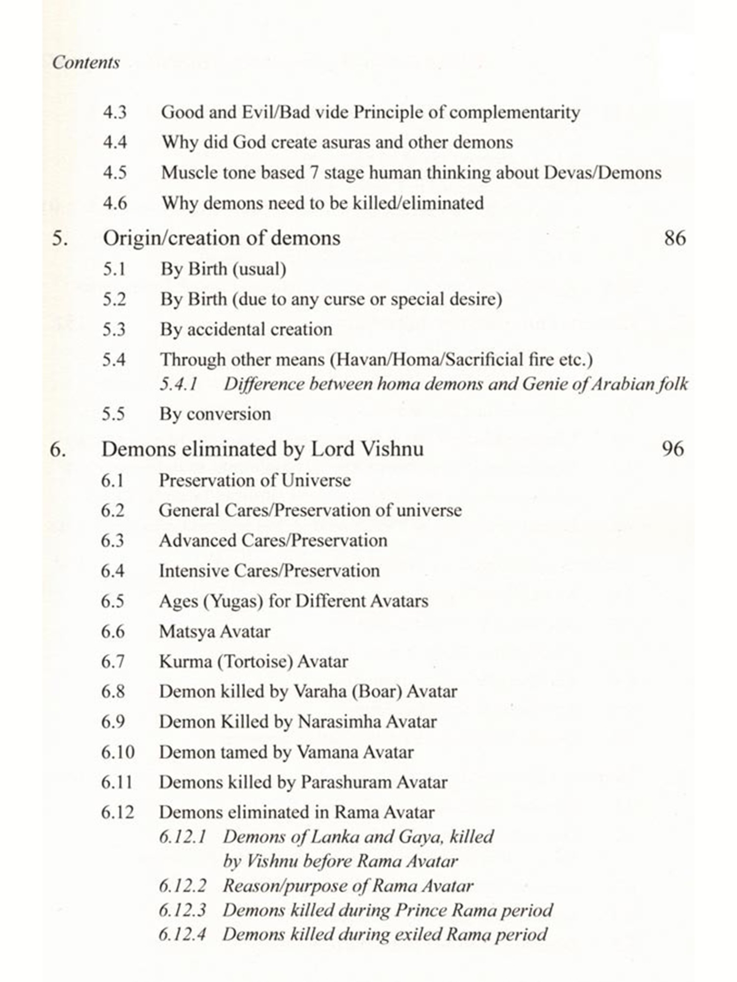 The concept of demon in Hinduism is quite different from the concept of demon in Christianity and many other cultures. Unlike Christianity and few other reli-gions, Hinduism hardly ever blames the demons for the corruption of mankind. The demon plays the character of a villain in the psychodrama of salvation with the di-vine avatar as the hero. In Hinduism, there is no concept of evil, as it is all governed by 'Law of Karma' and demons are not considered evil. The demons are rather a positive concept moving in the wrong direction, leading to demerit and bondage. While Western view is that God creates demon (Satan etc.) against his will, Hin-duism considers that God creates demons willingly, and also out of necessity. The book vividly illustrates what are the types of demon (both, external and internal), why and how demons were created (both, external and internal) and why and how demons had to be eliminated.