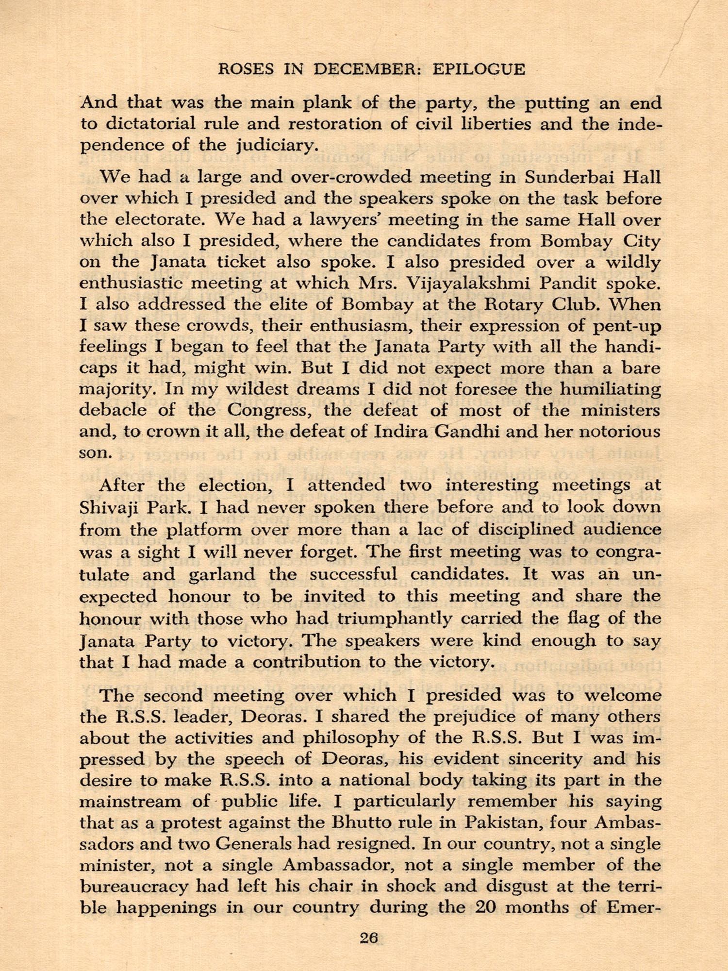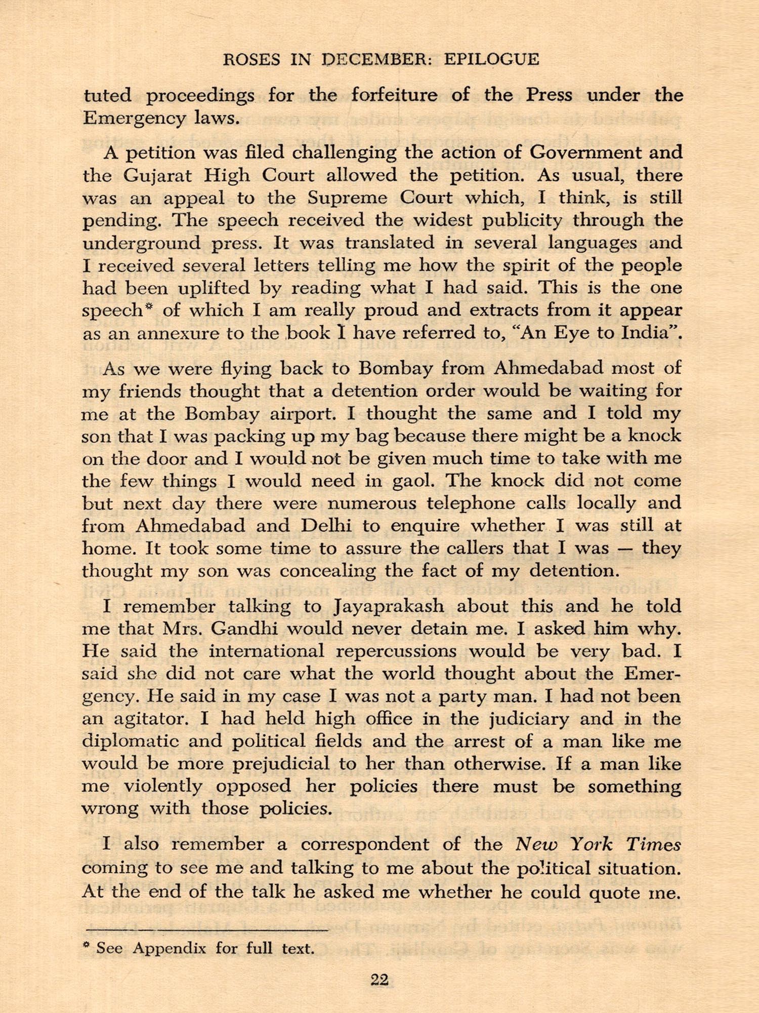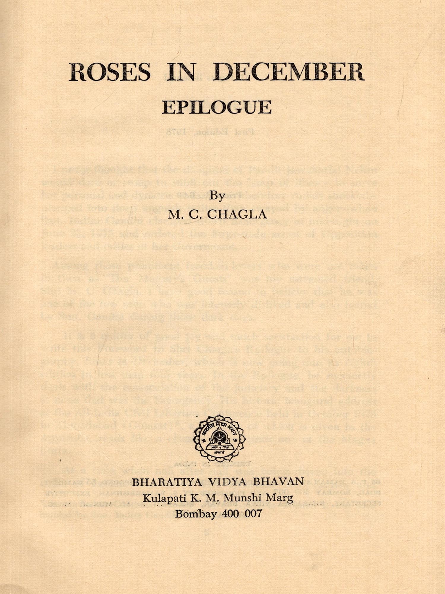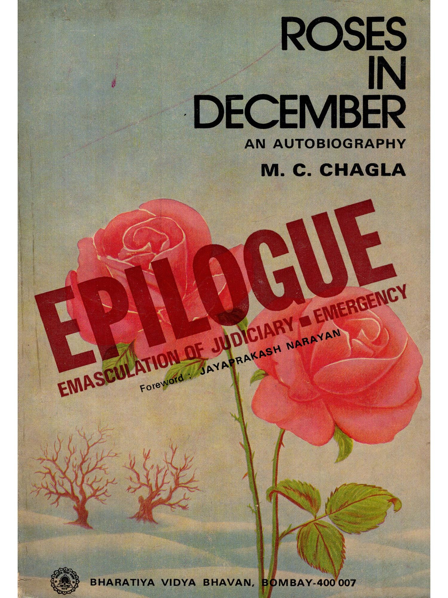 It is a matter of great joy and much satisfaction for me to write this Foreword to Shri Chagla's Epilogue to his autobiography, Roses in December, which is now going into its eighth edition in less than four years. In the Epilogue, he succinctly deals with the emasculation of the judiciary and the darkness at noon that was the Emergency. His historic inaugural address at the All-India Civil Liberties Conference held in October 1975 in Ahmedabad (Gujarat), a full text of which is given in the Appendix, reads like a classic and reminds one of the Magna Carta.
