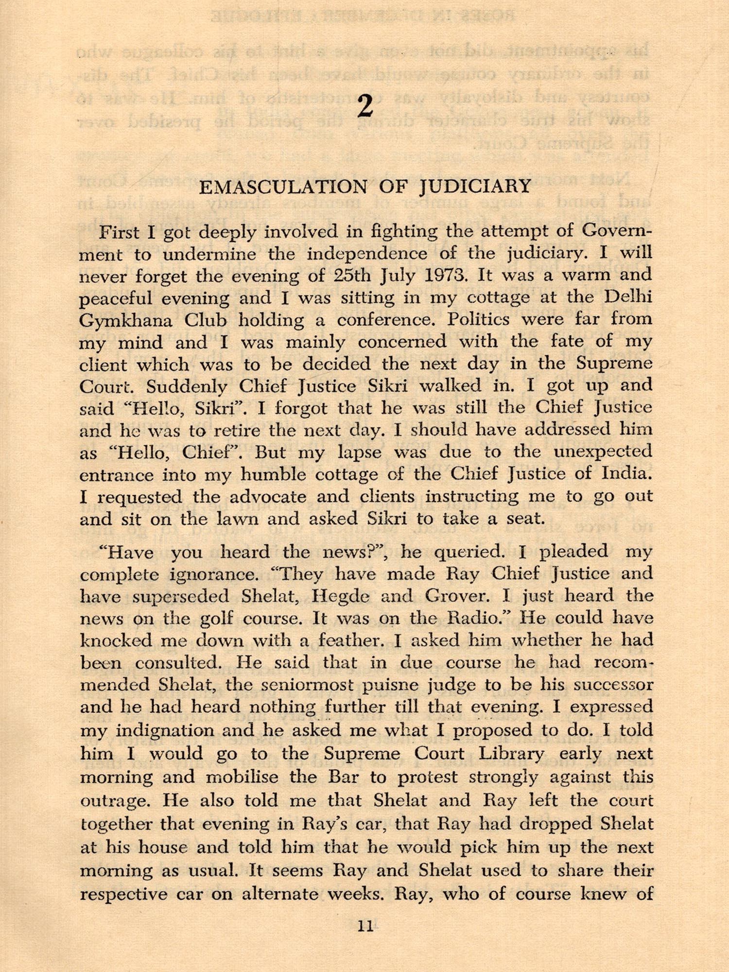 Shri Chagla's Epilogue makes poignant reading. Despite his physical age of 70 plus, Shri Chagla exhibited the youthful vigour of a full-blooded crusader during the crucial 20 months of Emergency. His observations on men like the then Chief Justice A. N. Ray and the then Attorney-General Niren De, not to speak of the then Law Minister H. R. Gokhale and others of his ilk are candid. He does not mince his words even though the persons happen to be his personal friends. I think this capacity and courage for forthright, detached criticism is a virtue Shri Chagla has acquired by his long years as a member of the judiciary. He says of Niren De: "It is true that the Attorney-General represents the Government but he owes a duty not only to his client but also to the Court. He has to guide the Court and see that it does not come to a wrong decision even if it is in favour of his client. But Niren De argued only from his brief and sometimes advanced the most preposterous pro-positions. Compare this with the role played by Setalvad as Attorney-General. The great reputation that the Supreme Court enjoyed before the advent of Ray was due as much to the ability of the Chief Justice as to the sterling independence of Setalvad who would never accept a proposition, even if it came from the Bench and was in favour of Government, if he thought that the proposition was unsustainable in law.