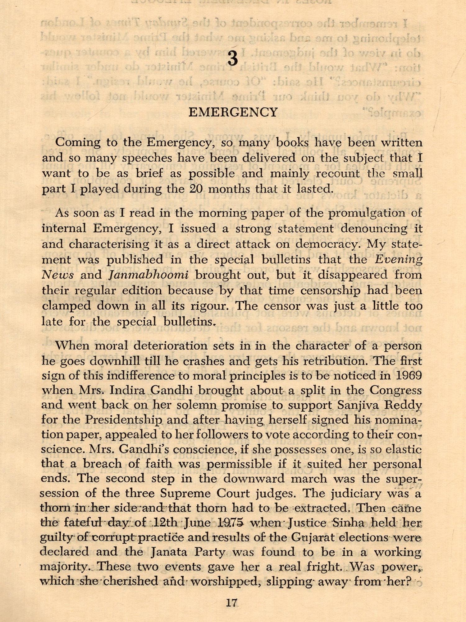 I never thought that the daughter of Pandit Jawaharlal Nehru would dare or stoop to snuff out the lamp of liberty to serve her personal and dynastic ends. I was therefore rudely shocked-plunged into deep anguish rather than swayed by anger-when Smt. Indira Gandhi clamped down Emergency at mid-night on June 25, 1975 and ordered the large-scale arrest of Opposition leaders and critics of her Government.