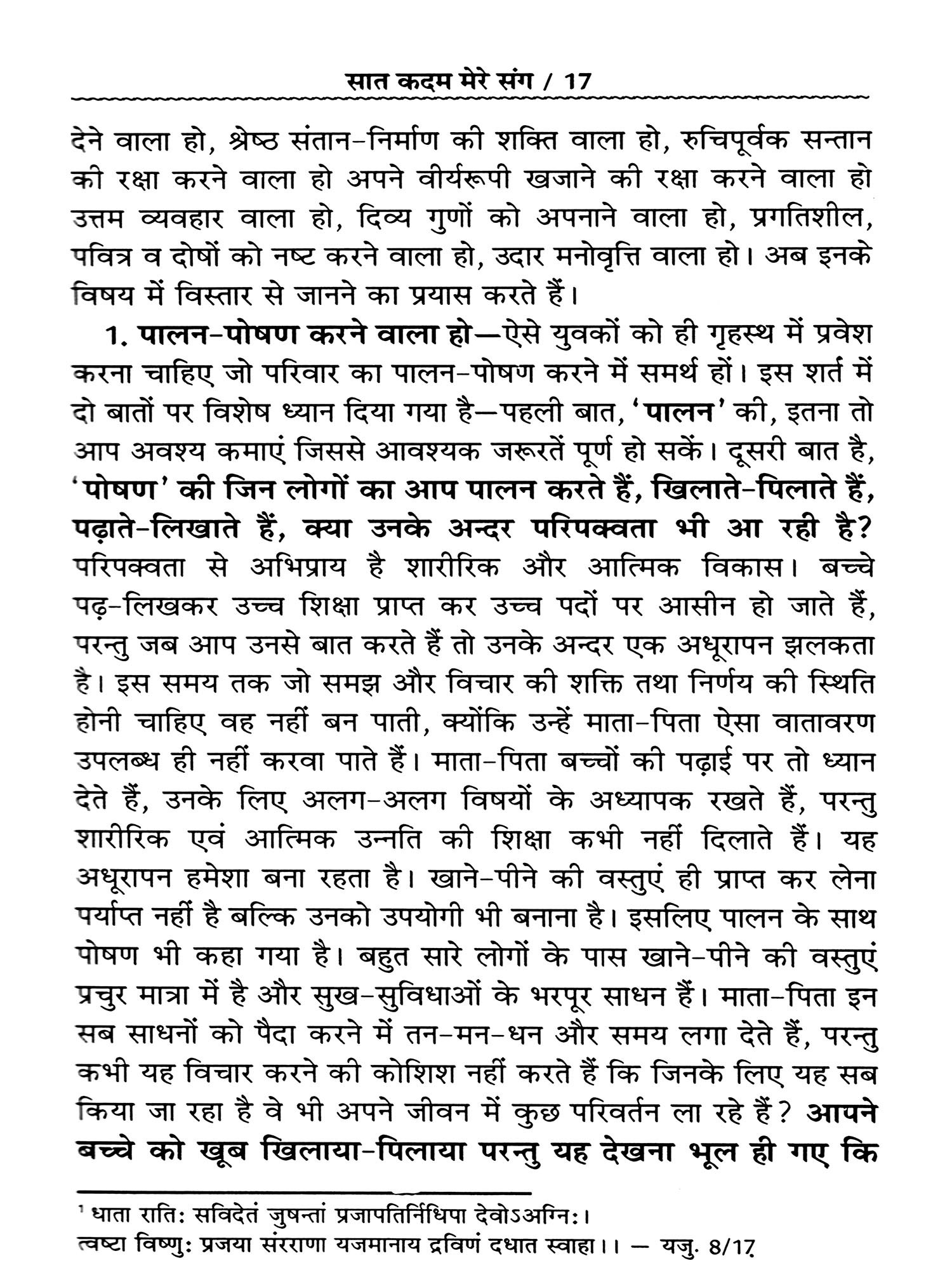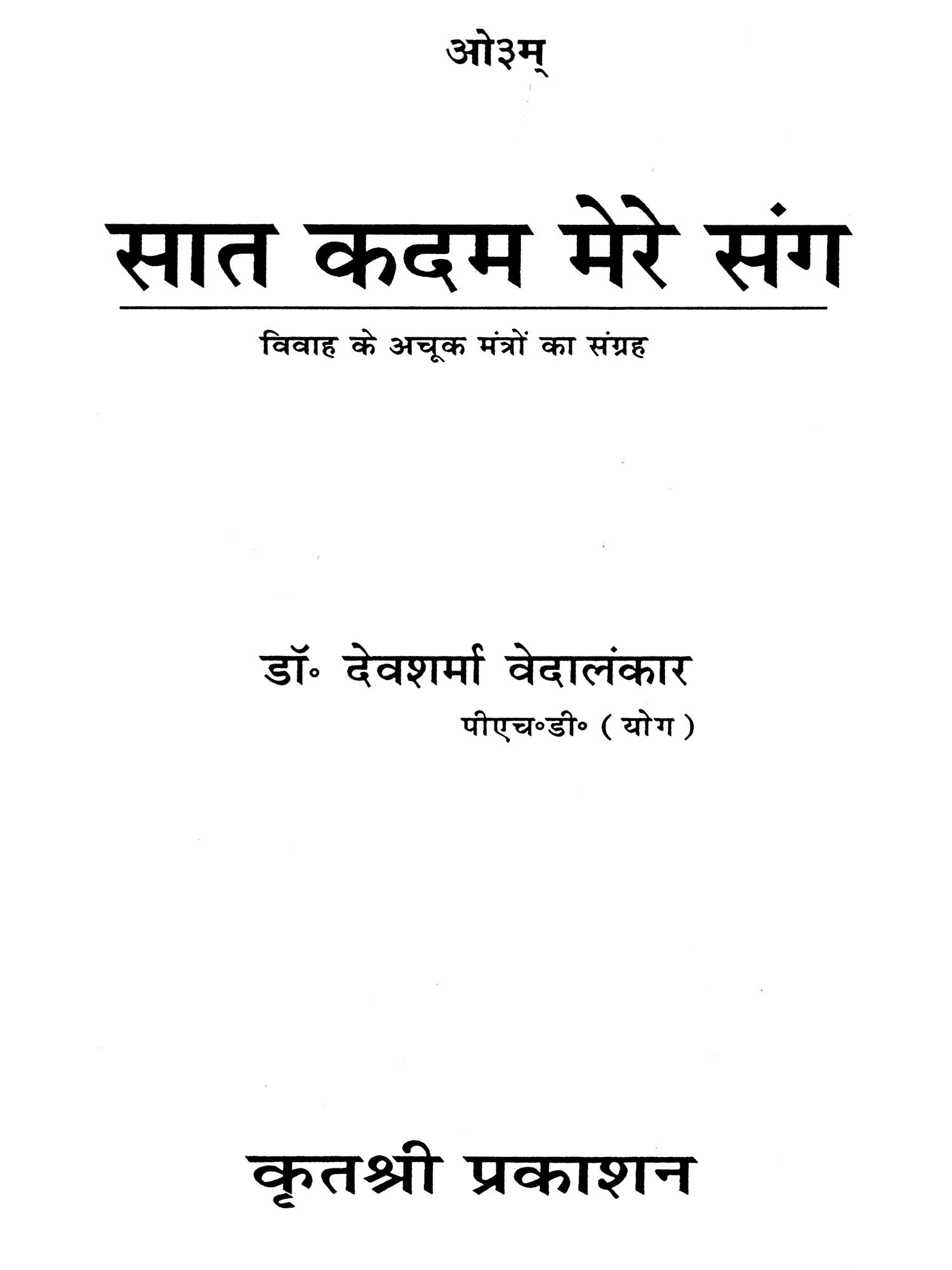 प्रस्तुत पुस्तक 'सात कदम मेरे संग' के नाम से ही परिलक्षित होता है, कि यह विवाह योग्य युवाओं के लिए लिखी गयी है। इस पुस्तक का मूल विषय यह है कि गृहस्थाश्रम में प्रवेश से पूर्व नवयुवक एवं नवयुवतियां क्या तैयारी करें ताकि वे इस आश्रम में आनन्दपूर्वक निर्वाह करते हुए प्रसाद स्वरूप सुसन्तान प्राप्त कर सकें। इसी को ध्यान में रखते हुए कि विवाह का प्रथम कदम वर-वधू का चुनाव एक बहुत ही कठिन कार्य होता है। एक वैज्ञानिक विधि का अनुसन्धान किया गया है इसके लिए डॉ. देवशर्मा वेदालंकार प्रशंसा के पात्र हैं जिनके अथक परिश्रम से यह सम्भव हो सका सुधी पाठको ! अब यह कठिन कार्य भी अति सरल हो गया। बस आपको इसकी जानकारी बच्चों तक पहुंचानी है।