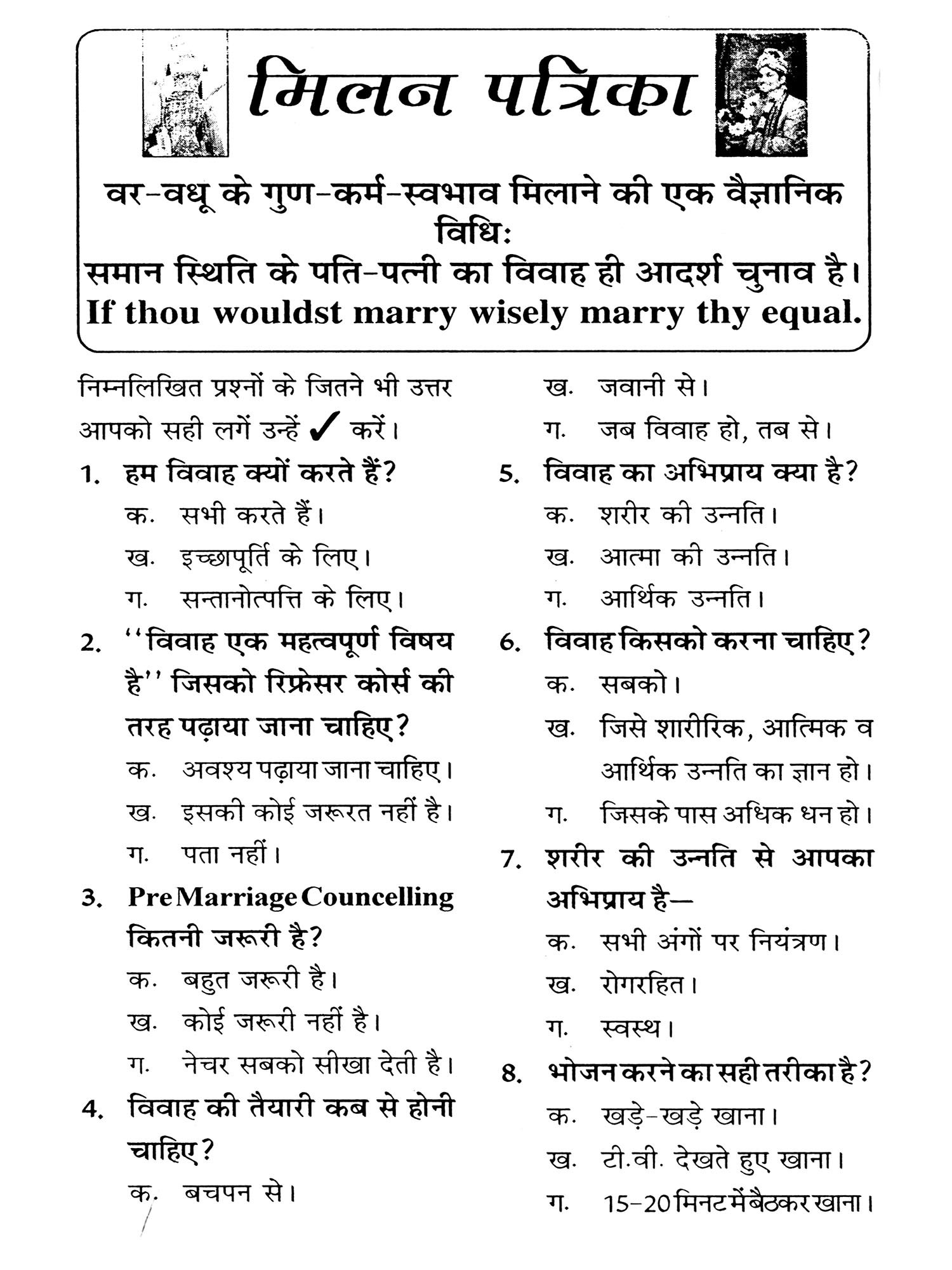 पुस्तक के साथ प्रश्नावली रूप में 'मिलन पत्रिका' संलग्न है जिसमें वर-वधू के गुण-कर्म-स्वभाव मिलाने की वैज्ञानिक विधि दी गई है।